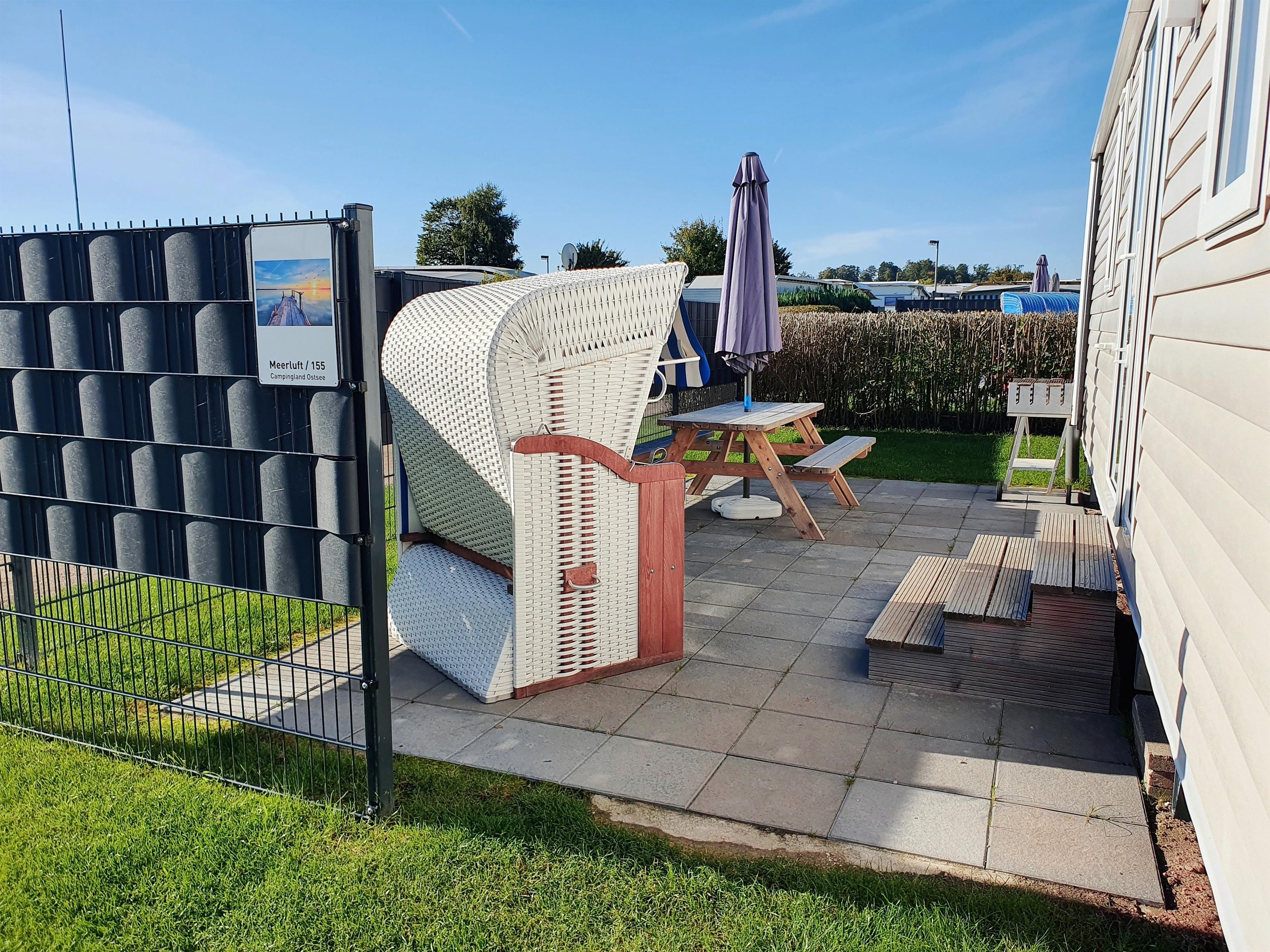 Modernes Mobilheim in Schashagen nahe Ostseestrand mit Garten, Terrasse und Strandkorb für entspannte Familienferien.