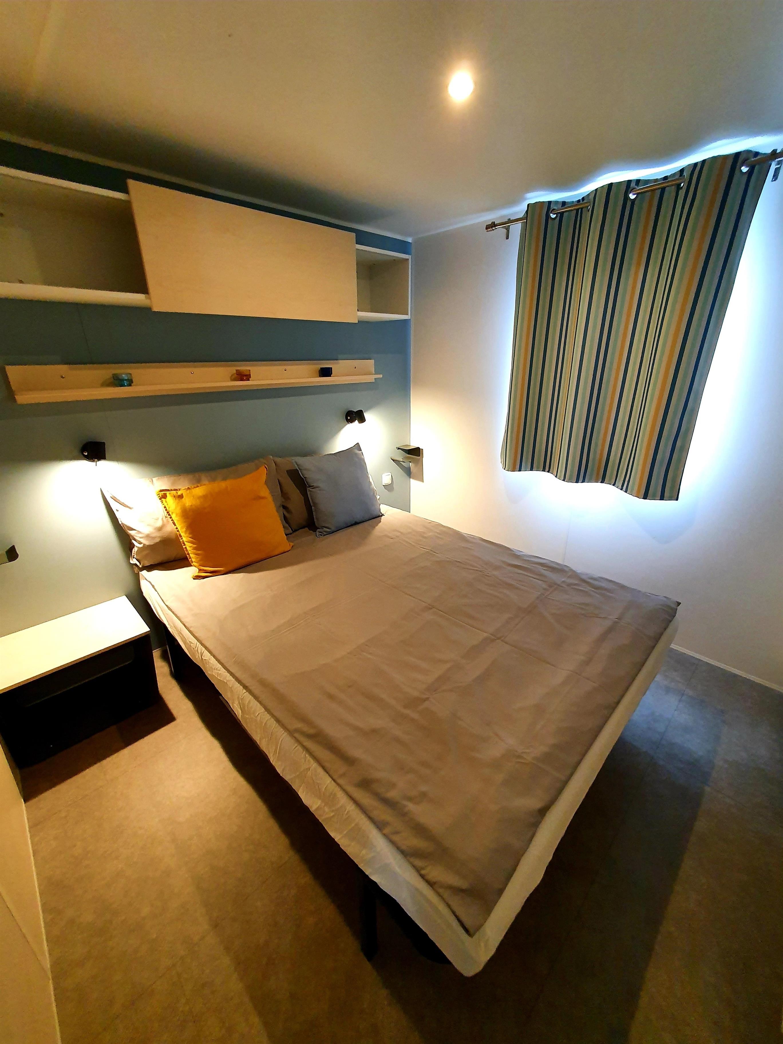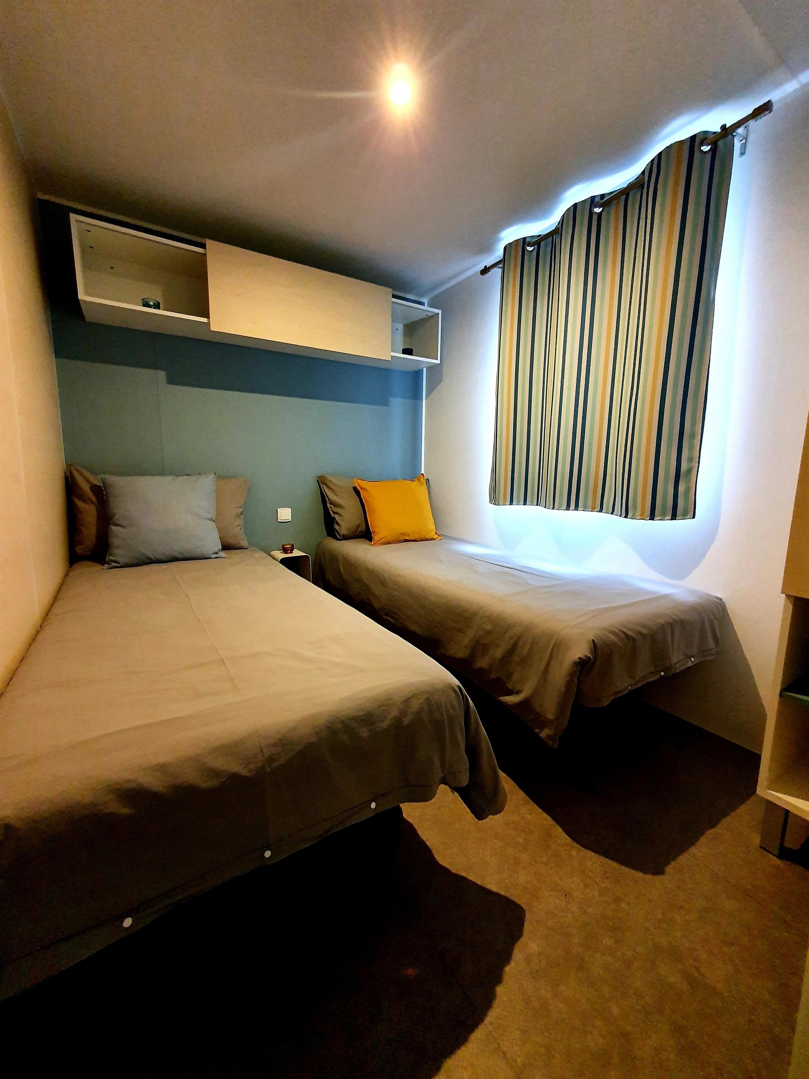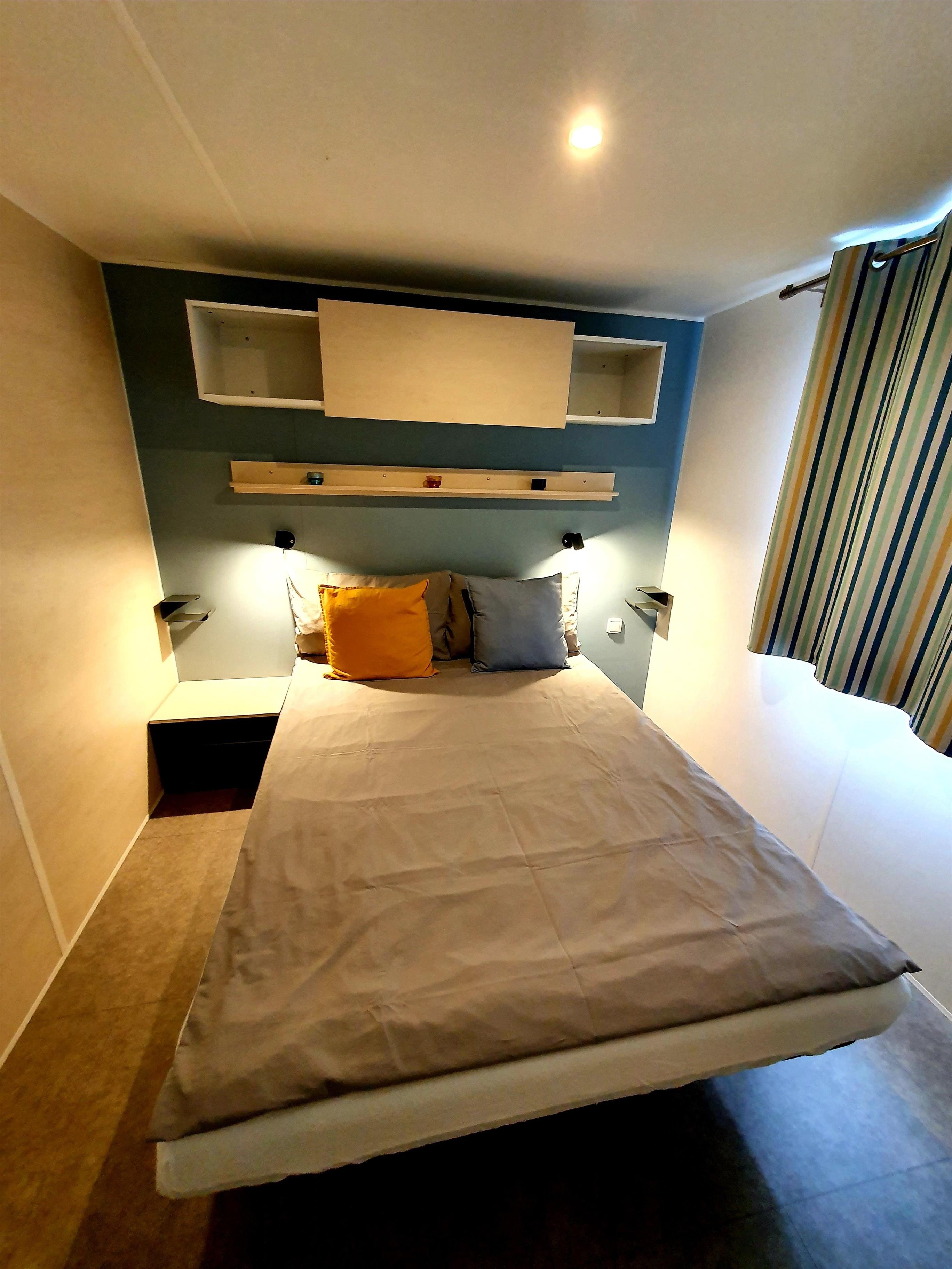 Unsere Mobilheime sind hell und modern ausgestattet und verfügen jeweils über einen kombinierten Wohn-/Essbereich mit integrierter Küchenzeile, 2-3 Schlafzimmern, 1-2 Bädern mit Dusche sowie 1-2 separaten WC. Eines der Bäder ist jeweils direkt von einem der Schlafzimmer aus zugänglich (en-suite). Auf der Terrasse stehen Ihnen ein eigener Strandkorb, ein Tisch mit Bänken und Sonnenschirm sowie ein Grill zur Verfügung. Ein kleiner Gartenbereich sorgt für weitere Entspannungsmöglichkeiten. Ihr Auto parken Sie direkt am Mobilheim.
