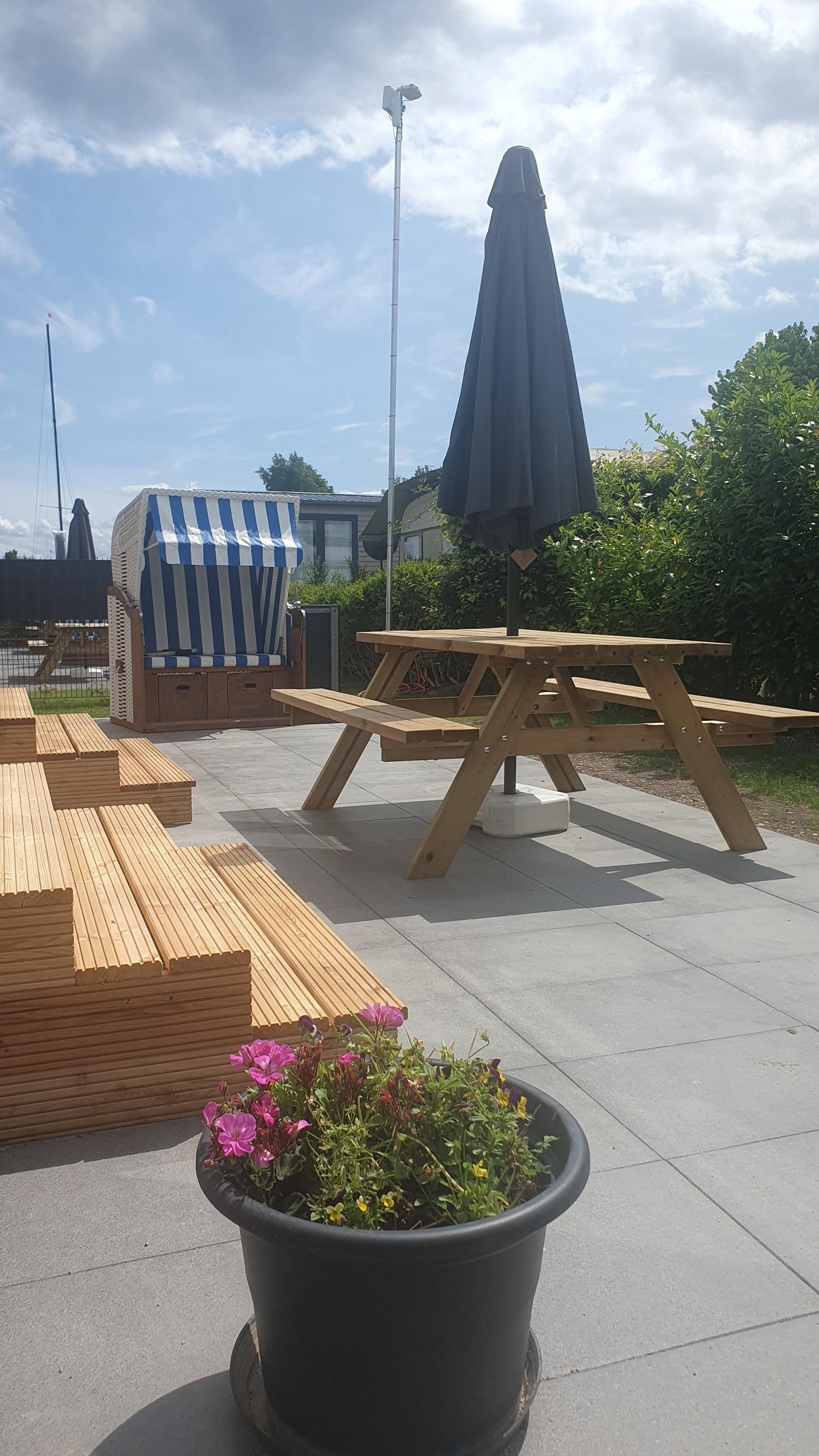 Unsere Mobilheime sind hell und modern ausgestattet und verfügen jeweils über einen kombinierten Wohn-/Essbereich mit integrierter Küchenzeile, 2-3 Schlafzimmern, 1-2 Bädern mit Dusche sowie 1-2 separaten WC. Eines der Bäder ist jeweils direkt von einem der Schlafzimmer aus zugänglich (en-suite). Auf der Terrasse stehen Ihnen ein eigener Strandkorb, ein Tisch mit Bänken und Sonnenschirm sowie ein Grill zur Verfügung. Ein kleiner Gartenbereich sorgt für weitere Entspannungsmöglichkeiten. Ihr Auto parken Sie direkt am Mobilheim.