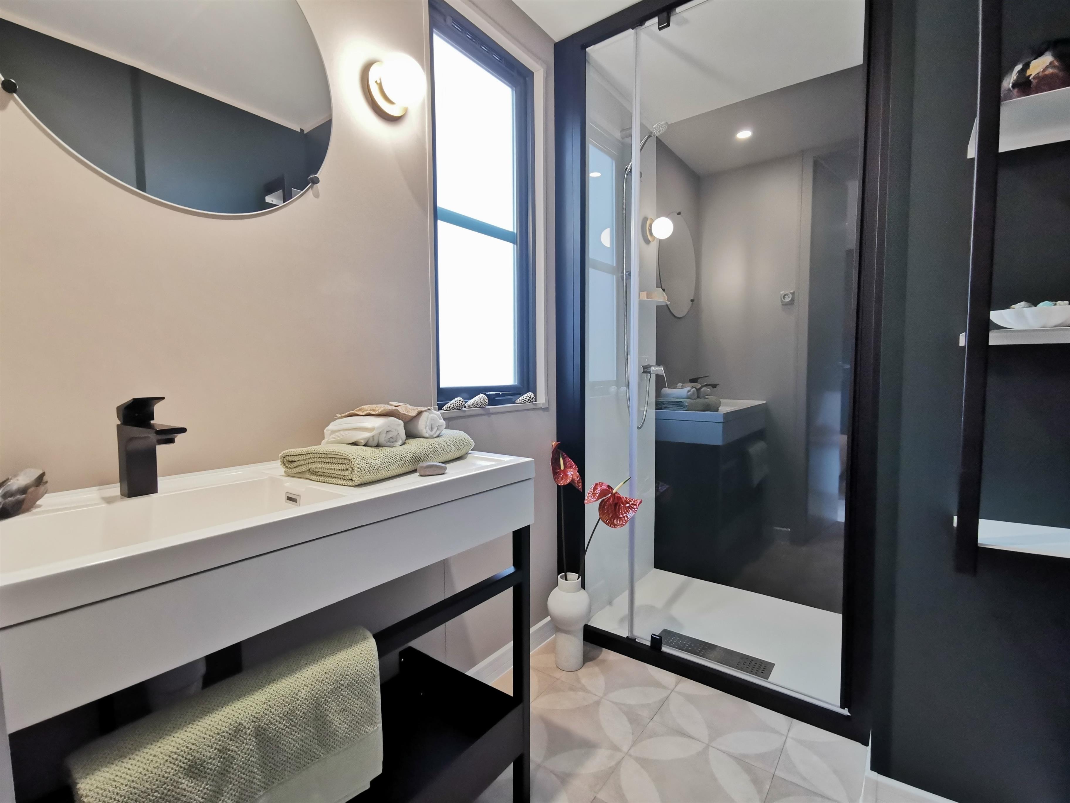 Die Dusche mit Waschtisch ist von der separaten Toilette getrennt.