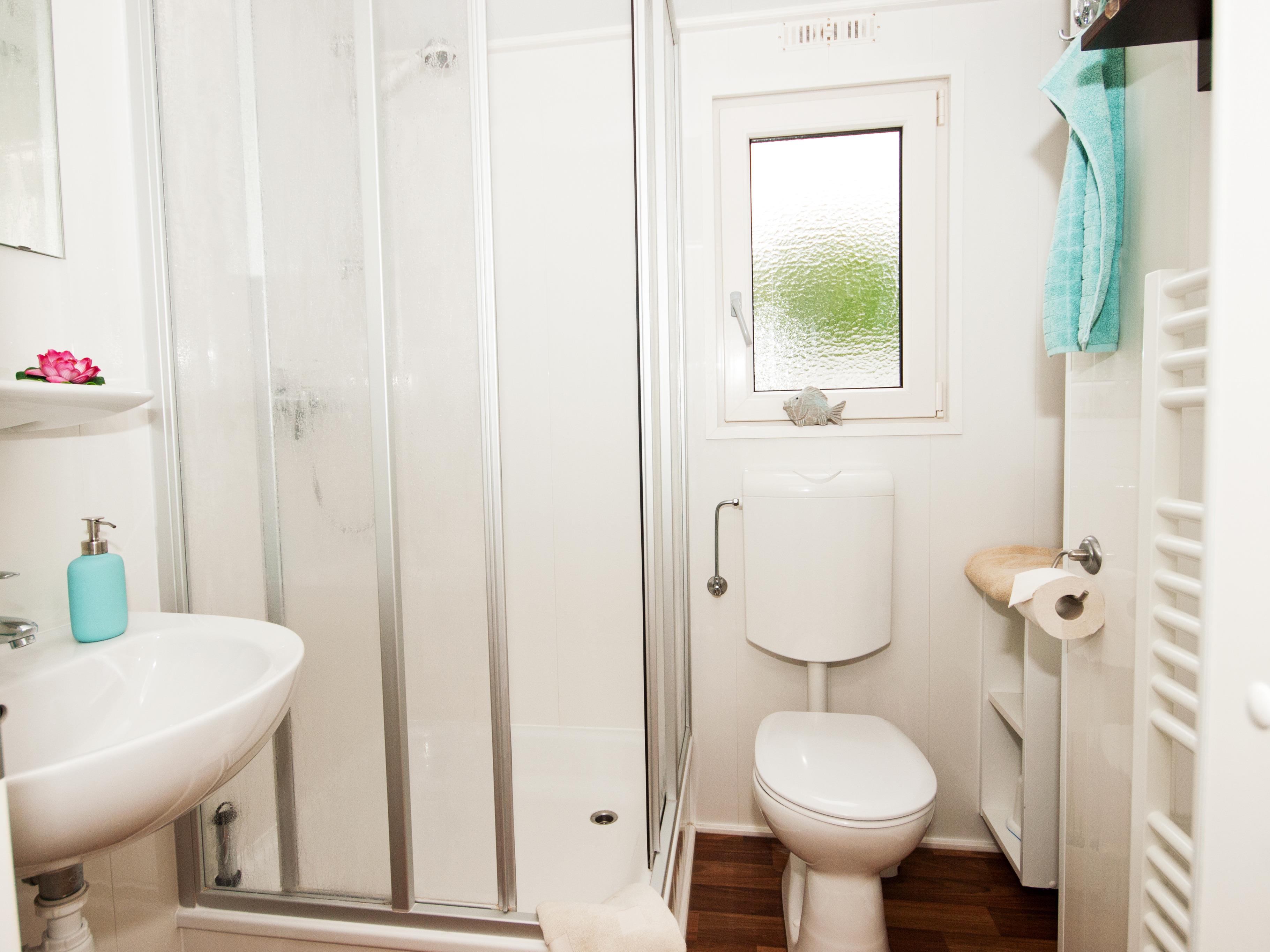 Im Bad befindet sich neben Dusche, Waschtisch und WC eine Handtuchheizung.