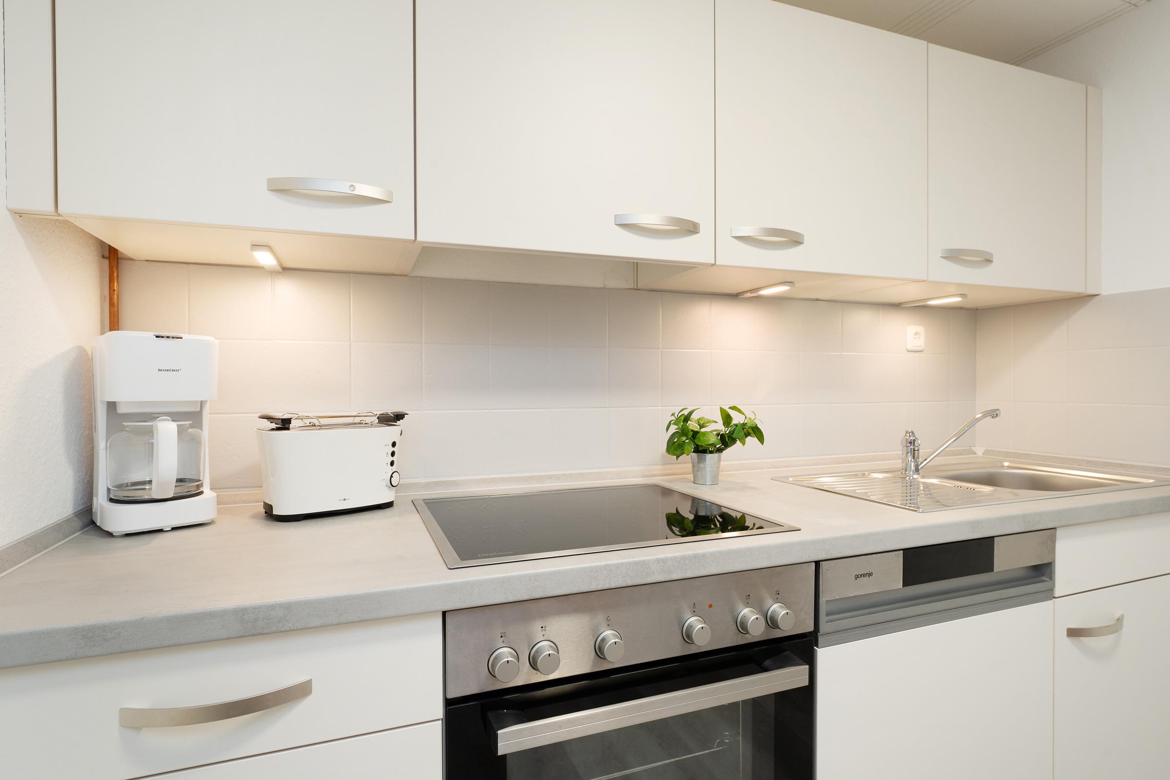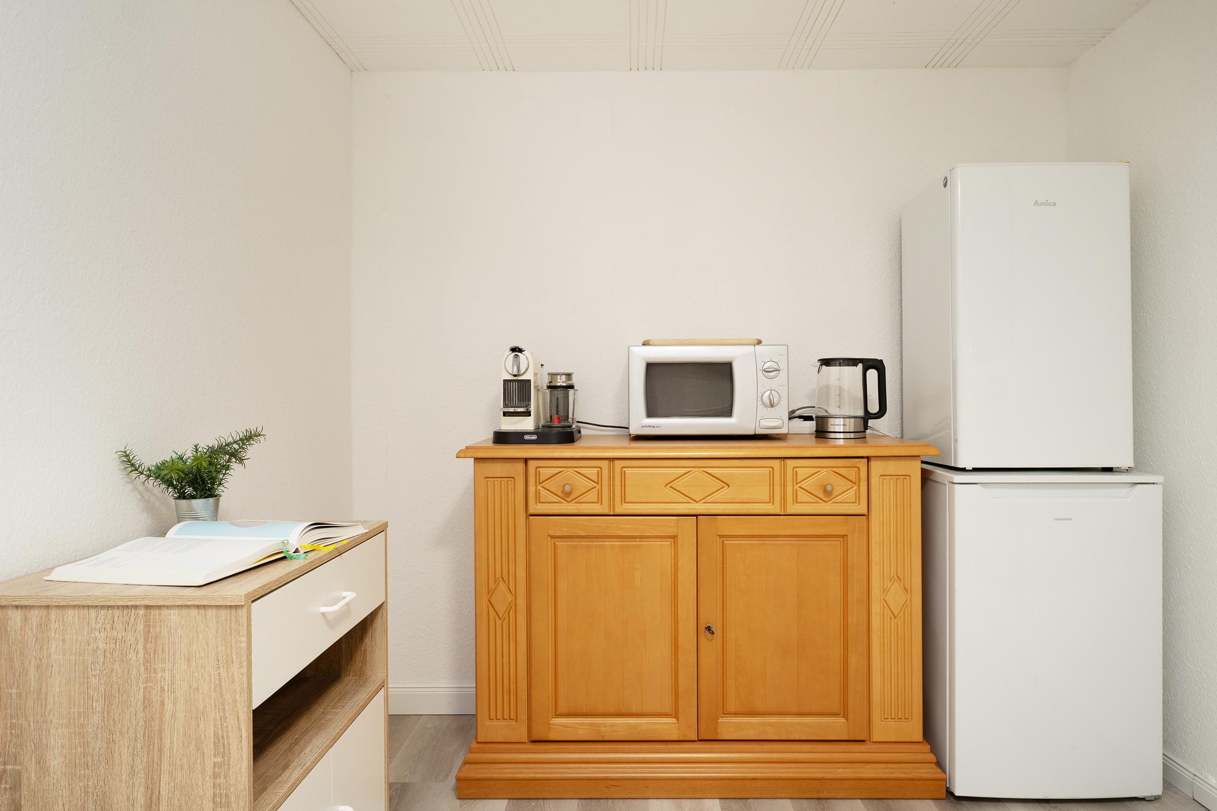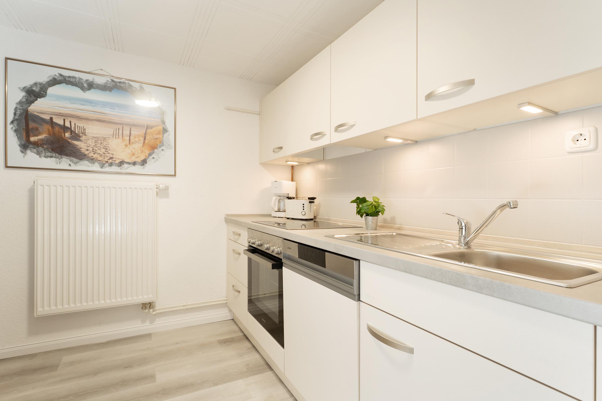 Das kleine Küstennest empfängt Sie mit einem kombinierten Wohn- und Schlafbereich, der mit einem bequemen Sofa, einem TV-Gerät sowie einer liebevoll eingerichteten Sitzecke ausgestattet ist – ideal für entspannte Urlaubsstunden. Die Terrasse mit eigenem Strandkorb lädt zum Verweilen an der frischen Luft ein. Die separate Küche ist umfassend ausgestattet mit Cerankochfeld (4 Felder), Backofen, Geschirrspüler, Kühlschrank mit Gefrierfach, Mikrowelle, Kapselmaschine (Nespresso), Eierkocher und Toaster – hier können Sie nach Herzenslust Ihre Urlaubsspeisen zubereiten. Der angrenzende Essbereich bietet Platz für gemeinsame Mahlzeiten.