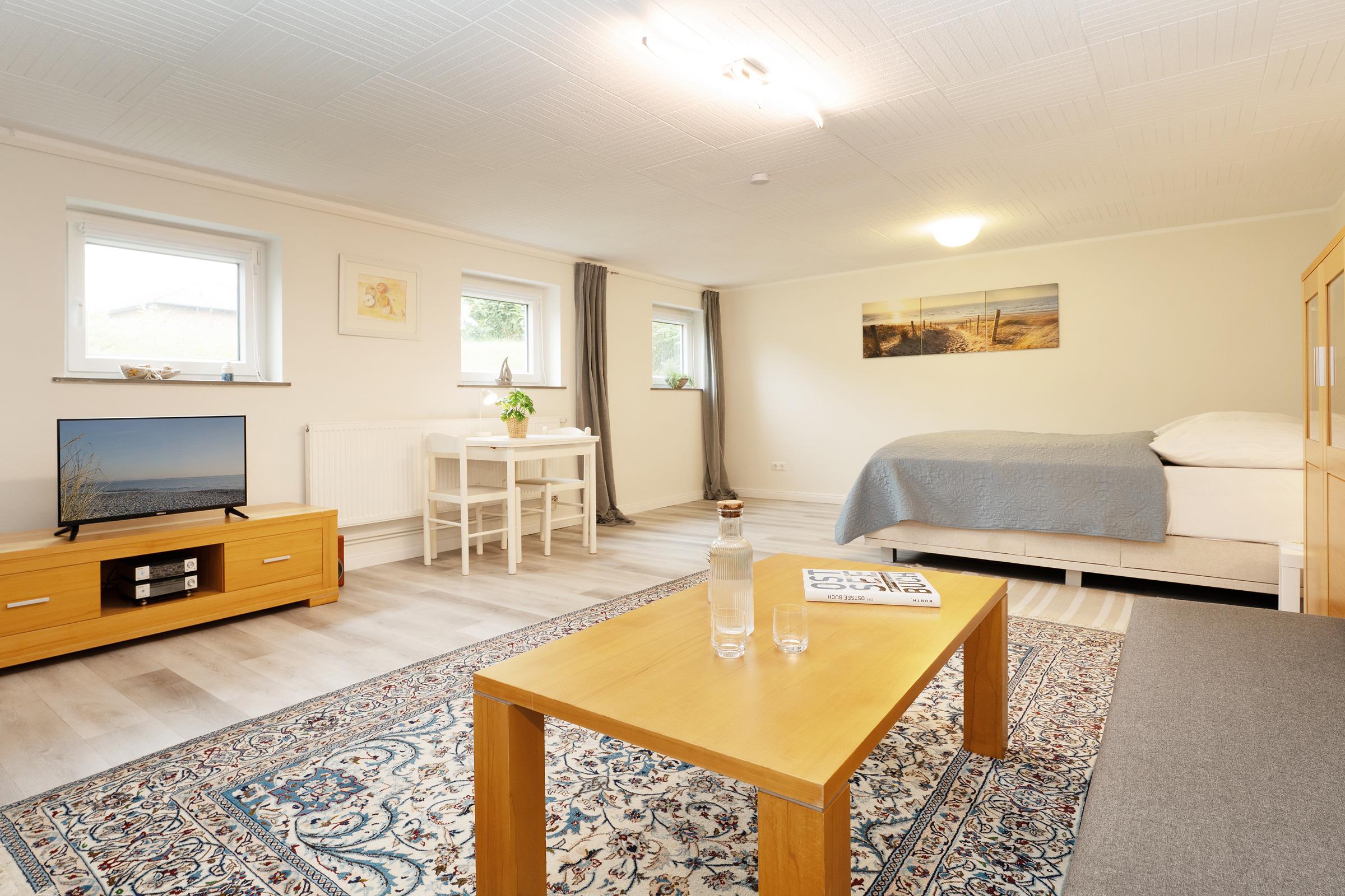 Großzügige 1-Zimmer-Souterrain-Ferienwohnung für bis zu zwei Personen in Schashagen-Beusloe mit 57 m² Wohnfläche und großer Terrasse mit herrlichem Blick ins Grüne.
