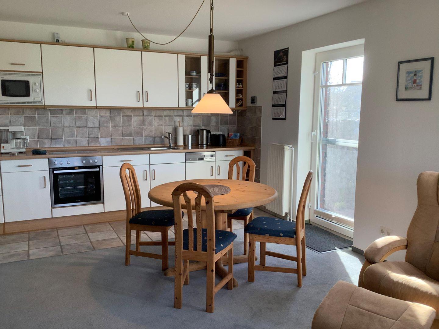 Der großzügige Wohnbereich ist mit einer Couchgarnitur, einem Sessel und einem Fernsehsessel mit Hocker eingerichtet. Hier können Sie den Ausblick über die angrenzenden Felder genießen und gemütliche Stunden vorm Kamin verbringen. Auch Sat-TV, eine HiFi-Anlage und freies WLAN sind vorhanden.
