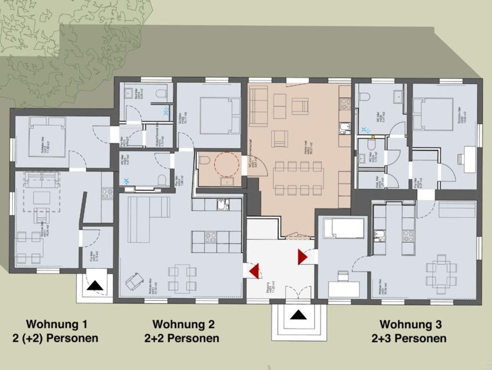 Zwischen den drei Gebäuden findet sich jede Menge Platz zum Spielen, Rumtoben, das entspannte Frühstück unter freiem Himmel oder den gemütlichen Lesenachmittag. Die Lage abseits des Durchgangsverkehrs bewirkt, dass es hier unglaublich still ist und auch kleine Kinder gefahrlos umhertollen können. Direkt neben dem Grundstück befinden sich ein großer Kinderspielplatz sowie die 600qm große Festscheune der Gemeinde, die sehr gut für Feste und Events genutzt werden kann.