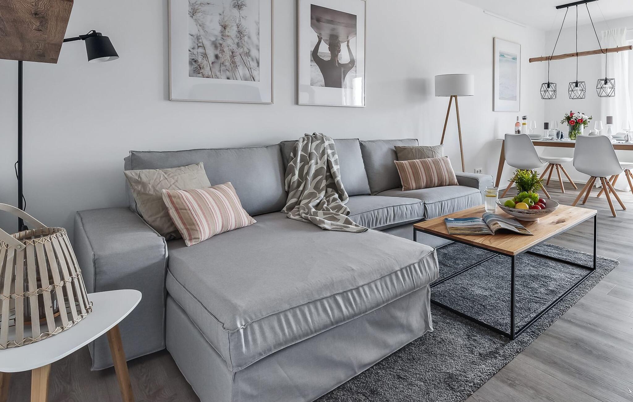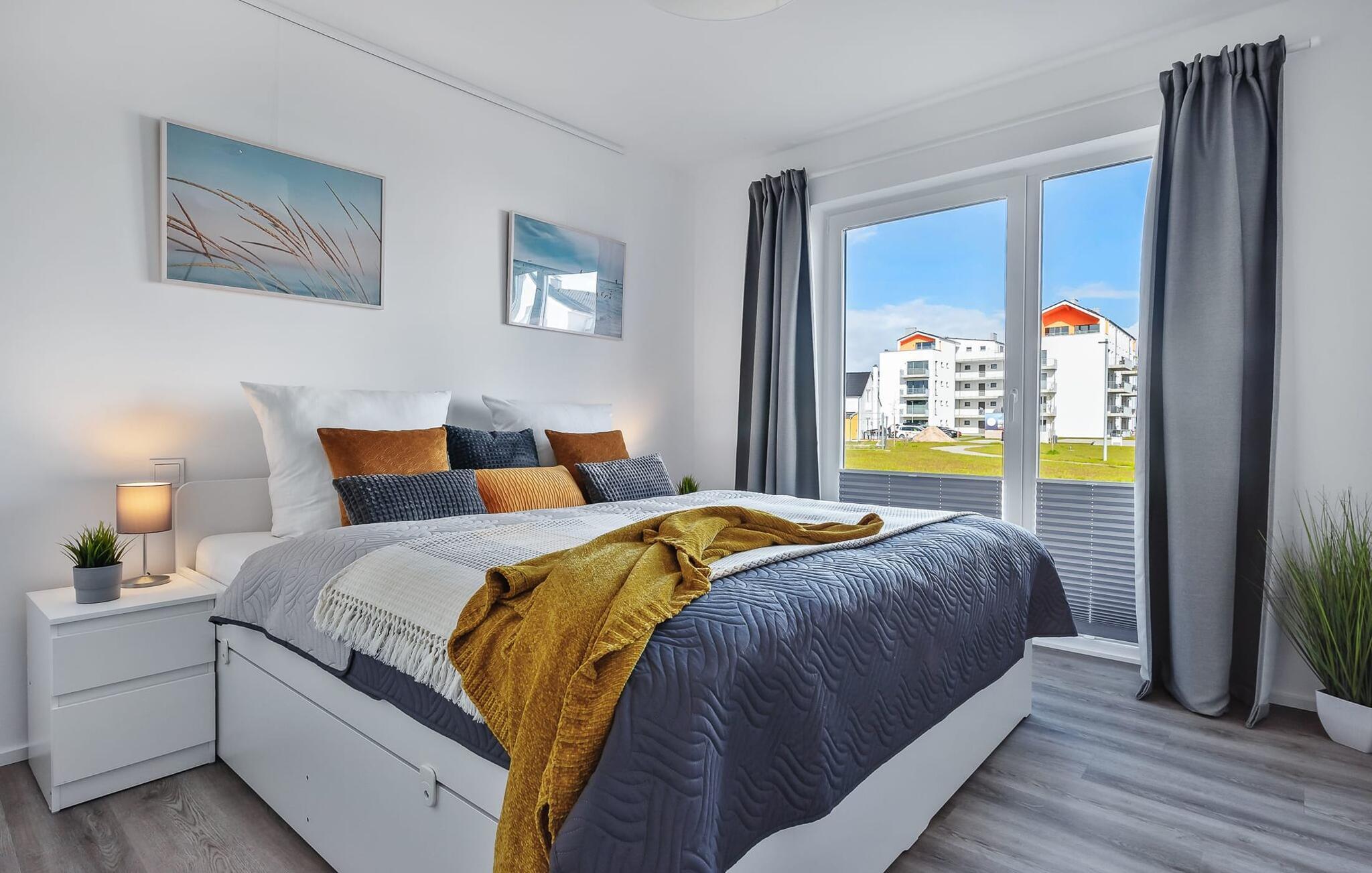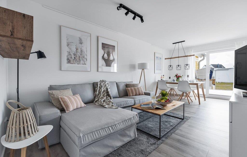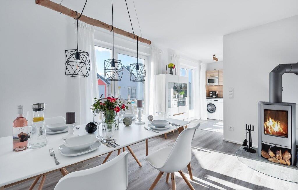 Mit moderner, nordischer Einrichtung empfängt euch der großzügige und helle Wohn-/Essbereich, aus dem man dank der bodentiefen Fensterfront sogar einen Blick auf das bunte Treiben des Hafens erhaschen kann. Offen, hell und freundlich gestaltet bietet die Wohnung die perfekte Ausgangslage für einige urlaubstypische Freizeitaktivitäten. Lasst es euch z.B. auf dem gemütlichen Sofa gutgehen, schaltet eure Lieblingsserie ein oder hört einfach nur dem prasselenden Feuer des Kamins zu.