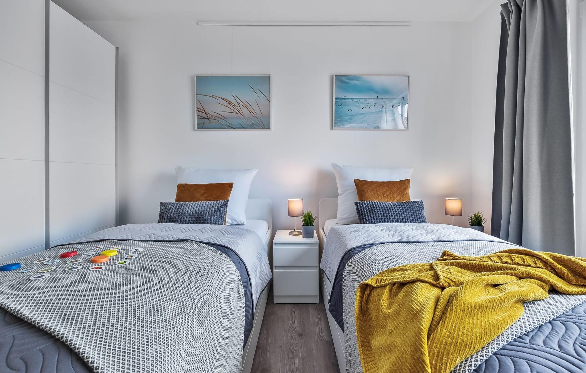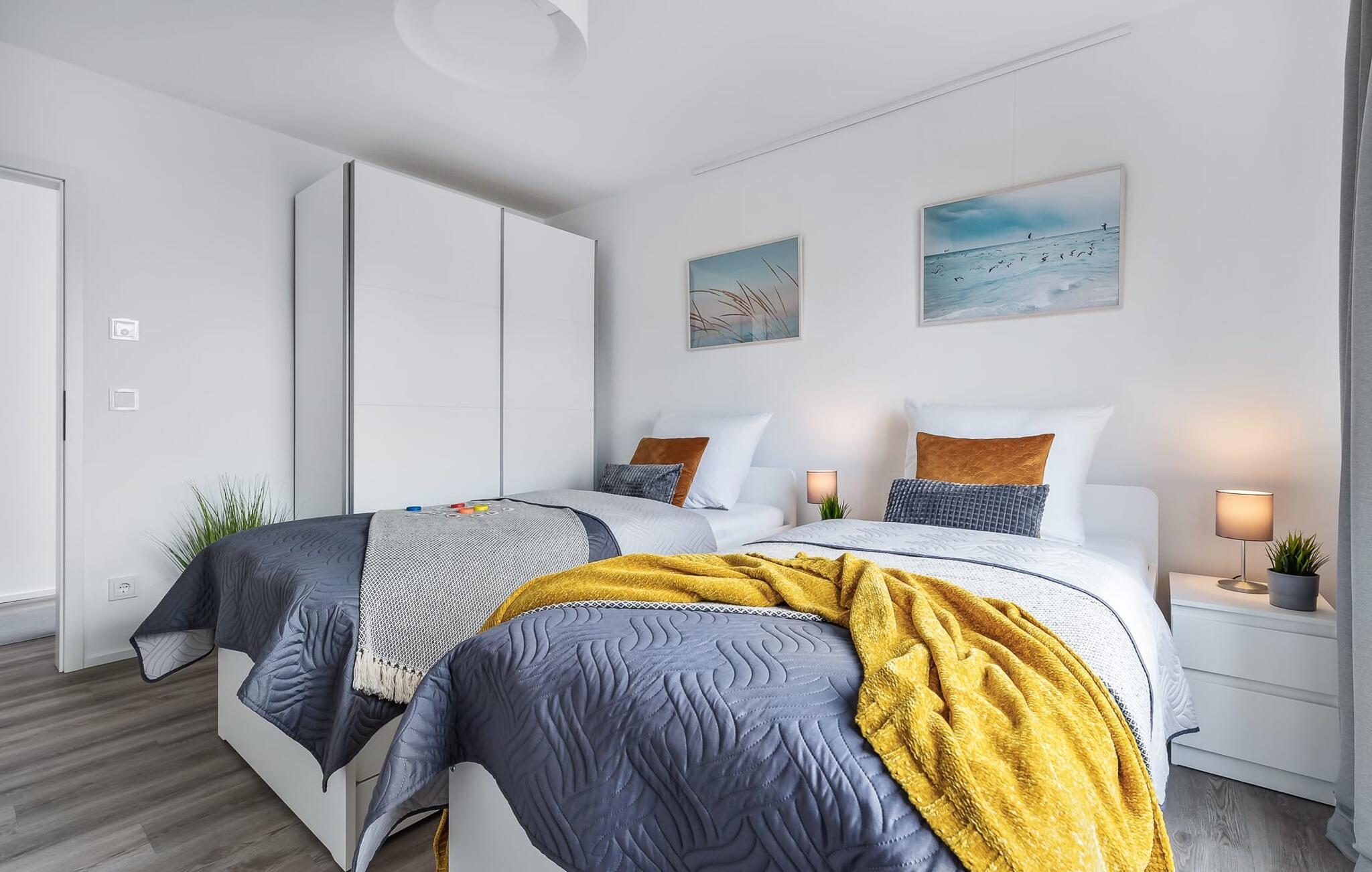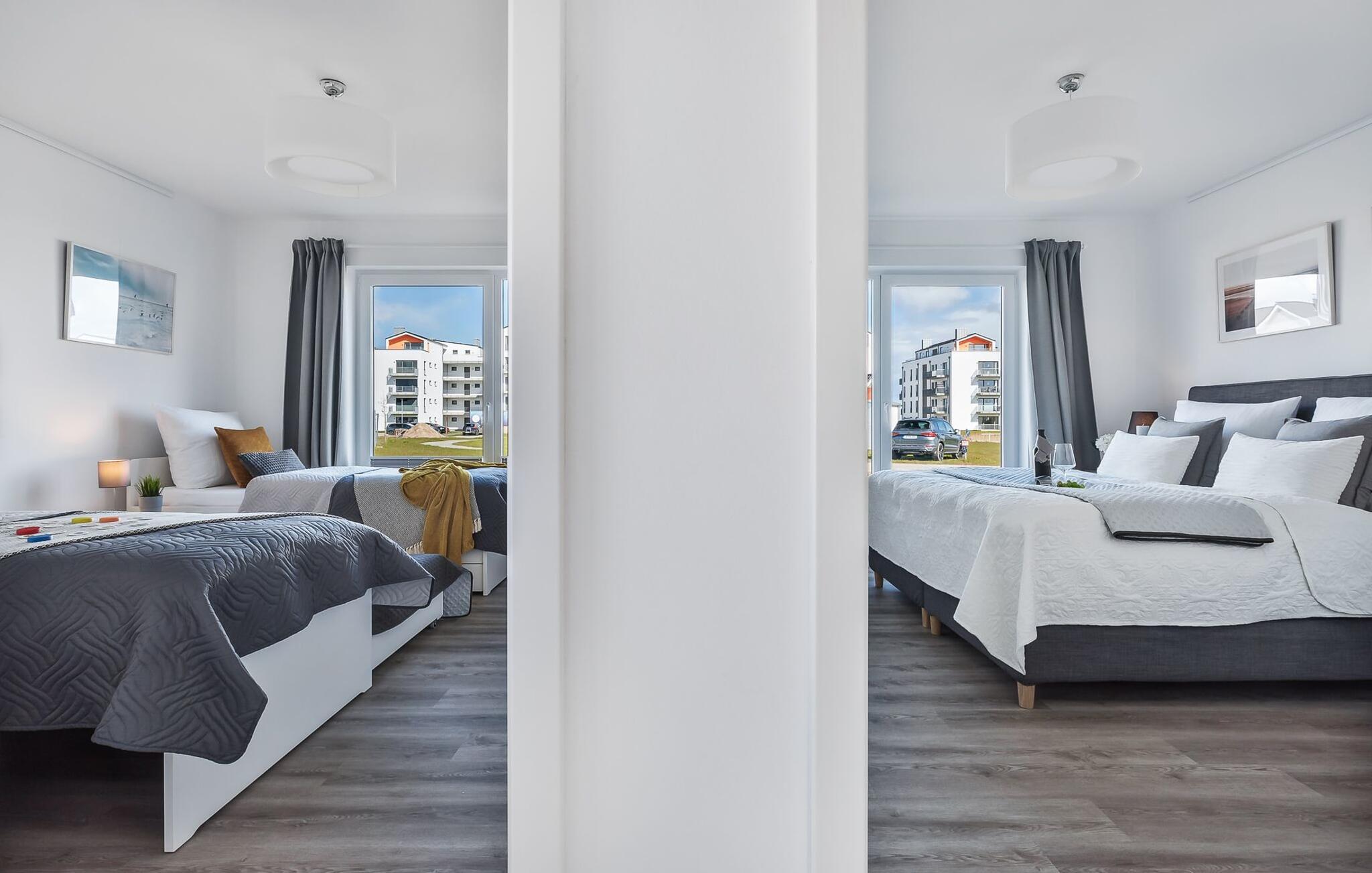 Für die nächtliche Erholung stehen zwei ebenfalls hochwertig eingerichtete Schlafzimmer mit bodentiefen Fenstern zur Auswahl. Das Hauptschlafzimmer ist mit einem bequemen Doppel-Boxspringbett ausgestattet. Das zweite Schlafzimmer verfügt über zwei Einzelbetten, wovon sich eines ganz einfach zu einer weiteren Schlafmöglichkeit ausziehen lässt.
