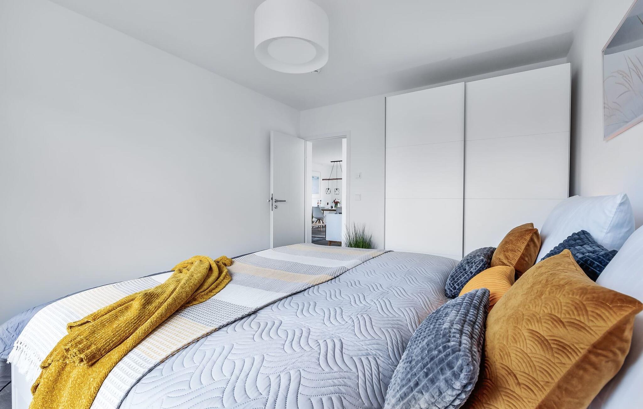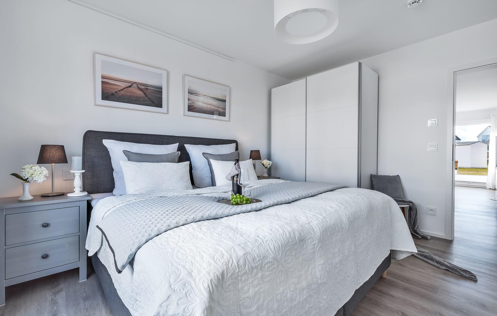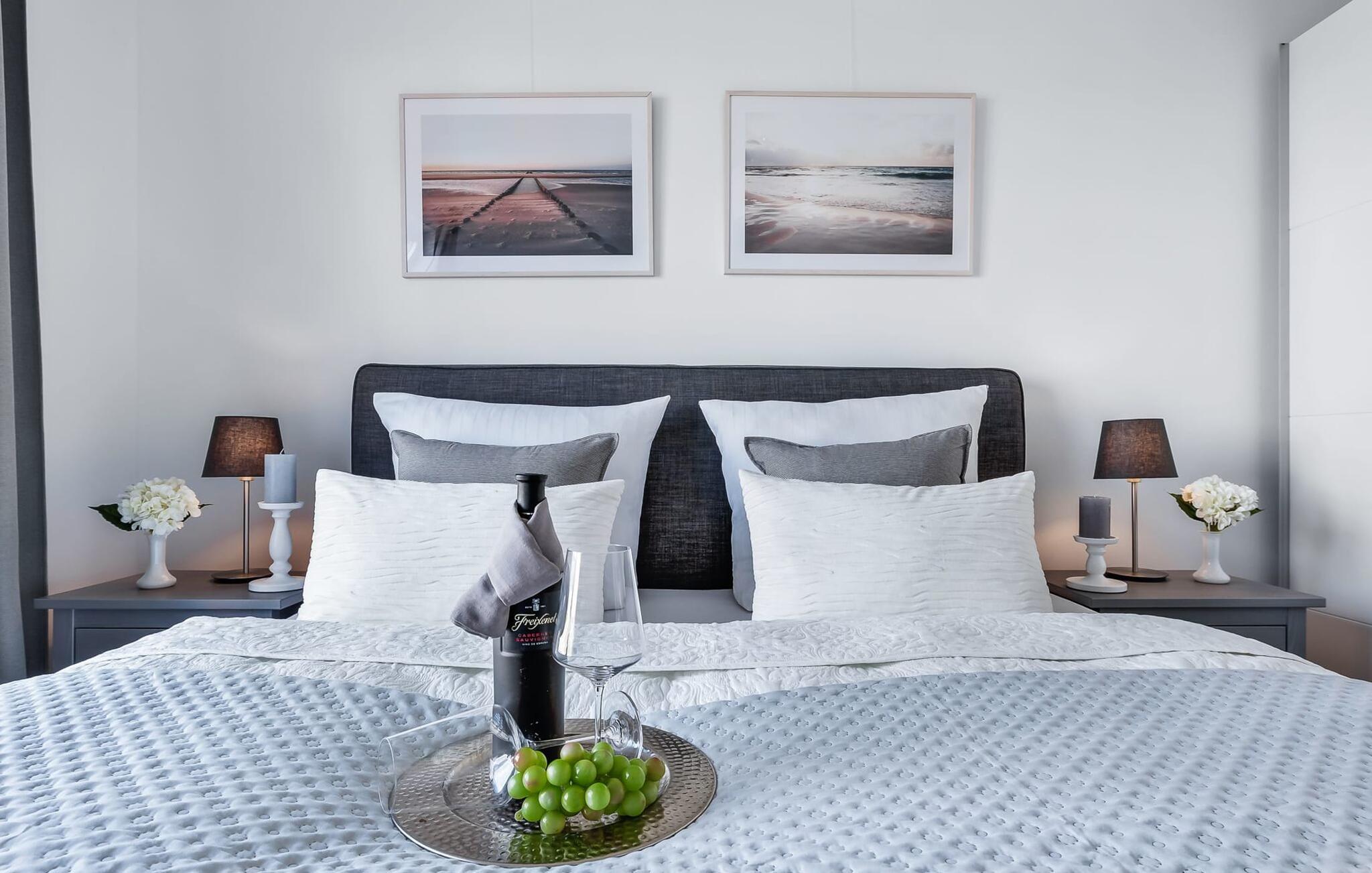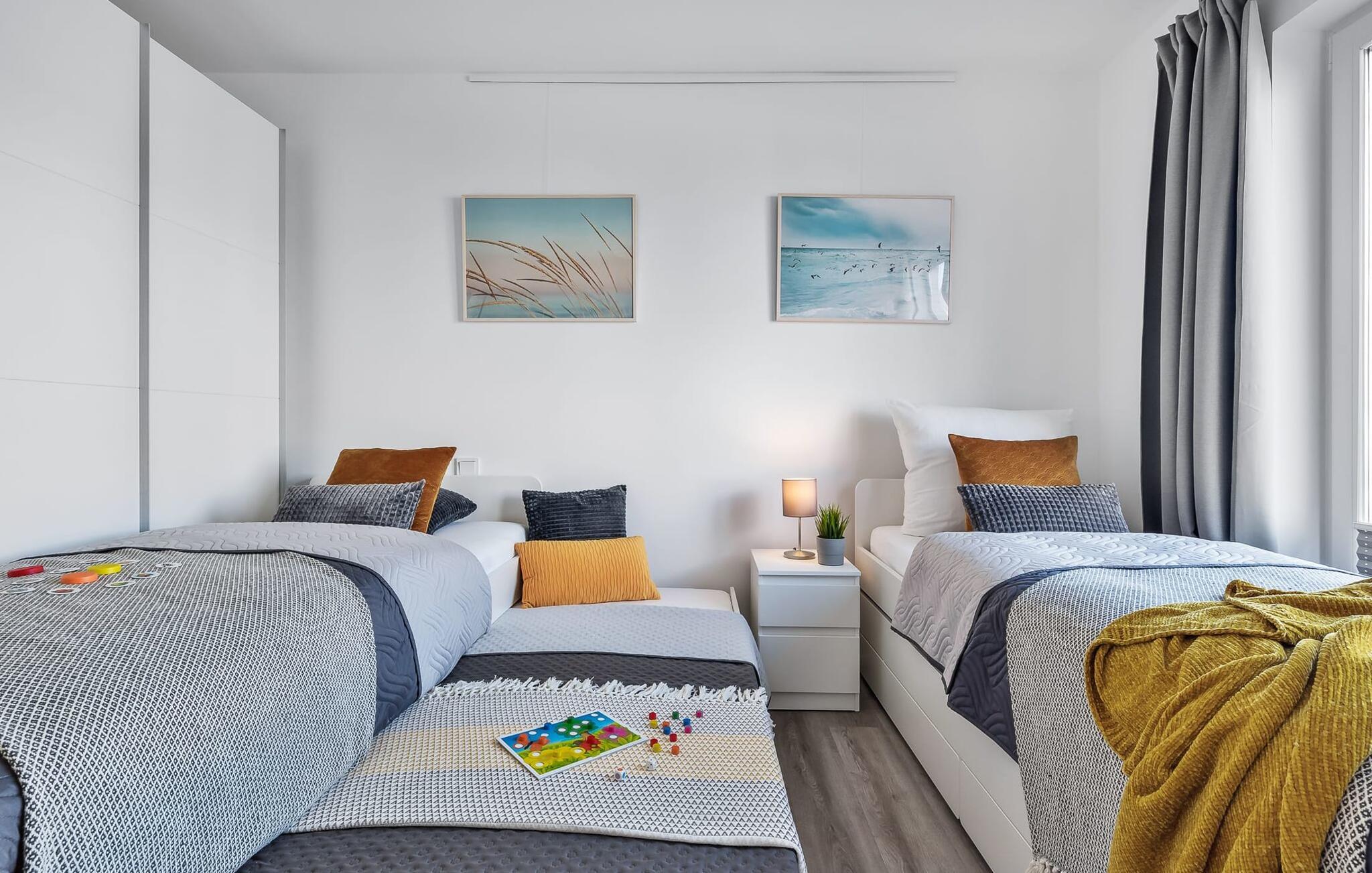 Für die nächtliche Erholung stehen zwei ebenfalls hochwertig eingerichtete Schlafzimmer mit bodentiefen Fenstern zur Auswahl. Das Hauptschlafzimmer ist mit einem bequemen Doppel-Boxspringbett ausgestattet. Das zweite Schlafzimmer verfügt über zwei Einzelbetten, wovon sich eines ganz einfach zu einer weiteren Schlafmöglichkeit ausziehen lässt.
