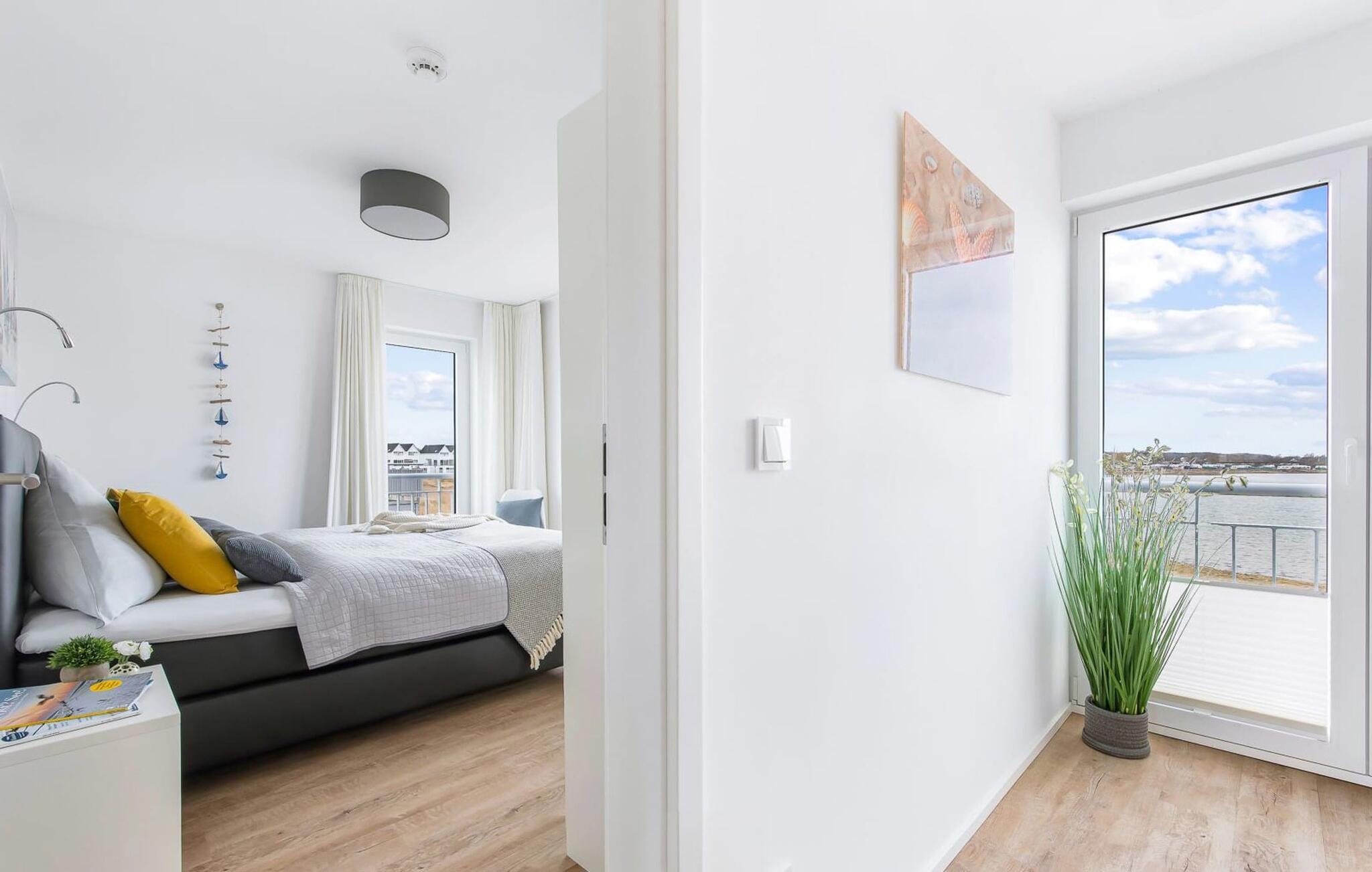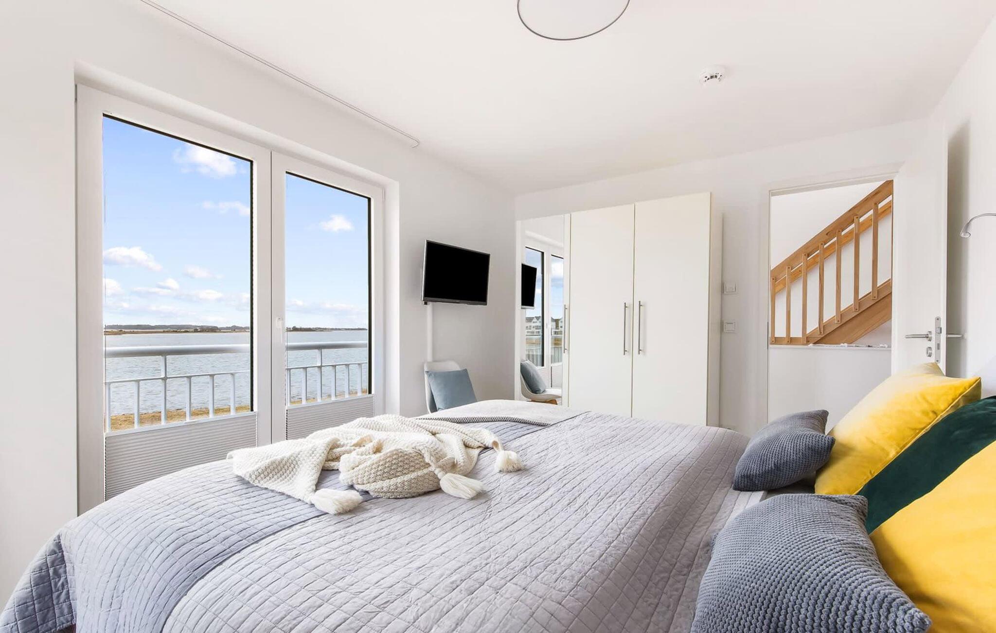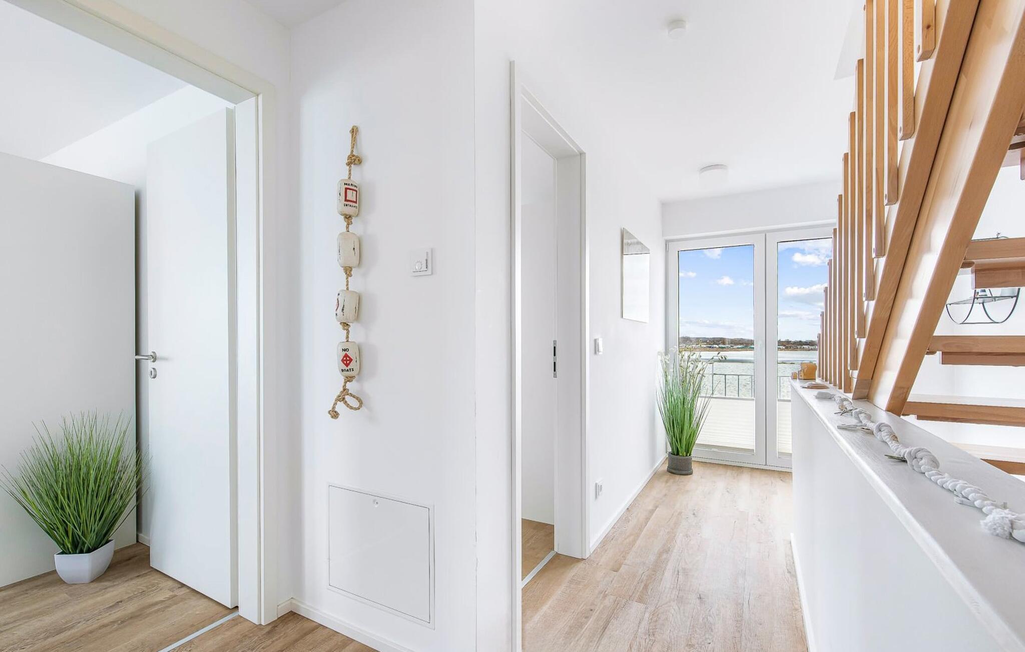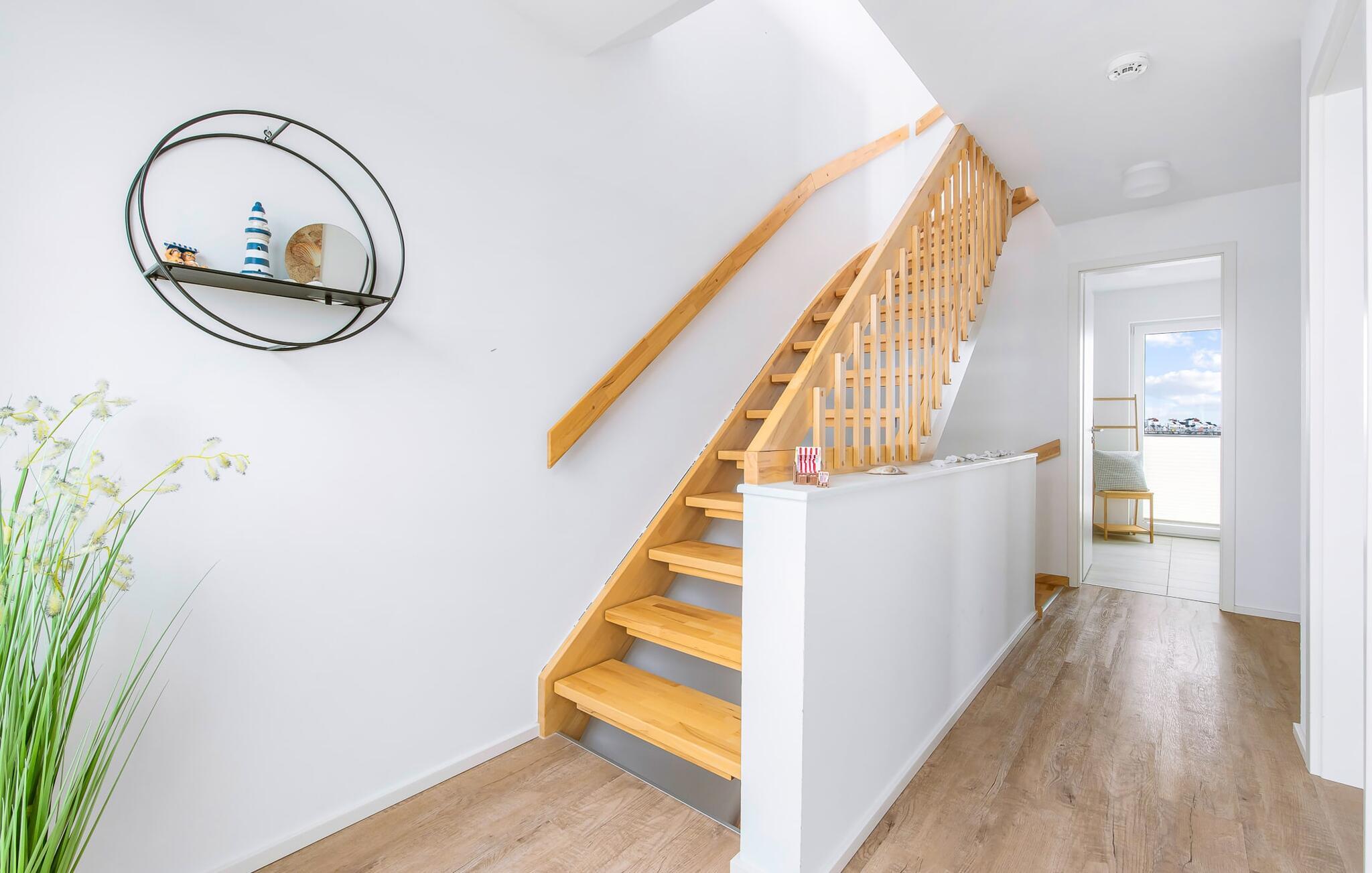 Im ersten Obergeschoss befindet sich der Ruhebereich. Hier bieten zwei Schlafzimmer ausreichend Platz zum Energietanken. Im Hauptschlafzimmer mit direktem Schleiblick ist Aufwachen und Einschlafen vor Traum-Kulisse angesagt. Ein weiteres Schlafzimmer ermöglicht den Blick über die Straße auf den Segel- und Sportboothafen des OstseeResorts. Ebenfalls auf dieser Ebene befindet sich ein Vollbad mit Dusche und Relax-Whirlwanne für das private Wellness Programm.