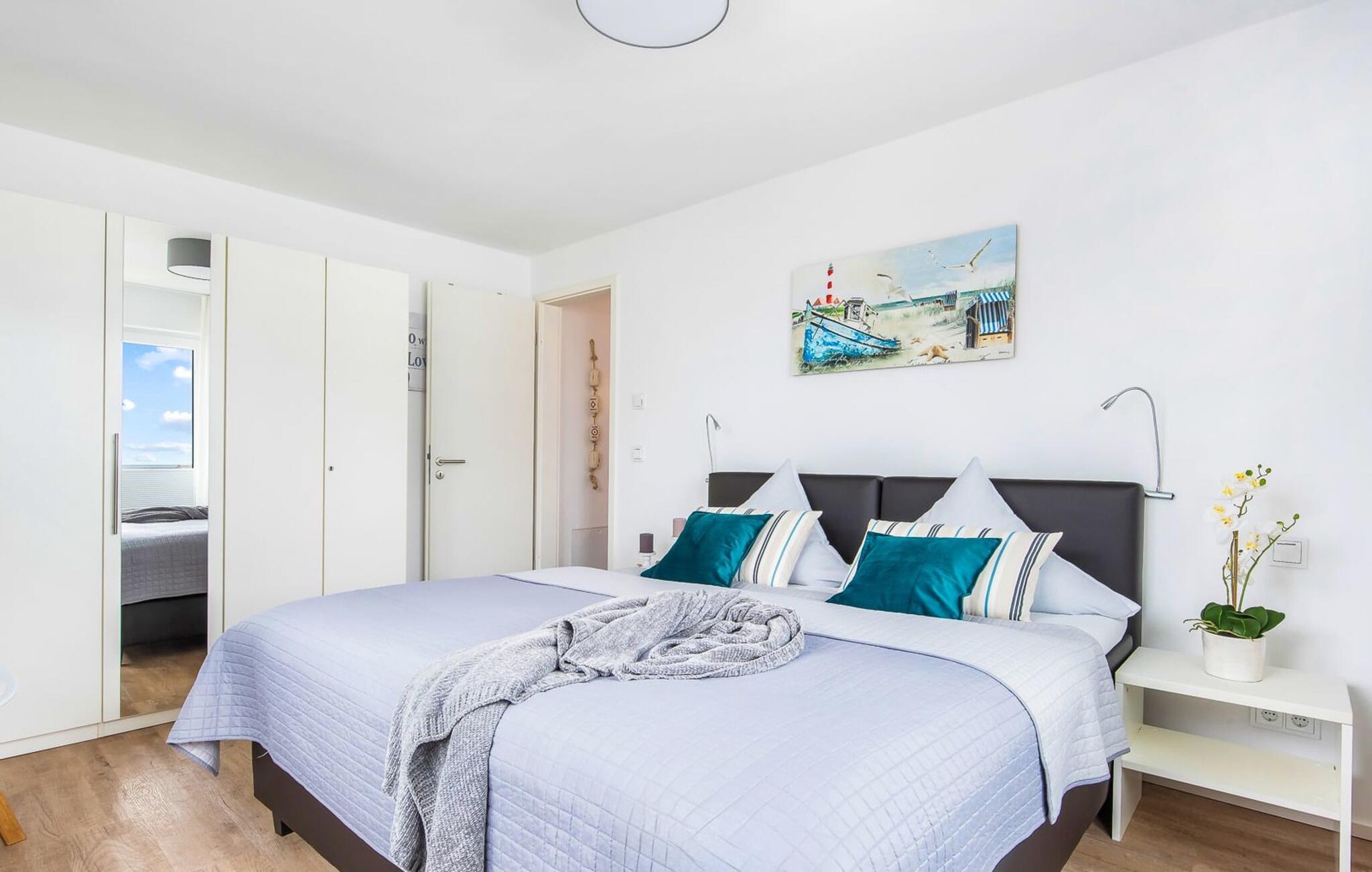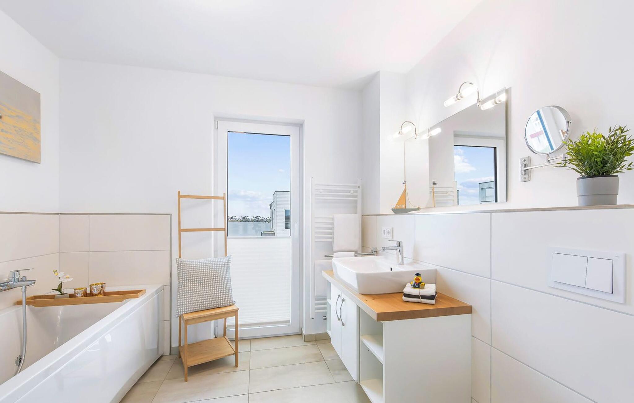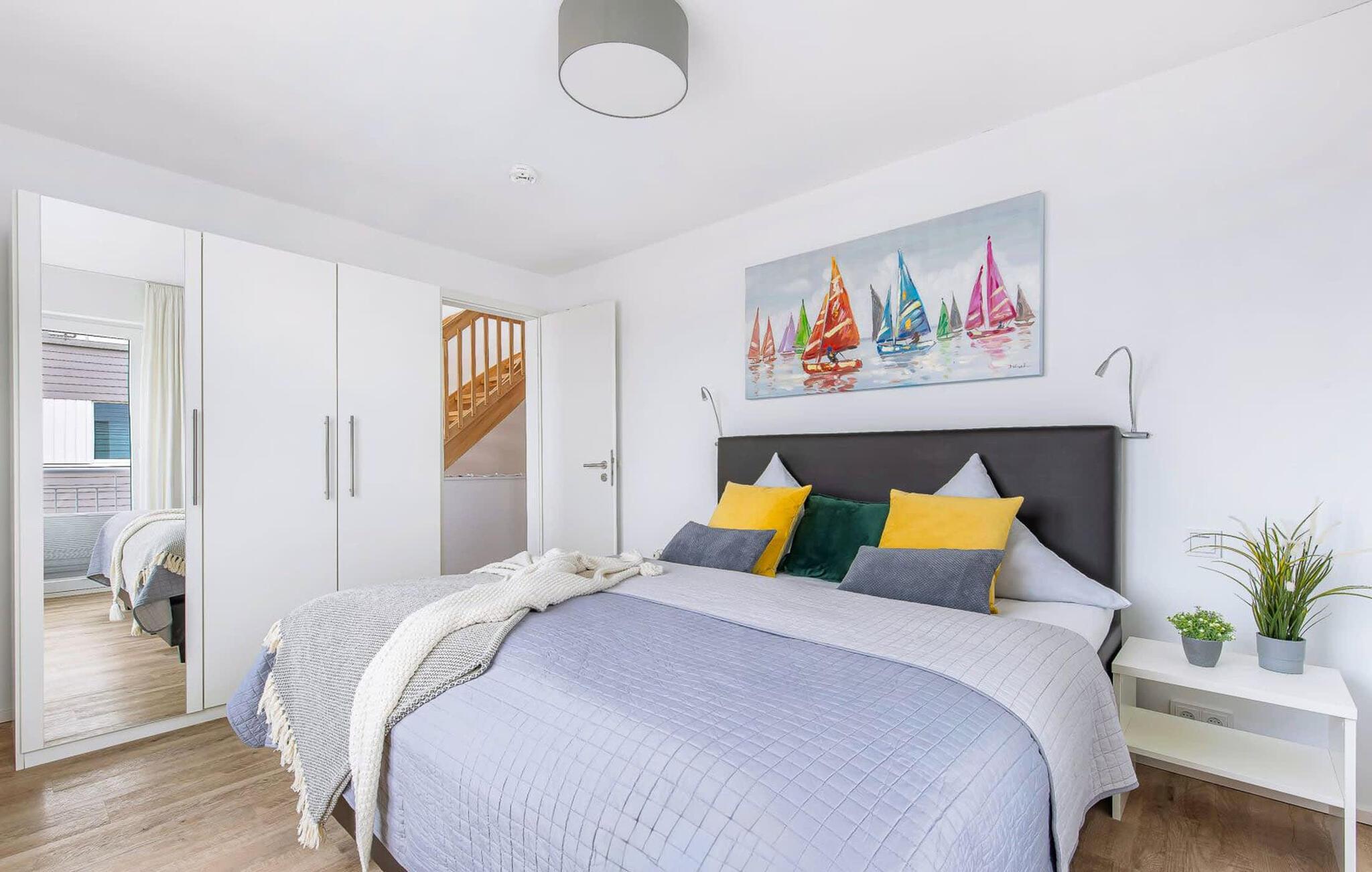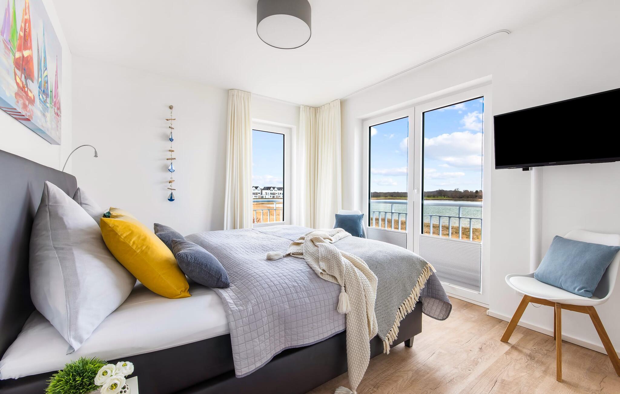 Im ersten Obergeschoss befindet sich der Ruhebereich. Hier bieten zwei Schlafzimmer ausreichend Platz zum Energietanken. Im Hauptschlafzimmer mit direktem Schleiblick ist Aufwachen und Einschlafen vor Traum-Kulisse angesagt. Ein weiteres Schlafzimmer ermöglicht den Blick über die Straße auf den Segel- und Sportboothafen des OstseeResorts. Ebenfalls auf dieser Ebene befindet sich ein Vollbad mit Dusche und Relax-Whirlwanne für das private Wellness Programm.