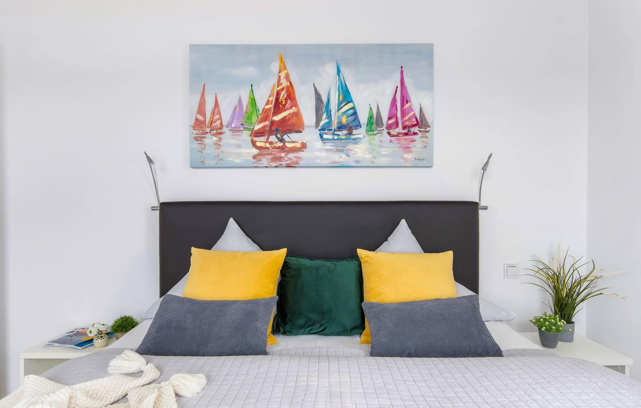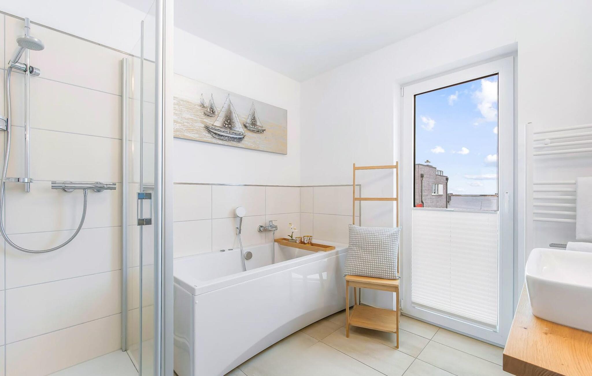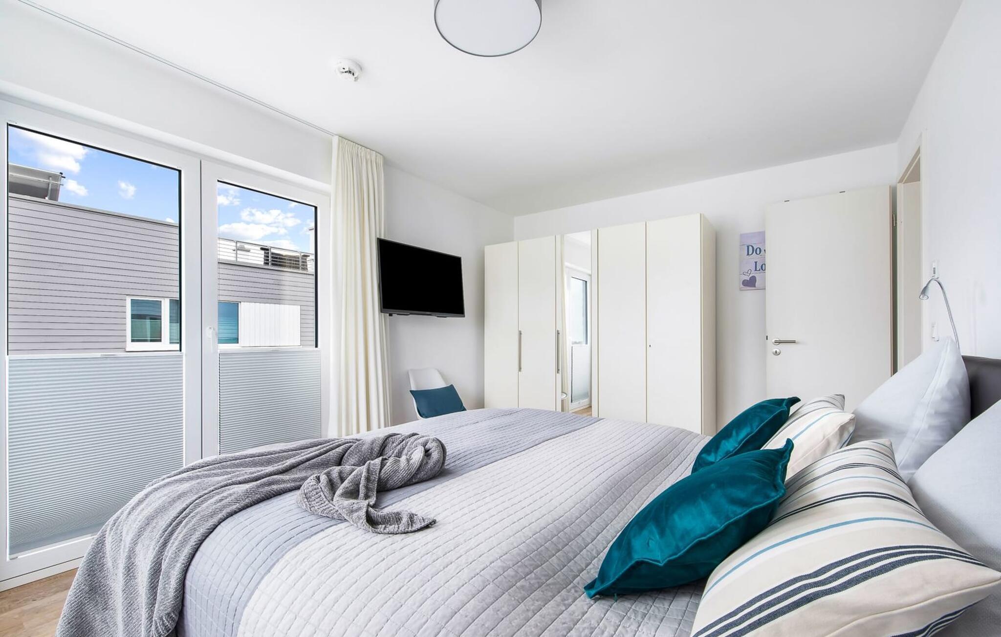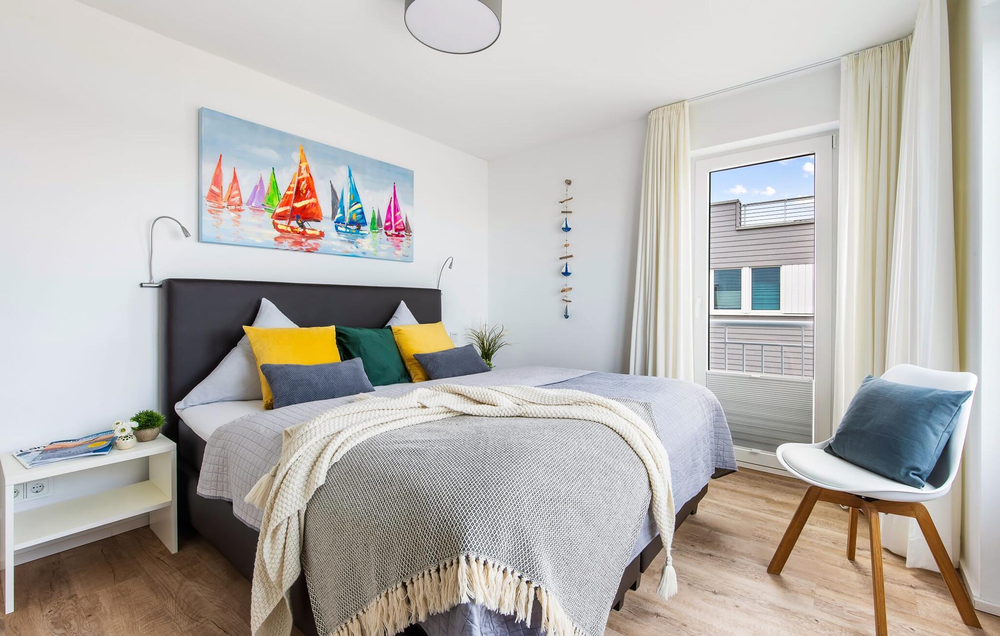 Im ersten Obergeschoss befindet sich der Ruhebereich. Hier bieten zwei Schlafzimmer ausreichend Platz zum Energietanken. Im Hauptschlafzimmer mit direktem Schleiblick ist Aufwachen und Einschlafen vor Traum-Kulisse angesagt. Ein weiteres Schlafzimmer ermöglicht den Blick über die Straße auf den Segel- und Sportboothafen des OstseeResorts. Ebenfalls auf dieser Ebene befindet sich ein Vollbad mit Dusche und Relax-Whirlwanne für das private Wellness Programm.