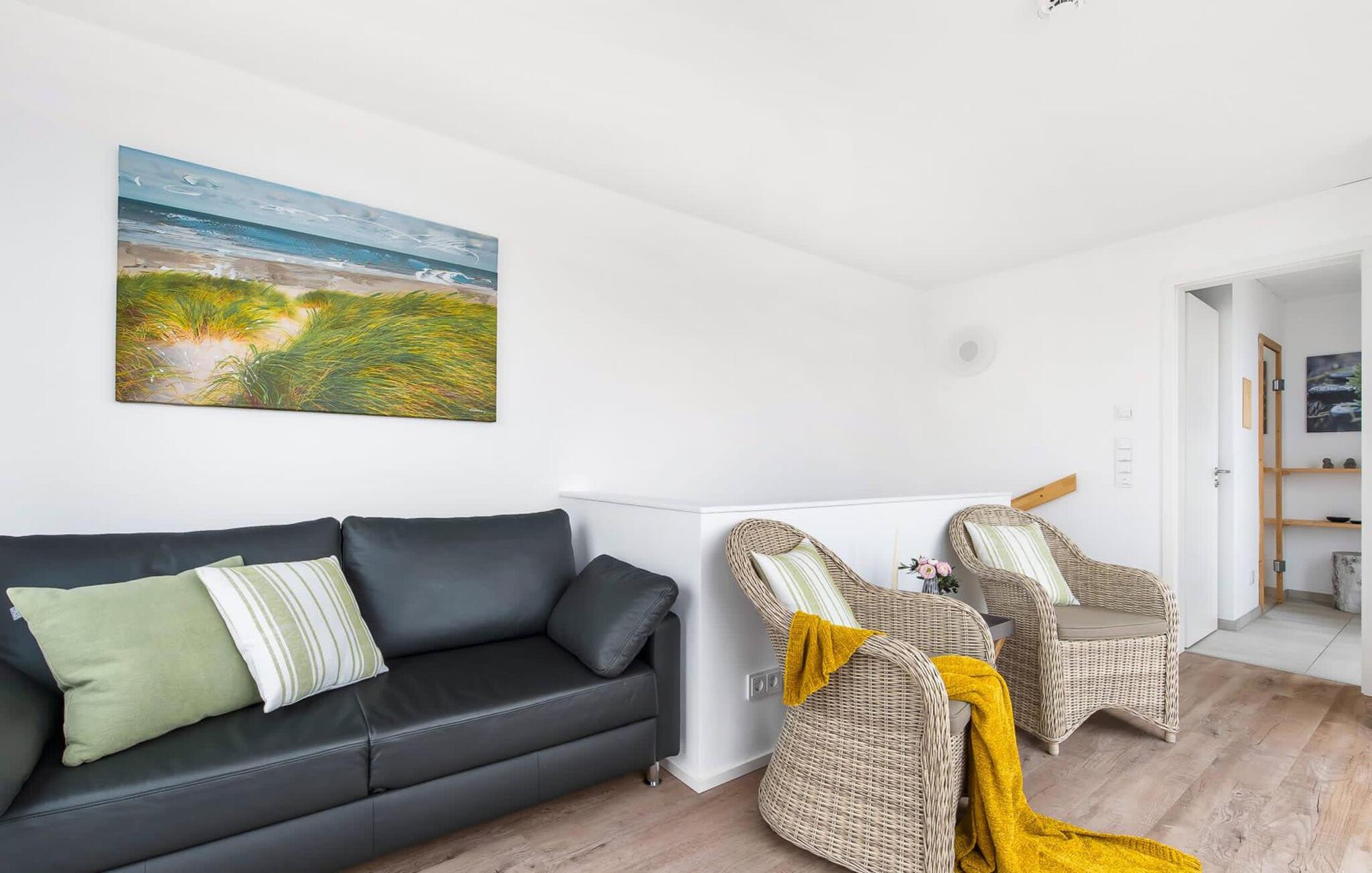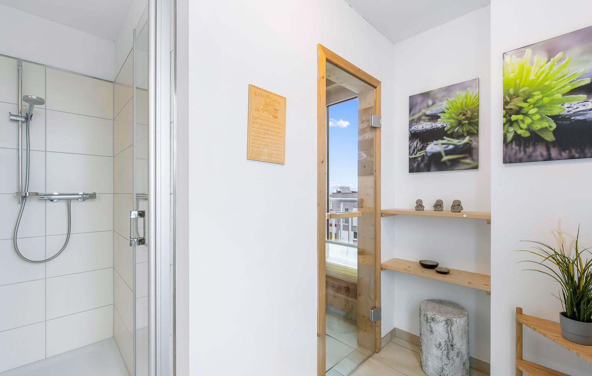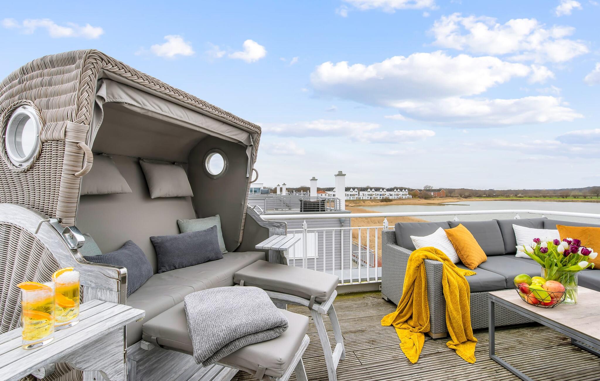 Im zweiten Obergeschoss besticht das Ferienhaus Schleijuwel mit einem zusätzlichen Wohnbereich und großer angrenzender Dachterrasse. Eine große finnische Sauna mit anliegender Dusche perfektioniert das Urlaubserlebnis. Von hier oben ist der freie Blick über die Schlei und den Segel- und Sportboothafen des OstseeResorts so wunderschön, dass man hier nicht nur sonnenbaden, sondern nach romantischem Sonnenuntergang auch nachts die Sterne beobachten möchte. Ein weiterer Schlafplatz steht auf dieser Ebene auf der komfortablen Schlafcouch zur Verfügung.