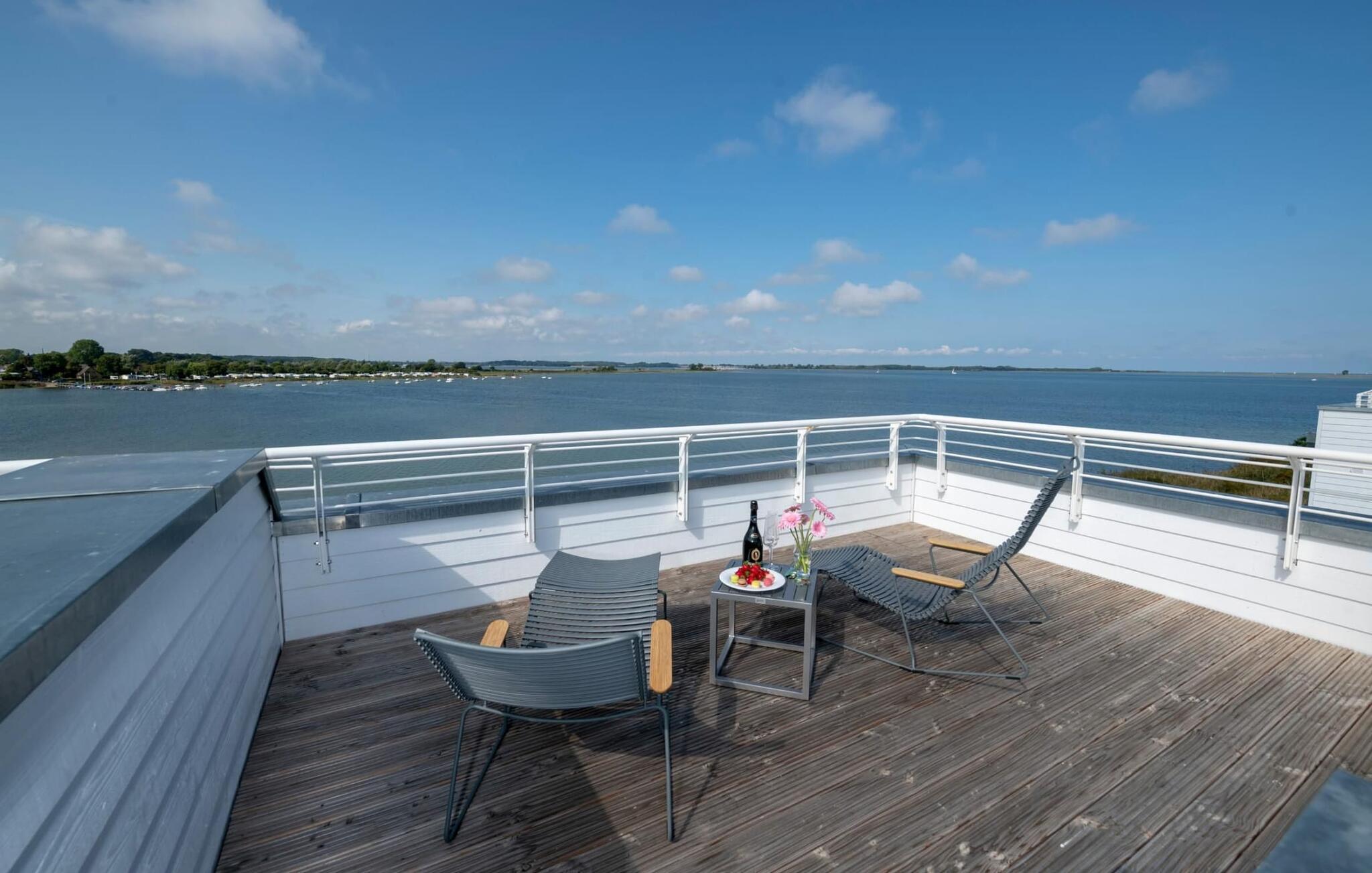 Modernes Ferienhaus an der Ostsee mit Panorama-Wasserblick, privatem Wellnessbereich und Dachterrasse für entspannte Stunden.
