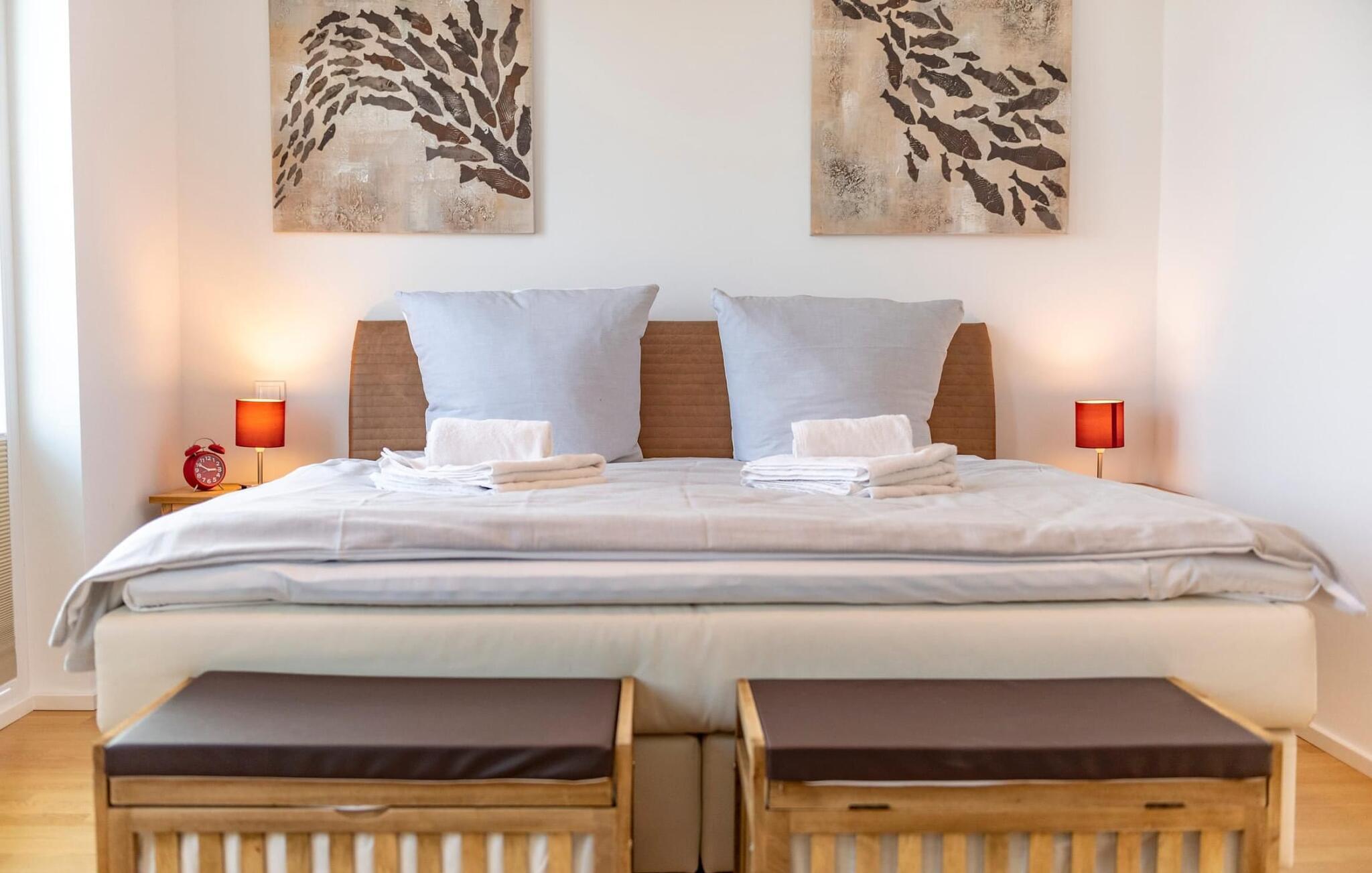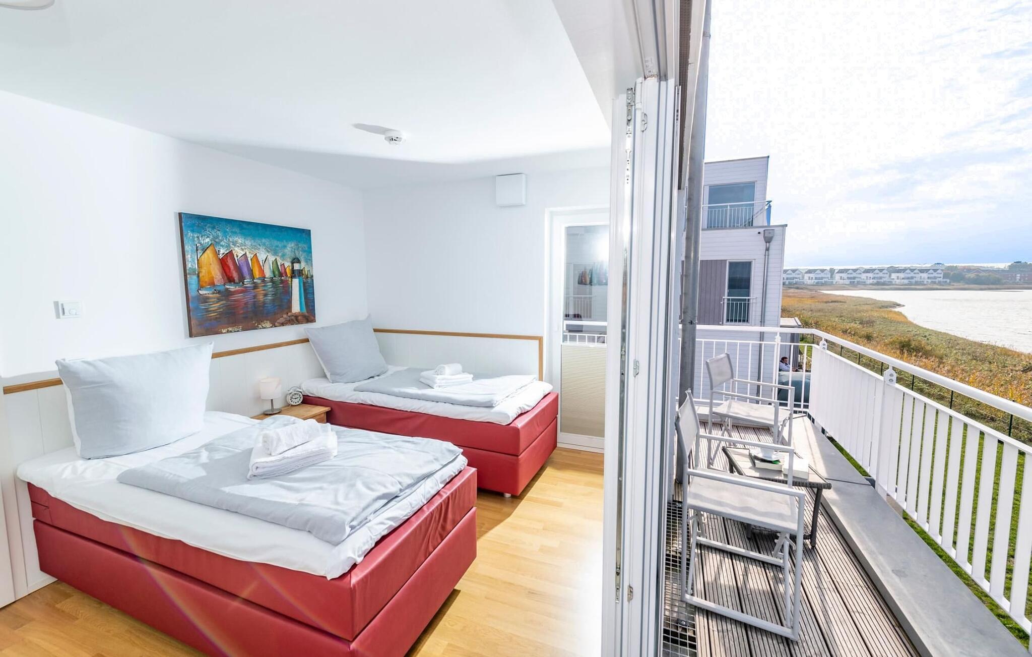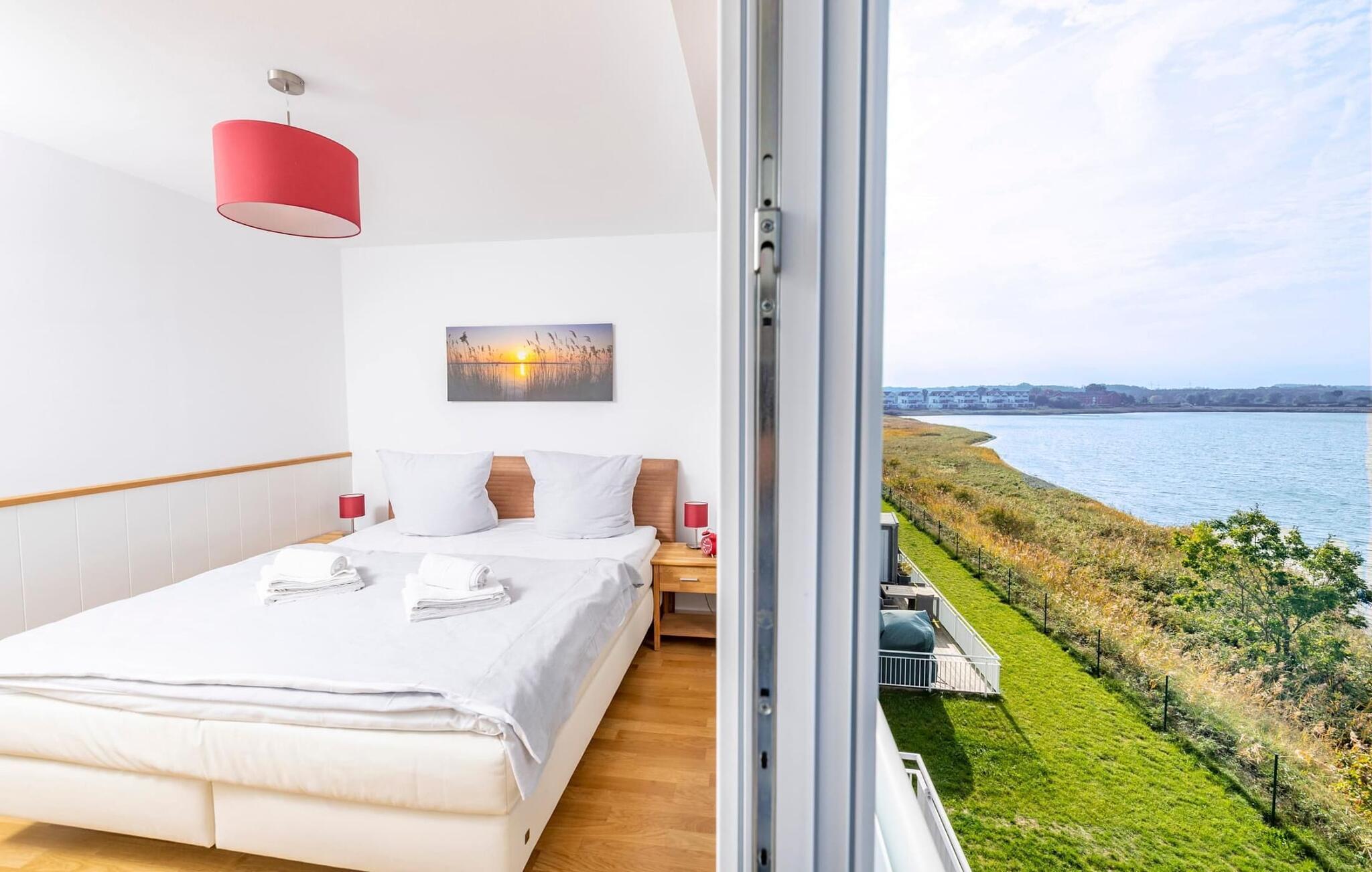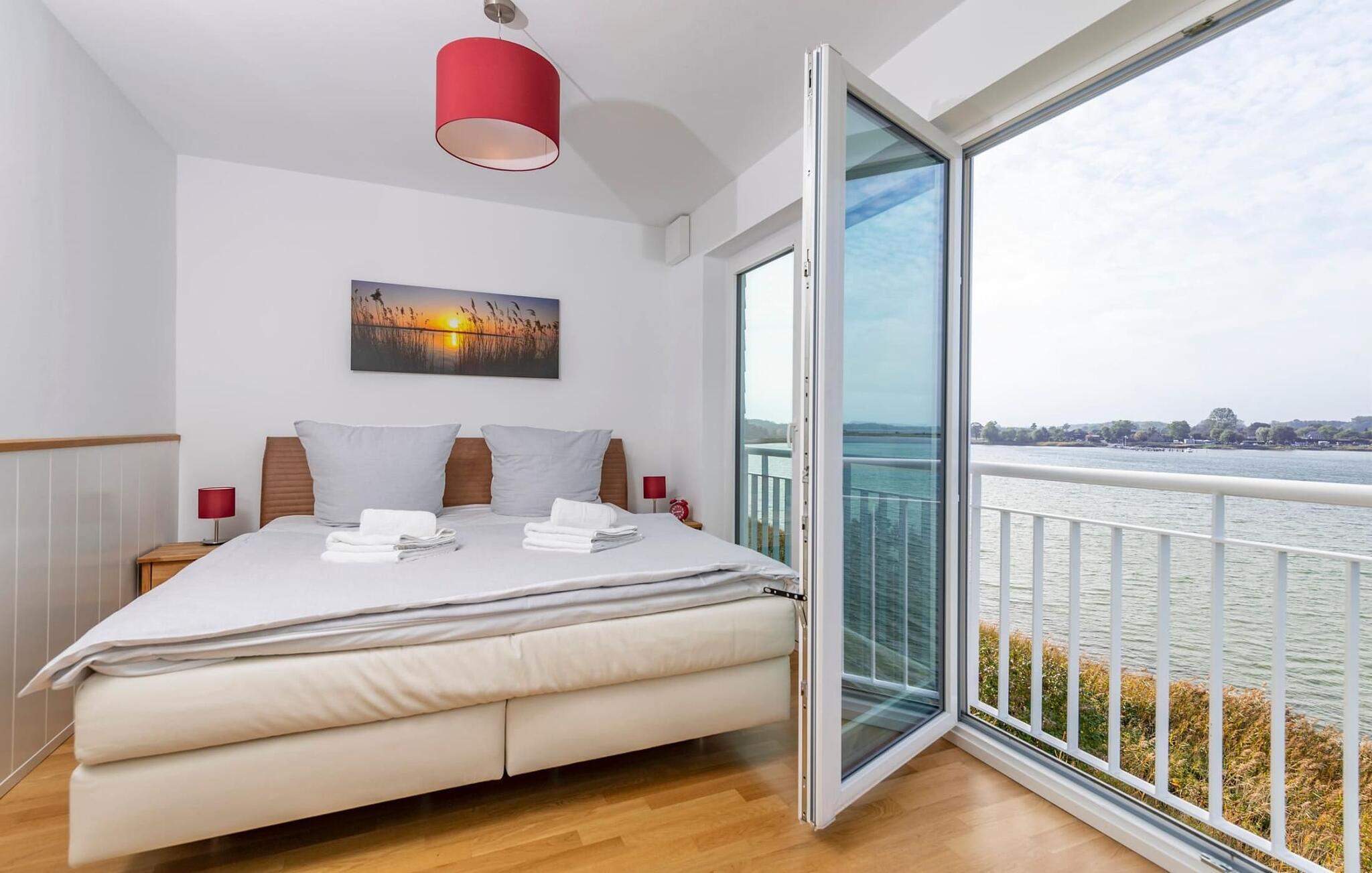 Boxspringbetten und Insektenschutz sorgen für vollen Urlaubskomfort. Ausgeschlafen erwachen und Ostseebrise schnupperndas Schlei. Schlafzimmer im 1. OG verfügt über zwei flexibel zusammenschiebbare Einzelbetten und bietet direkten Zugang zur umlaufenden Terrasse. Mit einem Heißgetränk darf Gast hier der Natur beim Wachwerden zuschauen, wenn Wildgänse, Enten und Schwäne am Schleiufer ihre Flugkünste üben. Das Hafen-Schlafzimmer im 1.OG. verfügt über ein Doppelbett mit Hafenblick und einen zusätzlichen TV. Ein weiteres Schlafzimmer befindet sich wahrlich über den Dingen im 2. OG und schaut über die Weite des Ostseefjord Schlei. Auch dieses Schlafzimmer ist mit einem Doppelbett und einem zusätzlichen TV ausgestattet.
