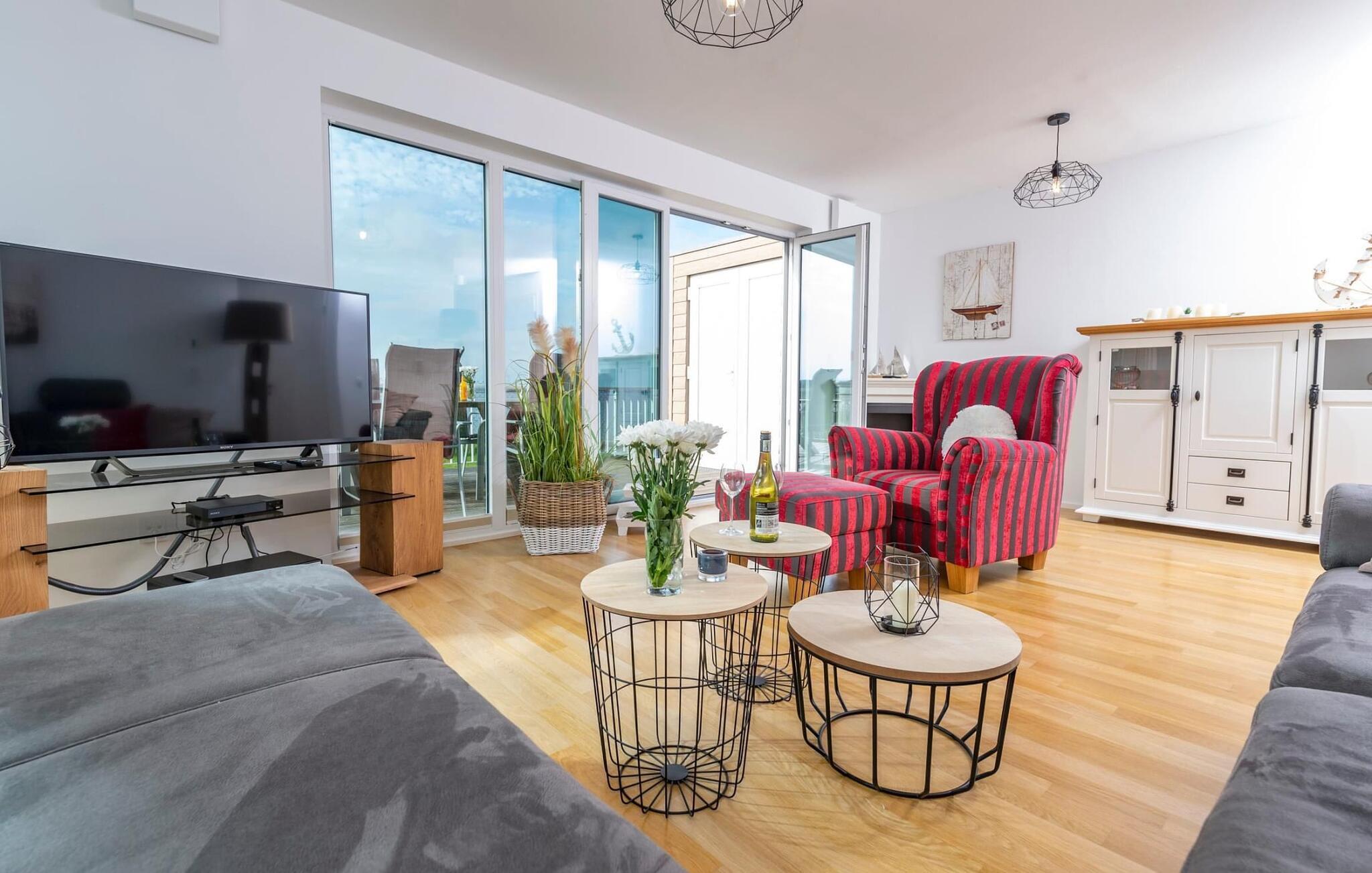 Liebevoll eingerichtet und hochwertig ausgestattet, auch die Wohnküche lässt keine Wünsche offen. Hier lassen sich köstliche Urlaubsmahlzeiten zaubern. Fußbodenheizung, Elektro-Kaminofen und privater Wellnessbereich spenden wohligen Komfort zu jeder Jahreszeit. Zurück von einem Strandspaziergang lässt es sich in der finnischen Sauna mit Wasserblick oder in der Whirlwanne tiefenentspannen. Für Indoor Entertainment sorgen auch der Smart TV mit Blue Ray Player, Radio, diverse Filme und Spiele.