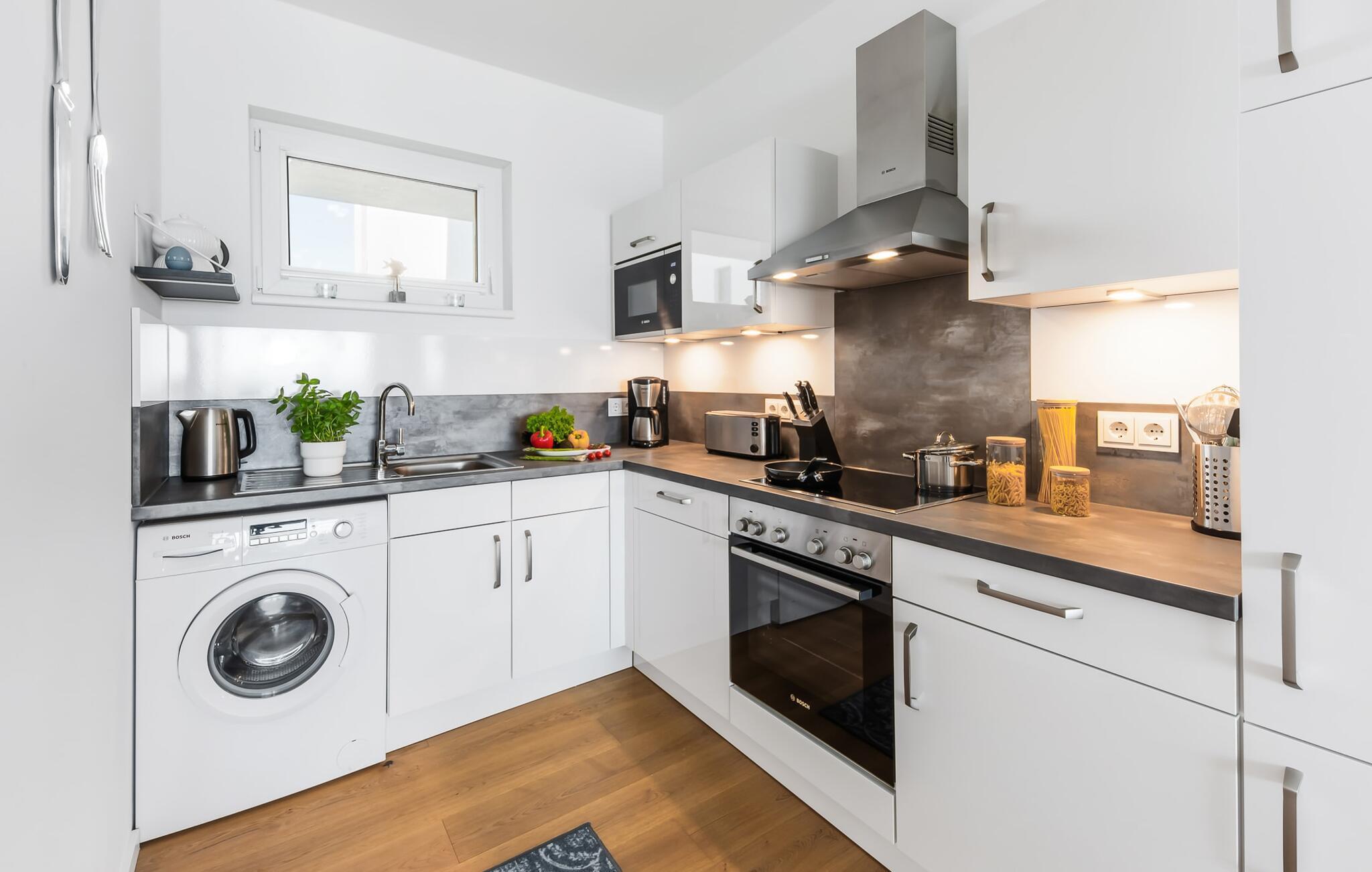 Die bestens ausgestattete Küchenzeile macht Kochen zum Spaßfaktor, nicht zuletzt auch wegen des wunderbaren Blicks auf die sich immer wieder verändernde See.