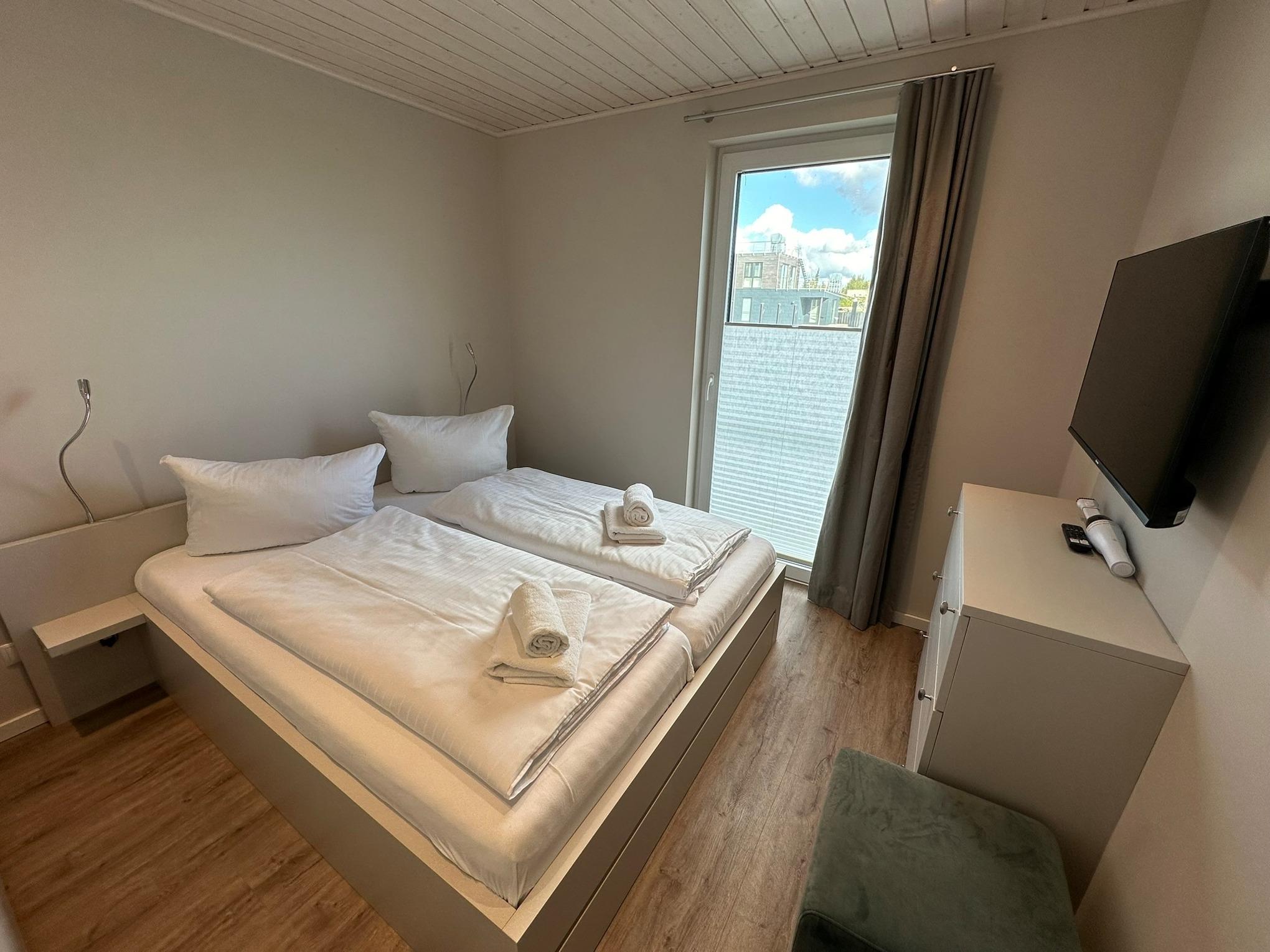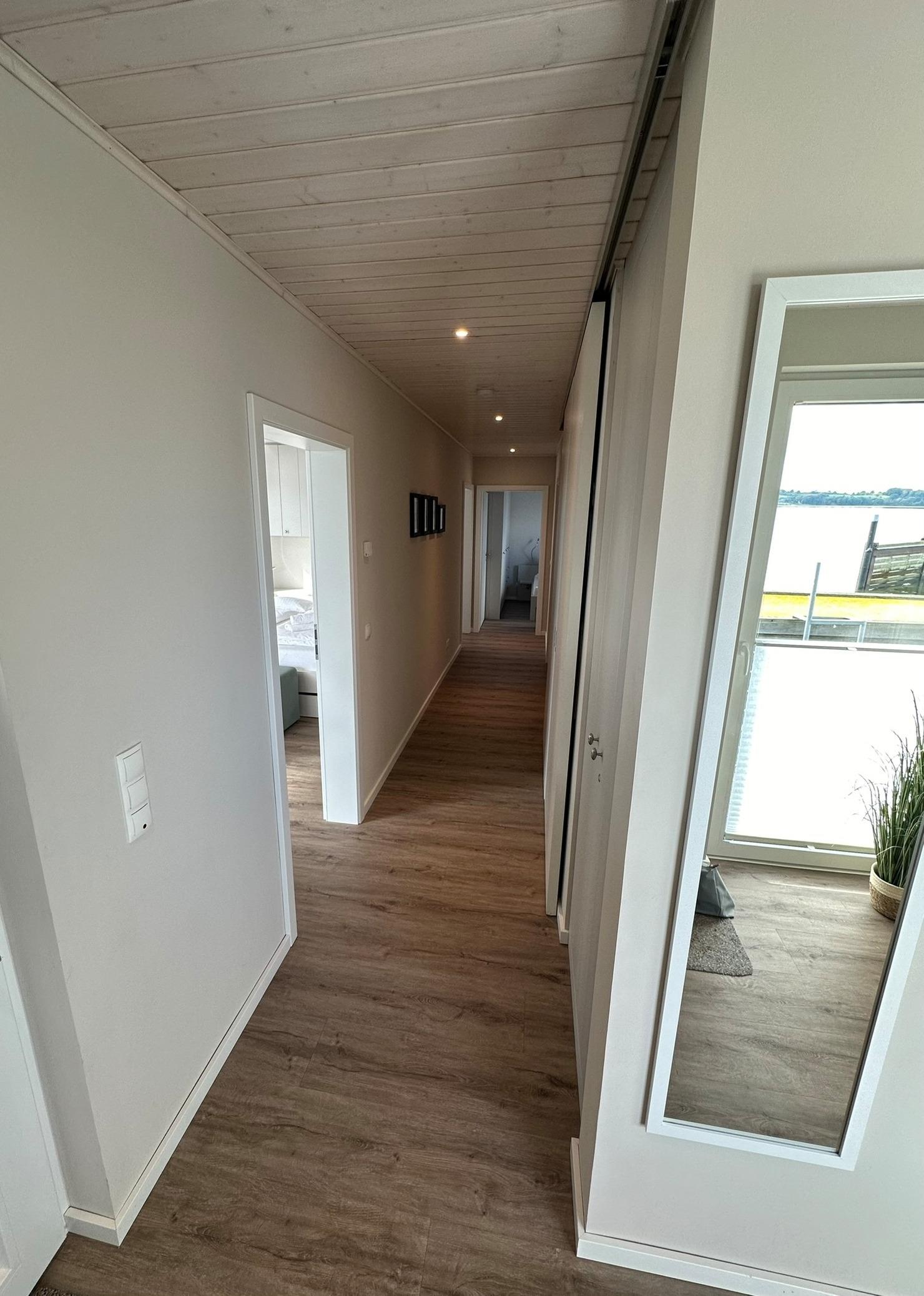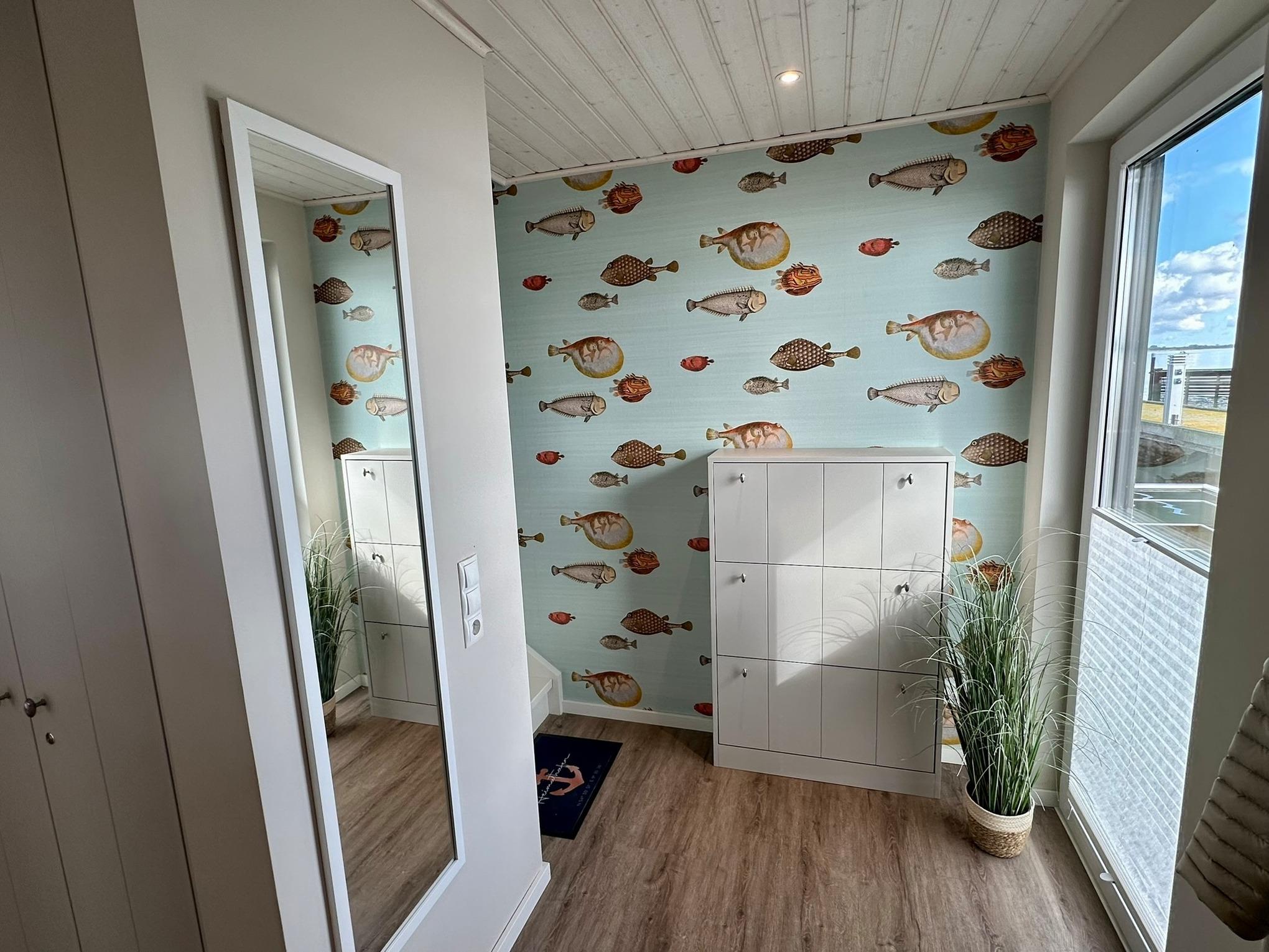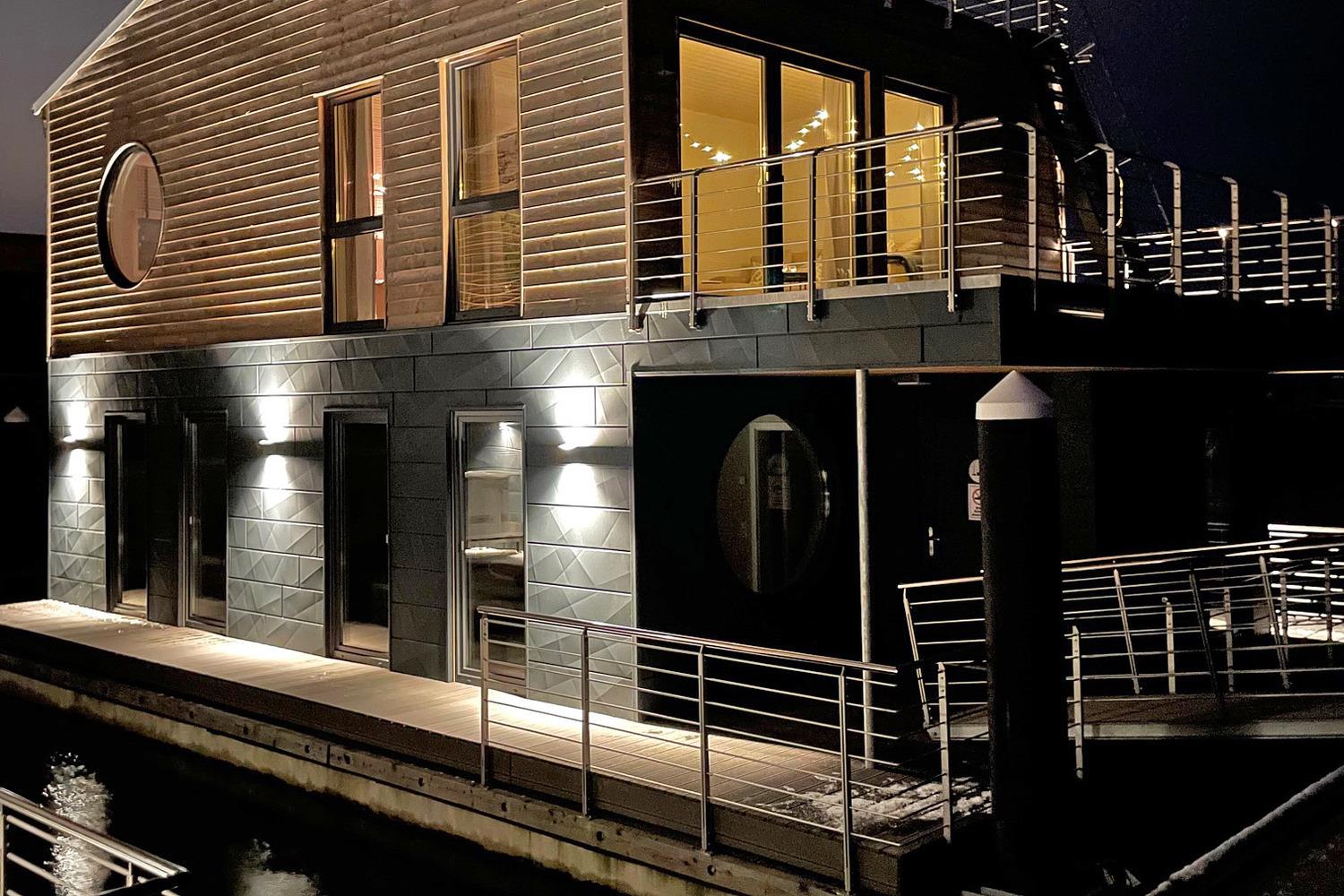 Einzigartiger Urlaub auf dem Wasser – Wasserhaus Schlei – Im historischen Pionierhafen Schleswig erwartet Sie ein schwimmendes Feriendomizil mit ca. 150 qm Wohnfläche für bis zu 6 Personen. Genießen Sie Wasserblick in erster Reihe, einen großzügigen Wohnbereich, Sonnendeck, Kamin, Fußbodenheizung, eine voll ausgestattete Küche sowie zahlreiche Extras