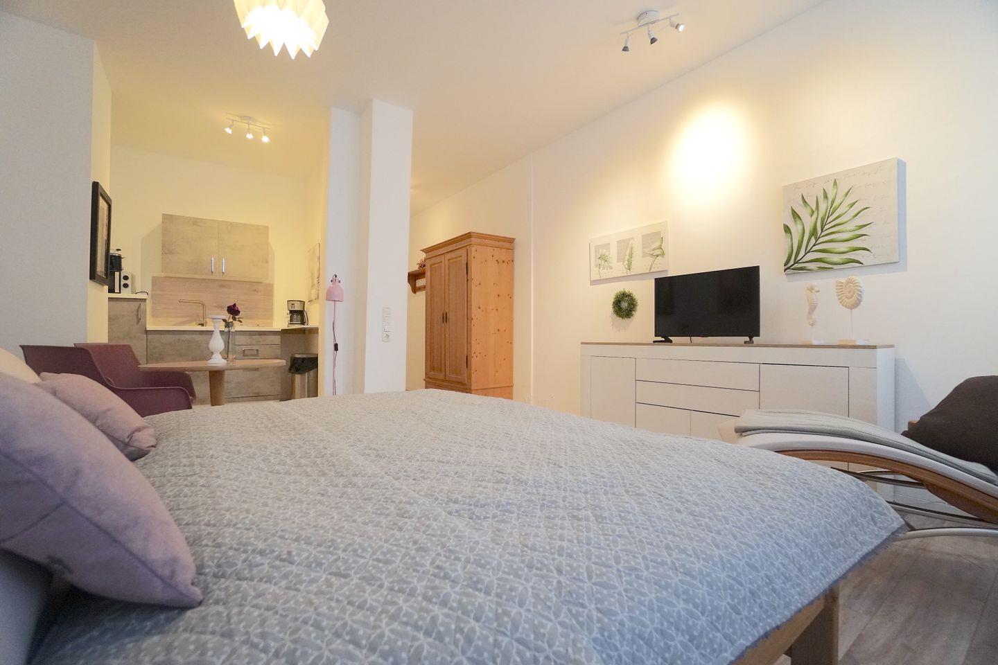 Der helle, freundliche Wohn-Schlaf-Raum ist geschmackvoll eingerichtet. Das Doppelbett sorgt für eine erholsame Nacht.