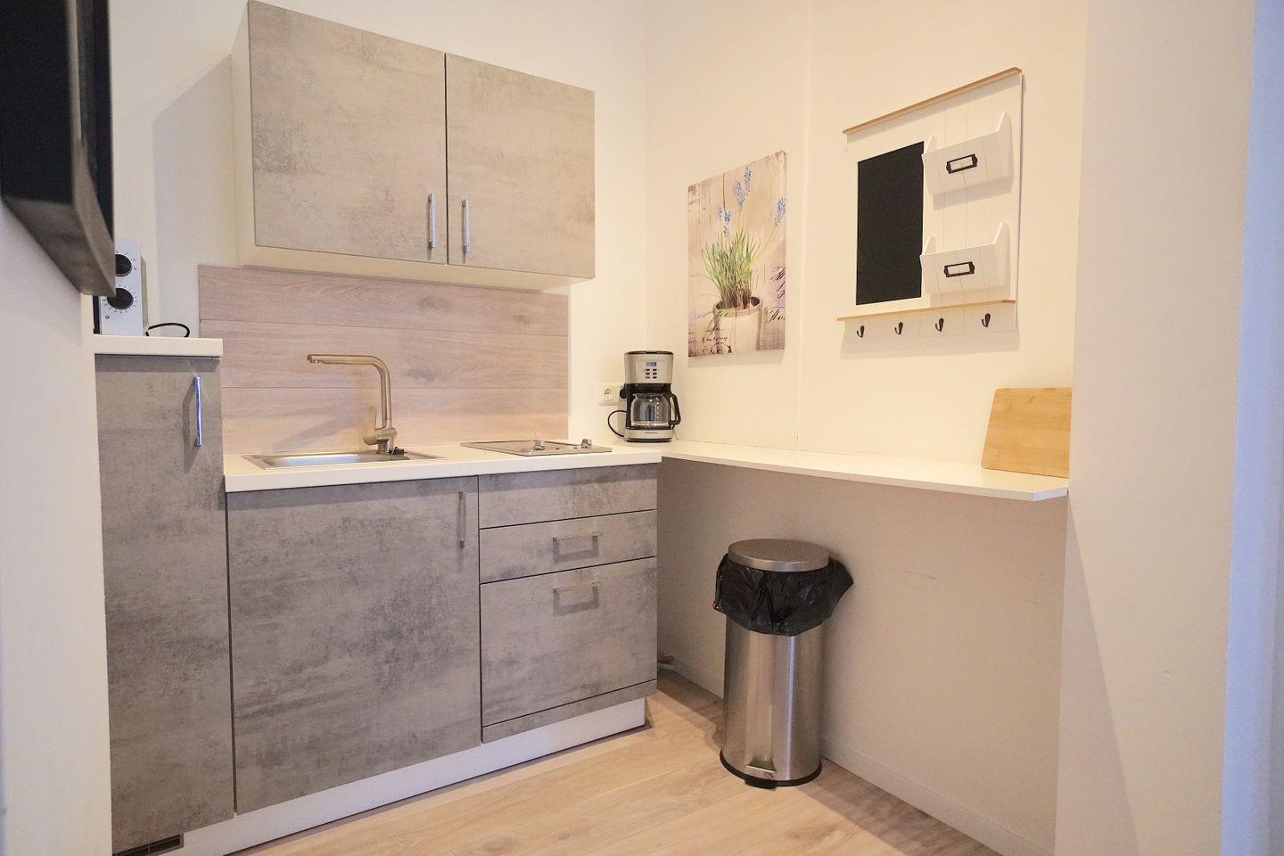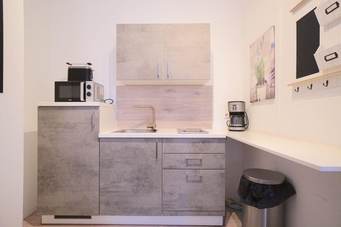 Die neuwertige Küchenzeile ist optisch durch eine Nische leicht von dem Wohn/Schlafbereich abgegrenzt und bieten auf kleinstem Bereich einen hohen Komfort, wie Mikrowelle, Kühl-Gefrierkombi und sogar einem Mini-Geschirrspüler.
