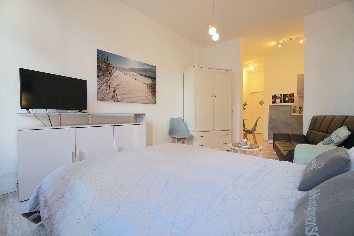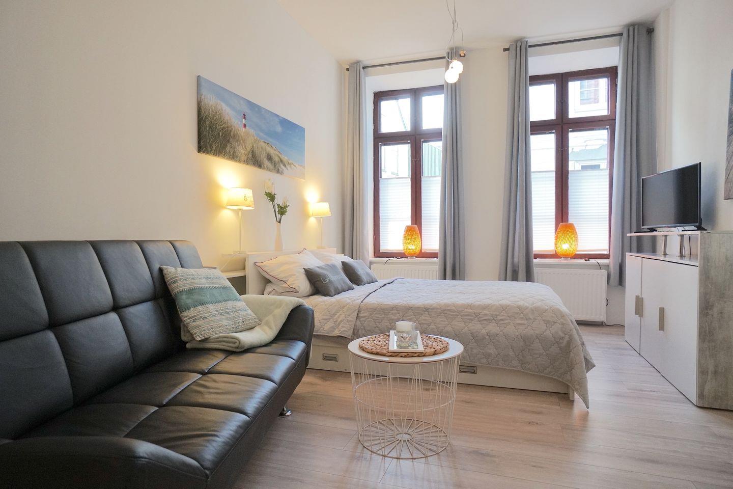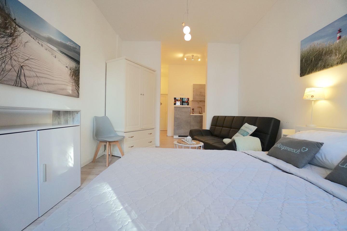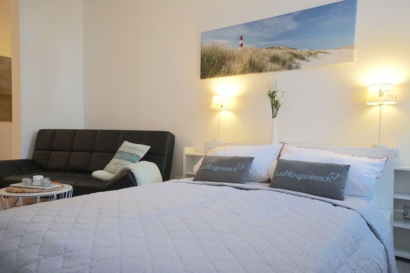 Der helle, freundliche Wohn-Schlaf-Raum ist geschmackvoll eingerichtet. Das Doppelbett sorgt für eine erholsame Nacht.