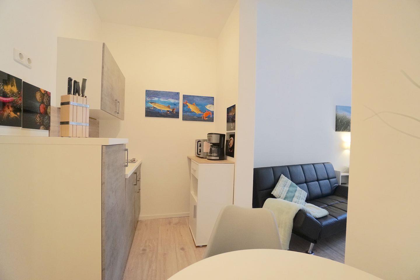 Die neuwertige Küchenzeile ist optisch durch eine Nische leicht von dem Wohn/Schlafbereich abgegrenzt und bieten auf kleinstem Bereich einen hohen Komfort, wie Mikrowelle, Kühl-Gefrierkombi und sogar einem Mini-Geschirrspüler.