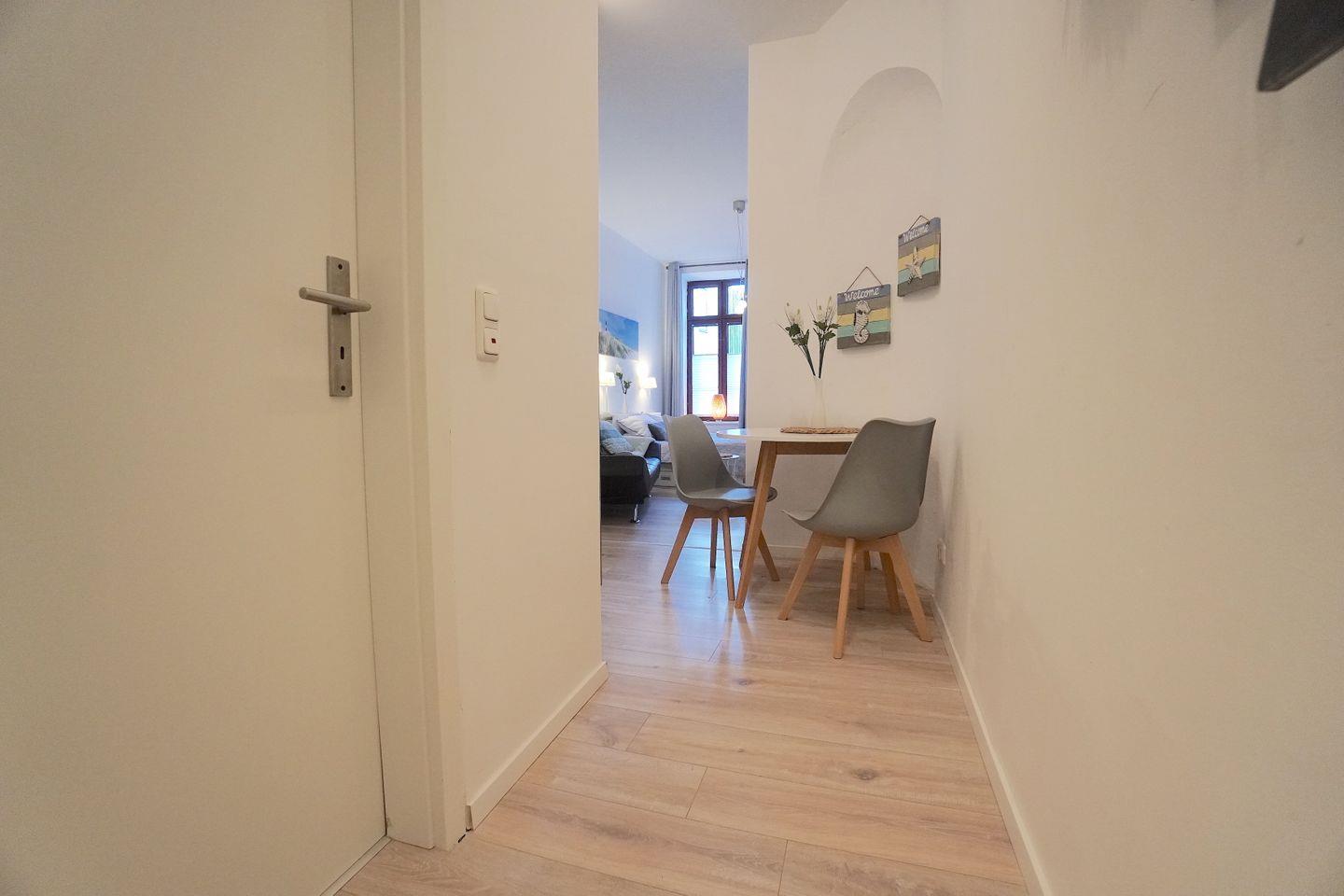 Absolutes Wohlfühlen auf 30qm! Die kleine Wohnung bieten alles was man für einen Aufenthalt in der Wikingerstadt Schleswig braucht. Sie verfügt über einen geräumigen Wohn- und Schlafraum mit einer kleinen Küchenzeile und Essbereich. Ein Flur führt in die Wohnung und bietet Platz für Schuhe und Garderobe. Gleich vorne an befindet sich außerdem das Badezimmer, welches frisch renoviert ist und über Tageslicht verfügt. Das Bad ist hell und bieten genügend Platz und Komfort.