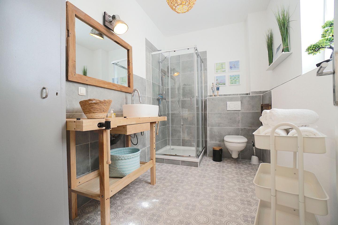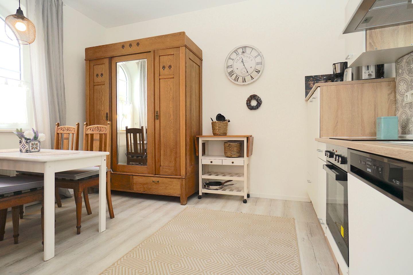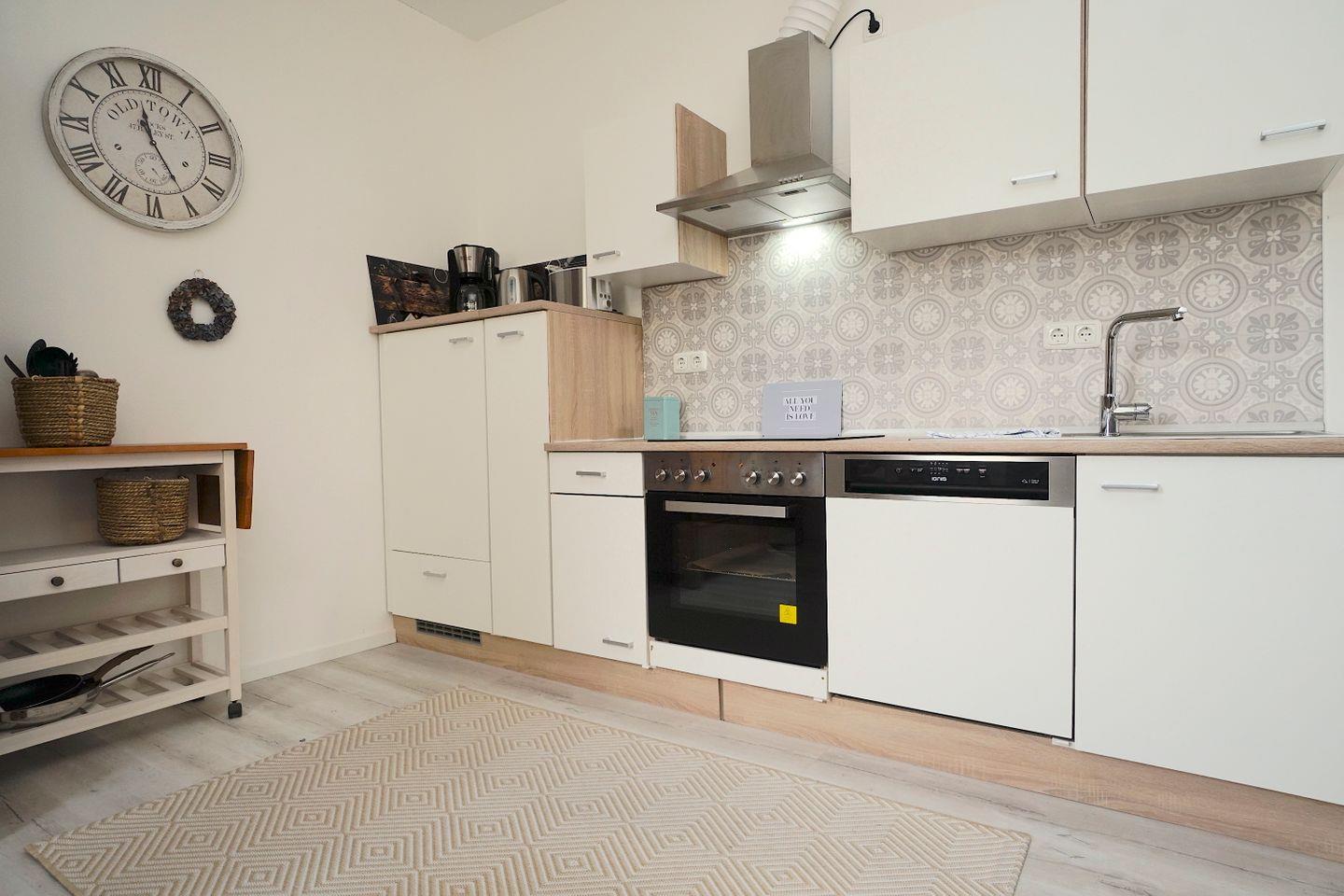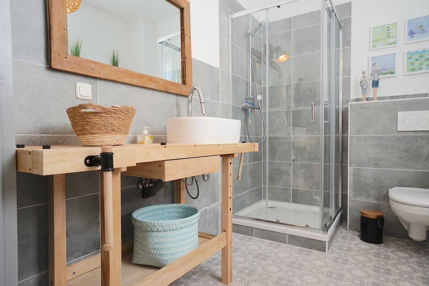 Die Ferienwohnung teilt sich auf in ein offenen Wohn-, Ess- und Kochbereich im Erdgeschoss mit einem Tageslichtduschbad.