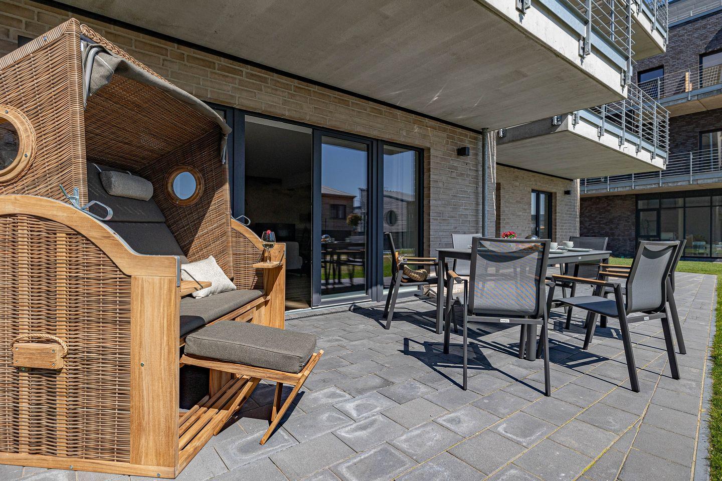 Auf der Terrasse kannst Du Dich entspannen und an lauen Abenden im Strandkorb Deine Urlaubstage ausklingen lassen.