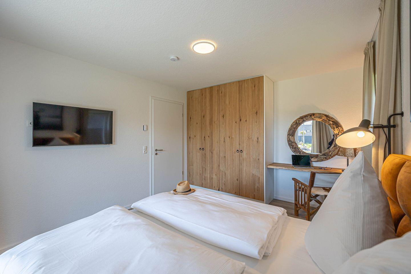 Zwei der drei Schlafzimmer bieten jeweils ein gemütliches Doppelbett (180x200cm), sowie Verdunklungsmöglichkeiten für erholsame Nächte.