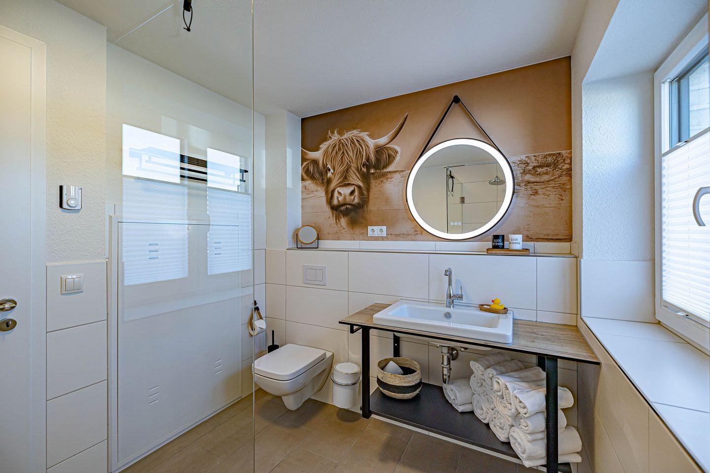 In einem der beiden Badezimmer findest Du einen Föhn und eine Dusche vor.