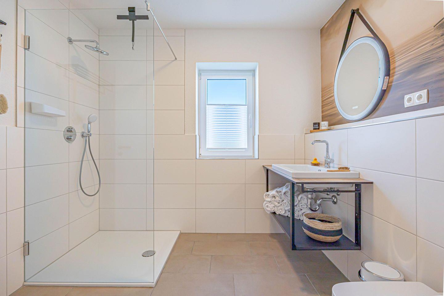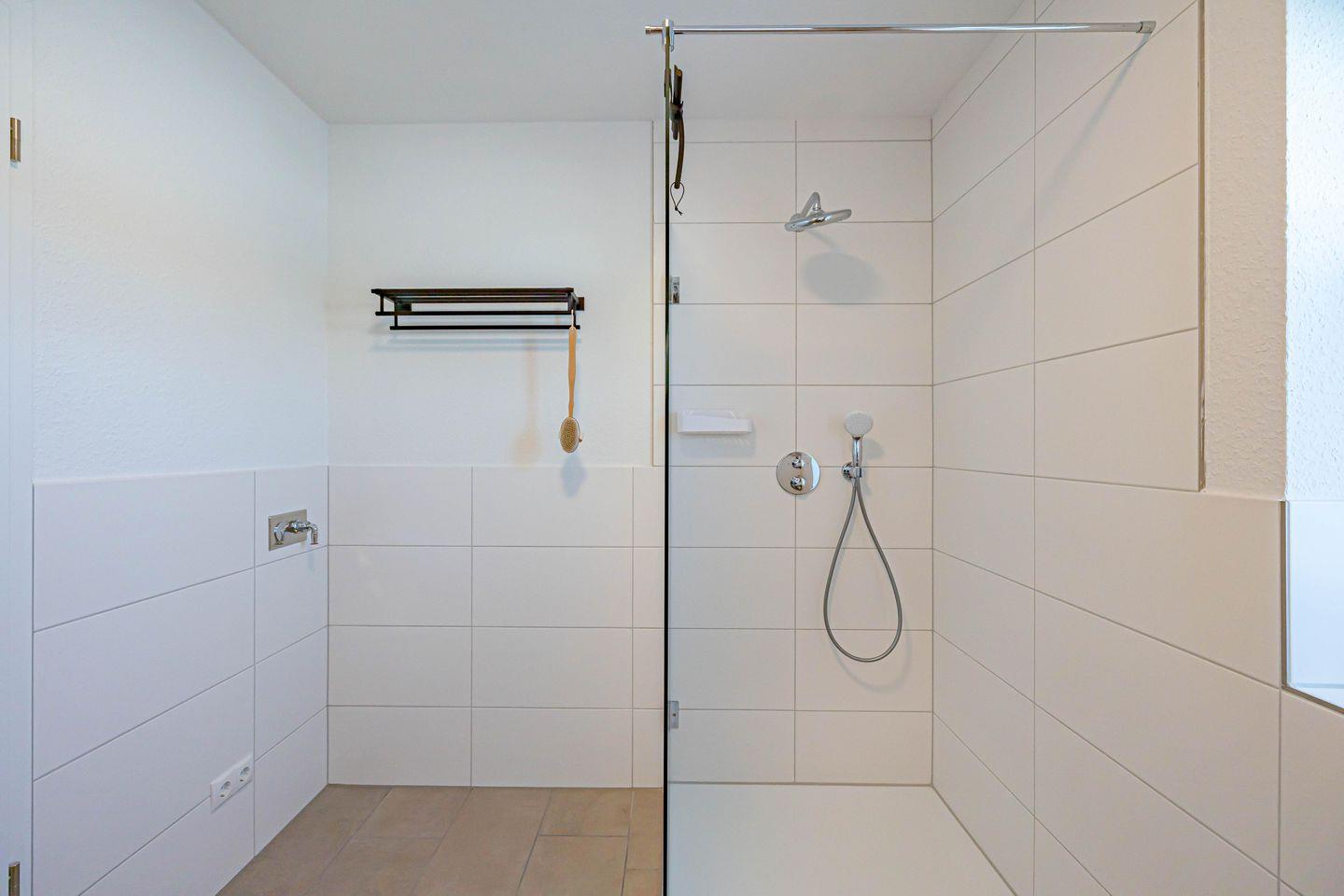 In dem Badezimmer findest Du einen Föhn und eine Dusche vor.