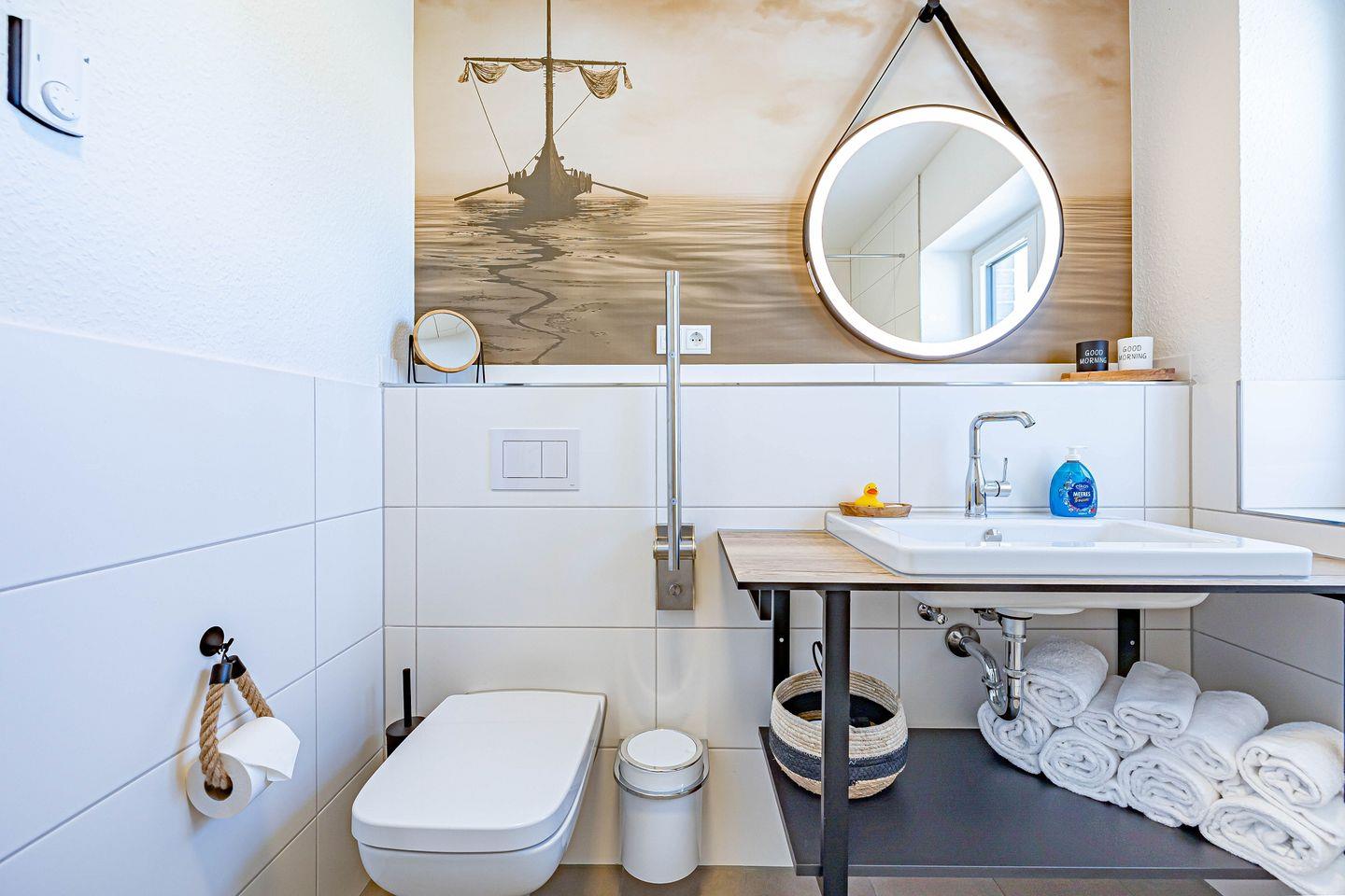 Zwei Schlafzimmer bieten jeweils ein gemütliches Boxspring-Doppelbett (180x200cm) sowie eine Verdunkelungsmöglichkeit für erholsame Nächte. Das Badezimmer ist modern gestaltet und bietet eine bodengleiche Dusche mit Haltegriff sowie eine Fußbodenheizung, die für zusätzlichen Komfort sorgt. Ebenfalls stehen Dir ein Kosmetikspiegel und ein Föhn bereit. Eine Waschmaschine steht Dir zur gemeinschaftlichen Nutzung im Nachbarhaus zur Verfügung, damit Du auch bei längeren Aufenthalten immer frisch gewaschene Kleidung hast. Durch die einzigartige Lage am Ostseefjord Schlei kann auch ein Boot mitgebracht und auf einem Liegeplatz gegen Gebühr direkt am Pionierhafen angelegt werden. Bitte sprich uns hierfür an.