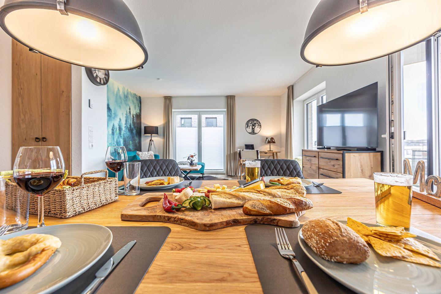 Die Wohnung verfügt über ein einladendes Wohnzimmer, das durch seine offene Gestaltung zur Küche eine entspannte Atmosphäre ausstrahlt. Genieße gemütliche Abende auf dem komfortablen Sofa oder ein Abendessen am Esstisch, der genügend Platz für gesellige Stunden bietet. Für Deine Unterhaltung sorgt ein digitaler TV-Anschluss, und auch WLAN ist kostenfrei für Dich verfügbar.