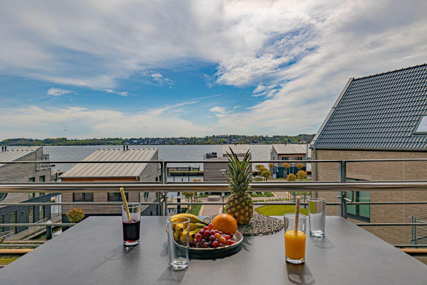 Moderne barrierearme Ferienwohnung mit Balkon und Seeblick am Pionierhafen in Schleswig.