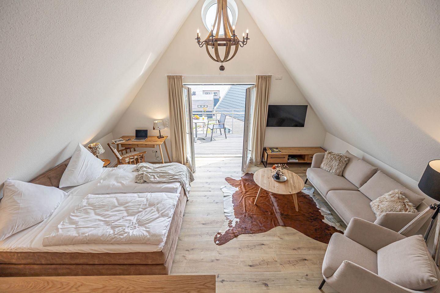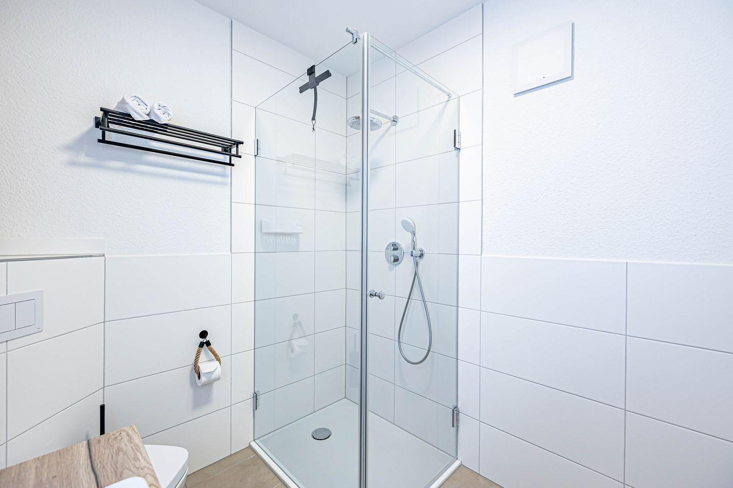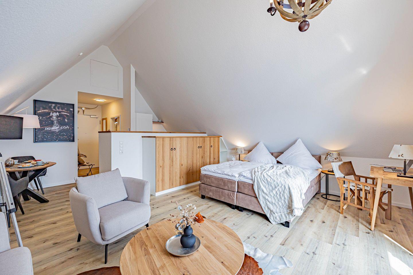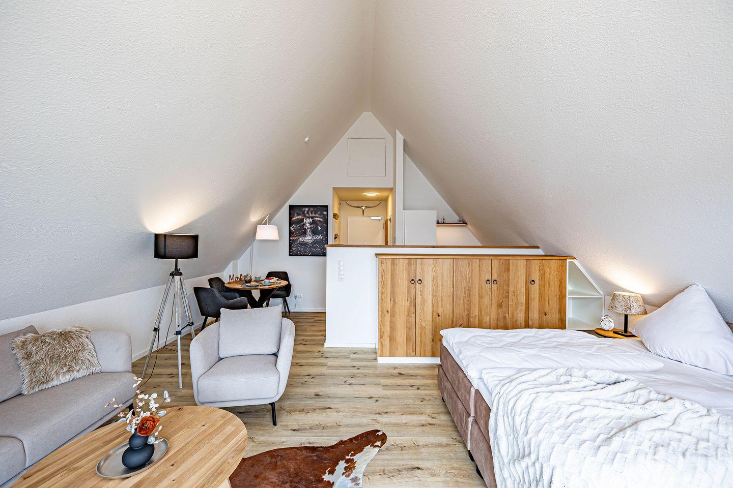 Im Studio-Apartment bietet Dir ein gemütliches Boxspring-Doppelbett (180x200cm) sowie eine Verdunkelungsmöglichkeit erholsame Nächte. Das Badezimmer ist modern gestaltet und bietet eine bodengleiche Dusche sowie eine Fußbodenheizung, die für zusätzlichen Komfort sorgt. Ebenfalls stehen Dir ein Kosmetikspiegel und ein Föhn bereit. Eine Waschmaschine steht zur gemeinschaftlichen Nutzung im Nachbarhaus zur Verfügung, damit Du auch bei längeren Aufenthalten immer frisch gewaschene Kleidung hast.