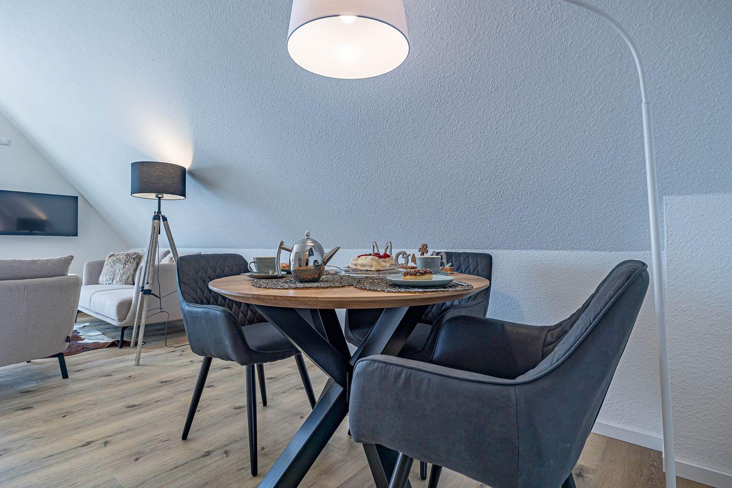 Das Apartment verfügt über ein einladendes Wohnzimmer, das durch seine offene Gestaltung zur Küche eine entspannte Atmosphäre ausstrahlt. Genieße gemütliche Abende auf dem komfortablen Sofa oder ein Abendessen am Esstisch, der genügend Platz für gesellige Stunden bietet. Für Deine Unterhaltung sorgt ein digitaler TV-Anschluss, und auch WLAN ist kostenfrei für Dich verfügbar.