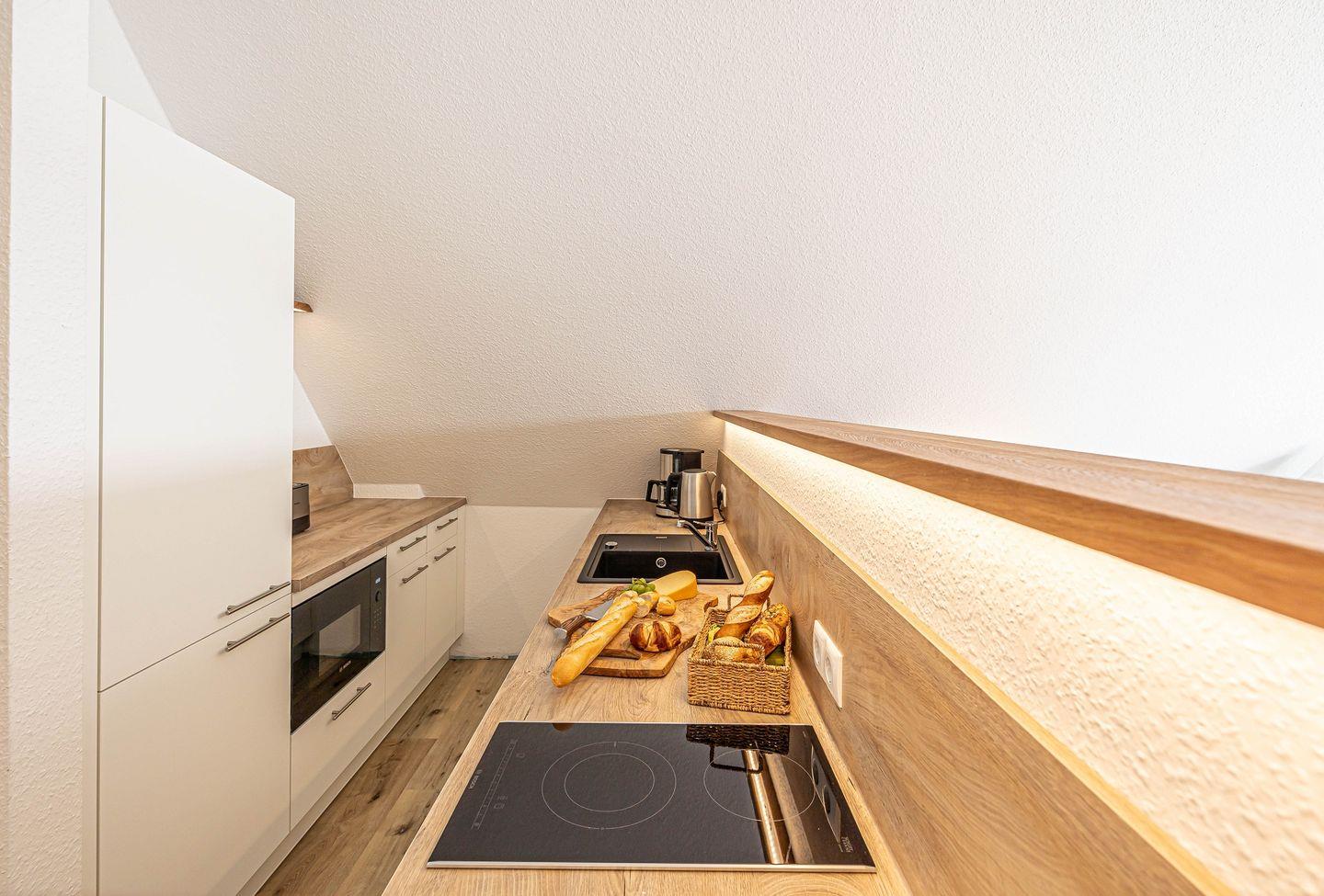 Ein besonderes Highlight der Unterkunft ist der Balkon, von dem Du einen beeindruckenden Blick über die Umgebung genießen kannst – der perfekte Ort, um den Tag mit einem Kaffee zu beginnen oder abends den Sonnenuntergang zu beobachten. Die Küche ist voll ausgestattet mit modernen Geräten, darunter ein Cerankochfeld, Backofen, Mikrowelle, Kühlschrank, Spülmaschine und Kaffeemaschine, sodass Du Deine Lieblingsgerichte zubereiten kannst.