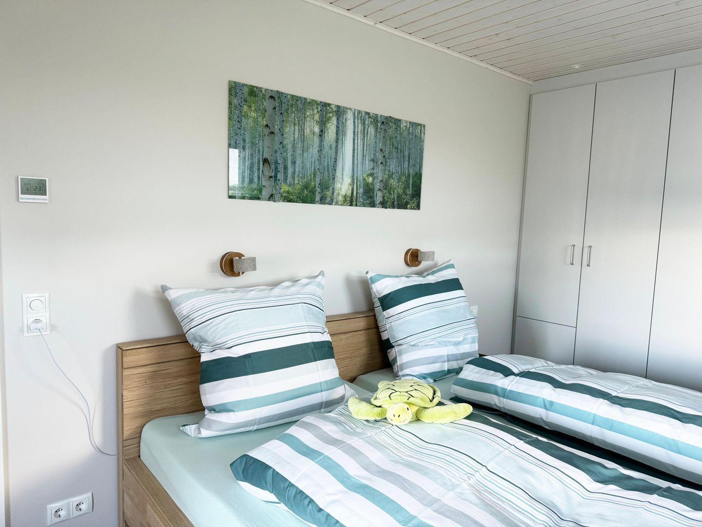 Schlafzimmer 1: Ausgestattet mit einem komfortablen Doppelbett (180x200 cm) und getrennten Matratzen, sorgt dieses Zimmer für erholsame Nächte. Ein Kleiderschrank bietet ausreichend Stauraum, während Verdunklungsmöglichkeiten und ein TV für zusätzlichen Komfort sorgen. Zusätzlich besteht hier, dank Schreibtisch, die Möglichkeit für Workation
