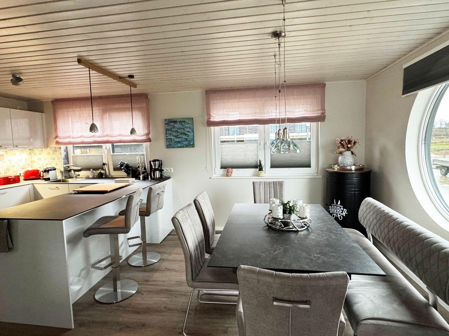 Der kombinierte Wohn- und Essbereich lädt zum Verweilen ein. Hier finden Sie einen Esstisch, einen Schreibtisch, bequeme Sessel sowie ein Sofa. Ein TV und eine Kommode runden den Raum ab. Die offene Küche ist modern eingerichtet und verfügt über alle Annehmlichkeiten wie Mikrowelle, Induktionskochfeld, Backofen, Kühlschrank mit Gefrierfach, Spülmaschine sowie Filterkaffeemaschine und Kapselmaschine.