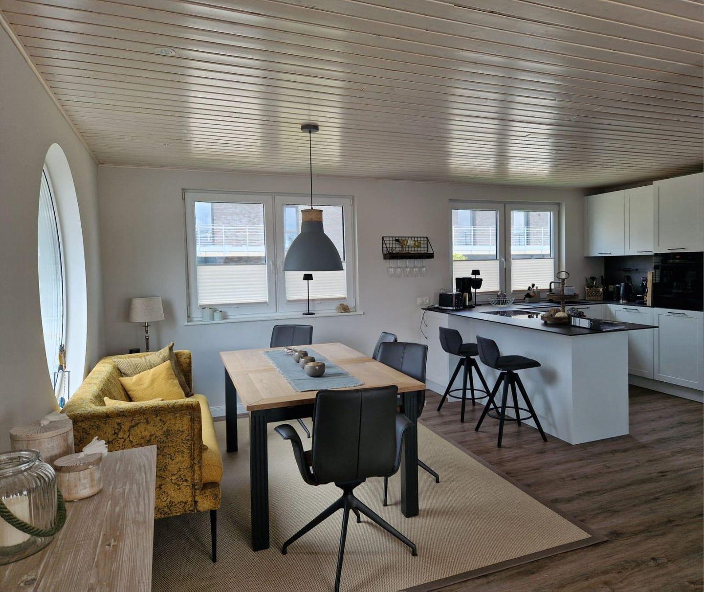 Der offen gestaltete Wohnbereich bildet das Zentrum des Hauses. Hier treffen Wohnen, Essen und Zusammensein aufeinander. Eine gemütliche Sitzecke lädt Dich zum Entspannen ein, sei es bei Gesprächen, einem Film oder einem ruhigen Abend nach einem Tag am Wasser. WLAN steht Dir im gesamten Haus zur Verfügung.