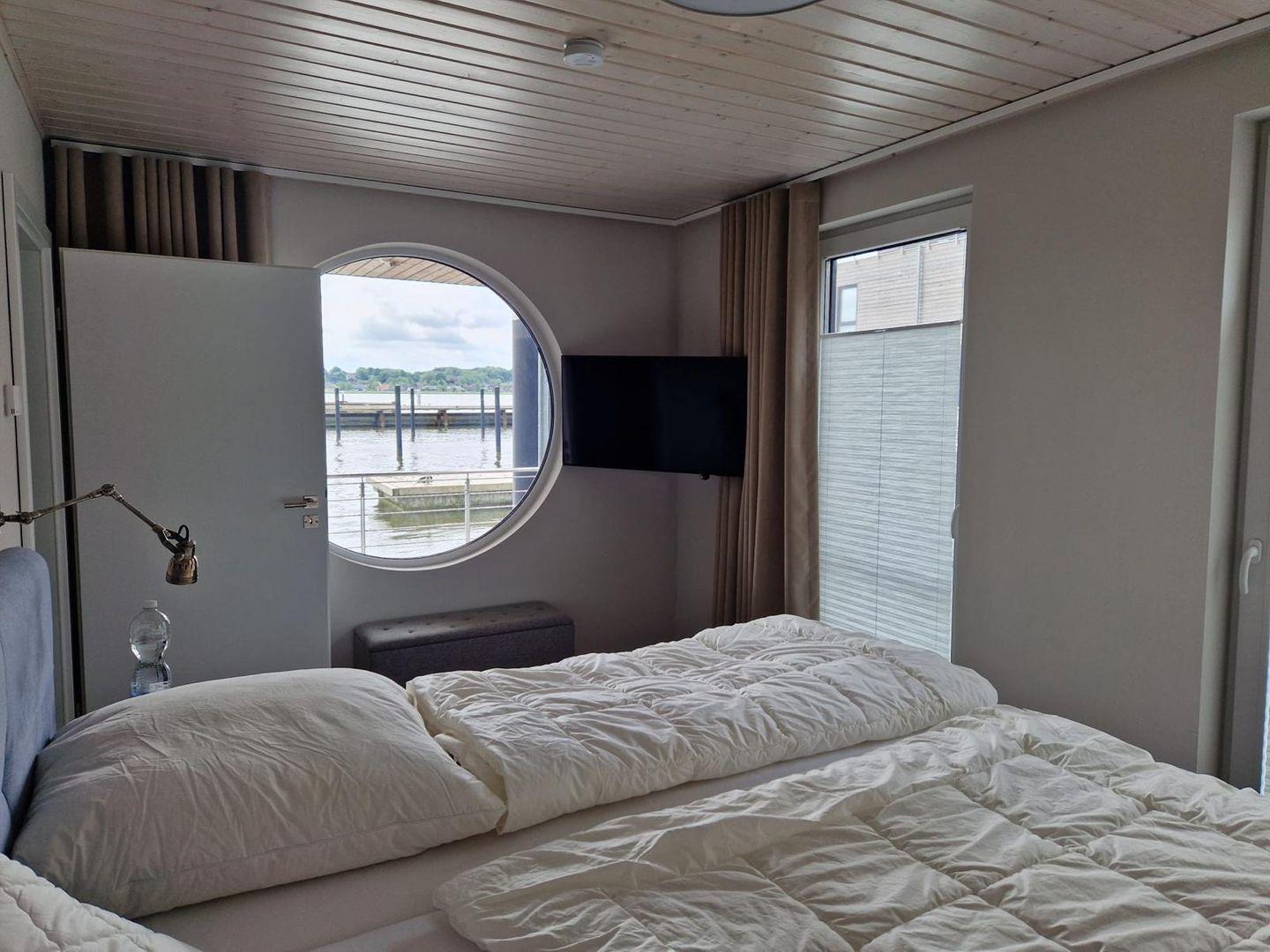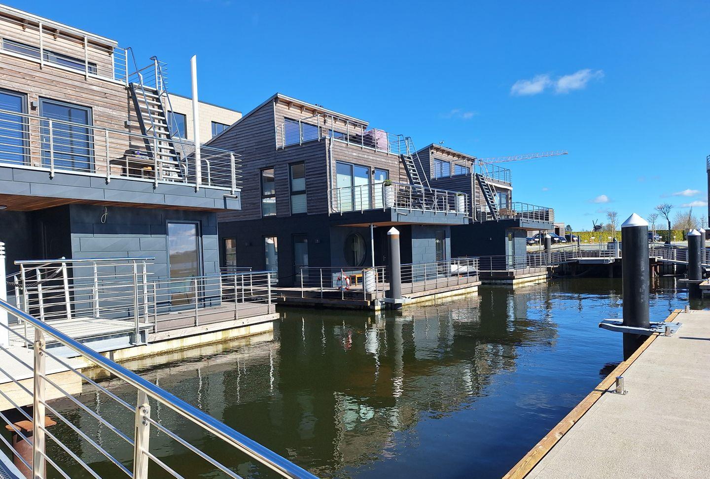 Freistehendes Wasserhaus im Pionierhafen Schleswig mit Terrasse, Seeblick und moderner Ausstattung für entspannte Stunden am Wasser.