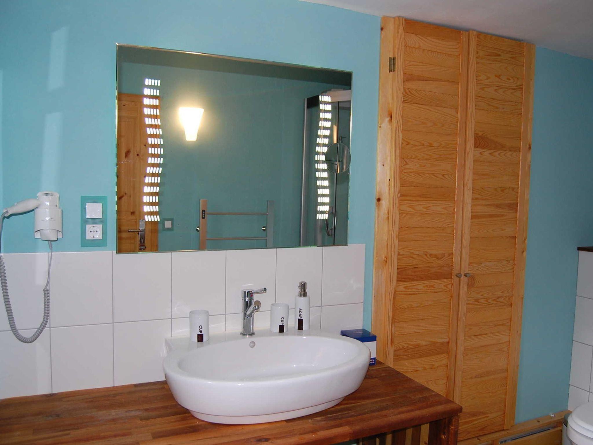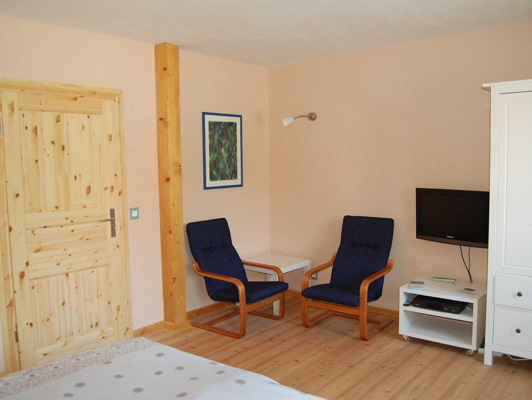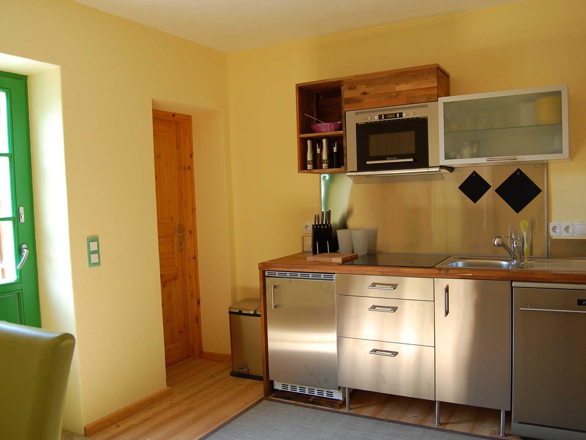 Die Ferienwohnung im Erdgeschoss ist knapp 50 m² groß und verfügt über ein Schlafzimmer, ein Esszimmer mit Küchenzeile, ein Duschbad sowie einen Wohnungsflur mit zusätzlicher Kleider- und Kofferablage. Zur geschmackvollen Ausstattung zählen eine Edelstahlküche mit Ceranfeld, Mikrowelle, Kühlschrank und Geschirrspüler, sowie allergikergeeignete Matratzen und Federbetten im Schlafraum. Das geräumige Bad ist mit Wellnessdusche, Handtuchtrockner, Hotelfön und beleuchtetem Großspiegel ausgestattet. Natürlich verfügt Ihr Appartement über Sat-LCD-TV, Stereoanlage, WLAN und Tresor. Die eigene Terrasse sowie der gemeinsame Grillplatz für lauschige Abende vervollständigen Ihren Urlaubstraum. Im Nebengelass steht Ihnen ein Hauswirtschaftsraum mit Gefrierschrank, Waschmaschine, Kondenstrockner und Bügelbrett zur Verfügung. Nach Absprache können Sie natürlich auch die vorhandenen Fahrräder für Tagestouren kostenfrei nutzen! Handtücher und Bettwäsche sind inklusive, ein Komfort-Service“, also eine Zwischenreinigung alle 3-4 Tage ist gegen Aufpreis möglich. Gegen Aufpreis können wir Ihnen auch ausgewählte Bio- bzw. Selbsterzeuger-Produkte aus der Region besorgen.
