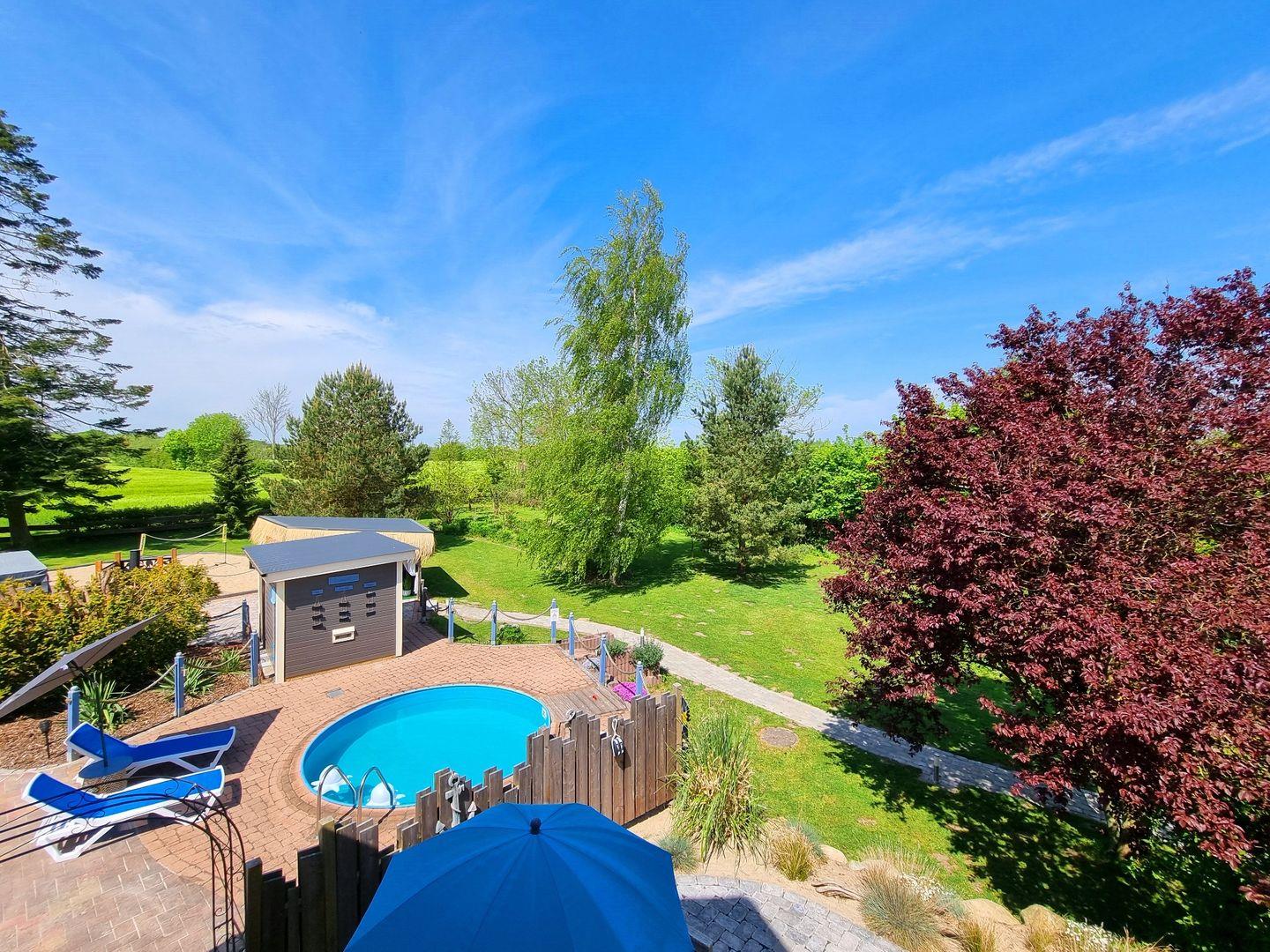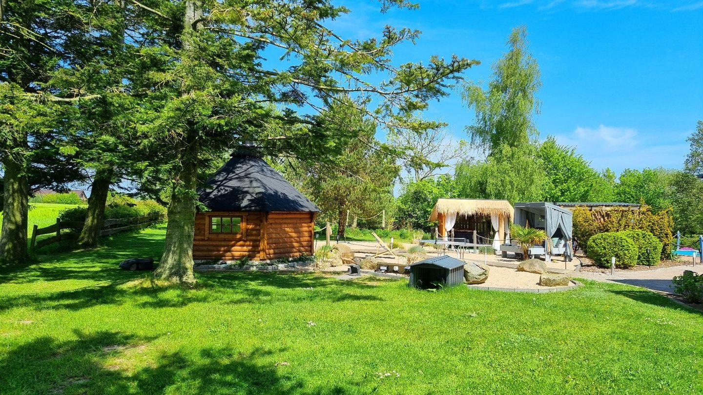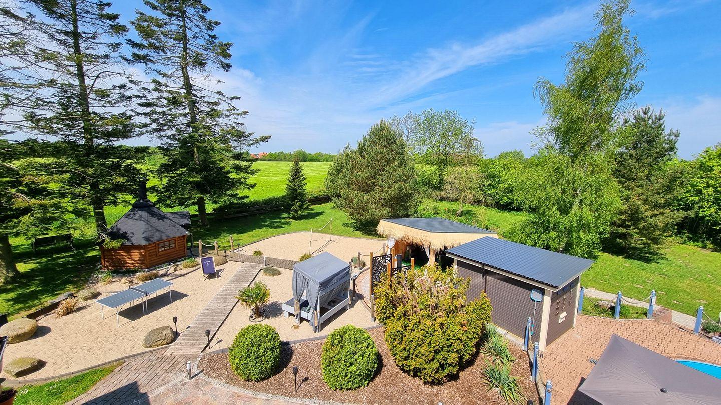 Der große Garten ist mit über 1000qm ein grünes Paradies. Für Erfrischung sorgt der Rundpool, für Wärme und Entspannung die Sauna mit zugehöriger Außendusche. Sollte es einmal regnerisch sein, oder wenn ihr es einfach nur gemütlich mögt, steht eine Grillkota als Mittelpunkt zwischen eigens angelegten Sandgärten bereit. Für Aktive Gäste gibt es einen Sandplatz mit Netz zum Volleyball und Badminton spielen, eine Tischtennisplatte und zusätzlich eine Outdoor-Dartscheibe. Über das gesamte Areal sind mehrere Sitzecken mit und ohne Sonnenschirme verteilt. Auch abends sorgt die Ausrichtung nach Westen für die schönsten Sonnenuntergänge über die Weiten der Felder. Dazu lässt sich stimmungsvolle Beleuchtung einschalten.