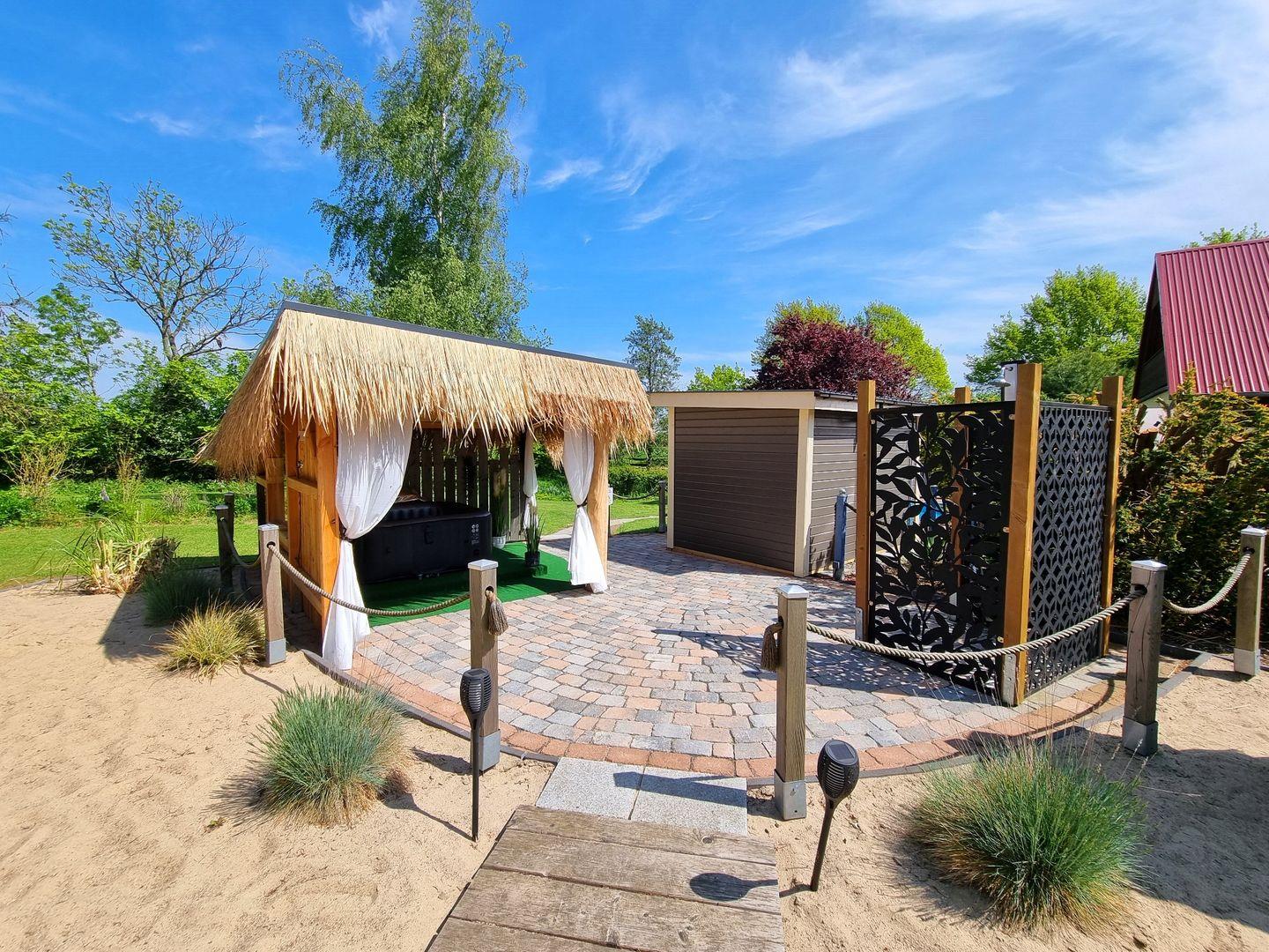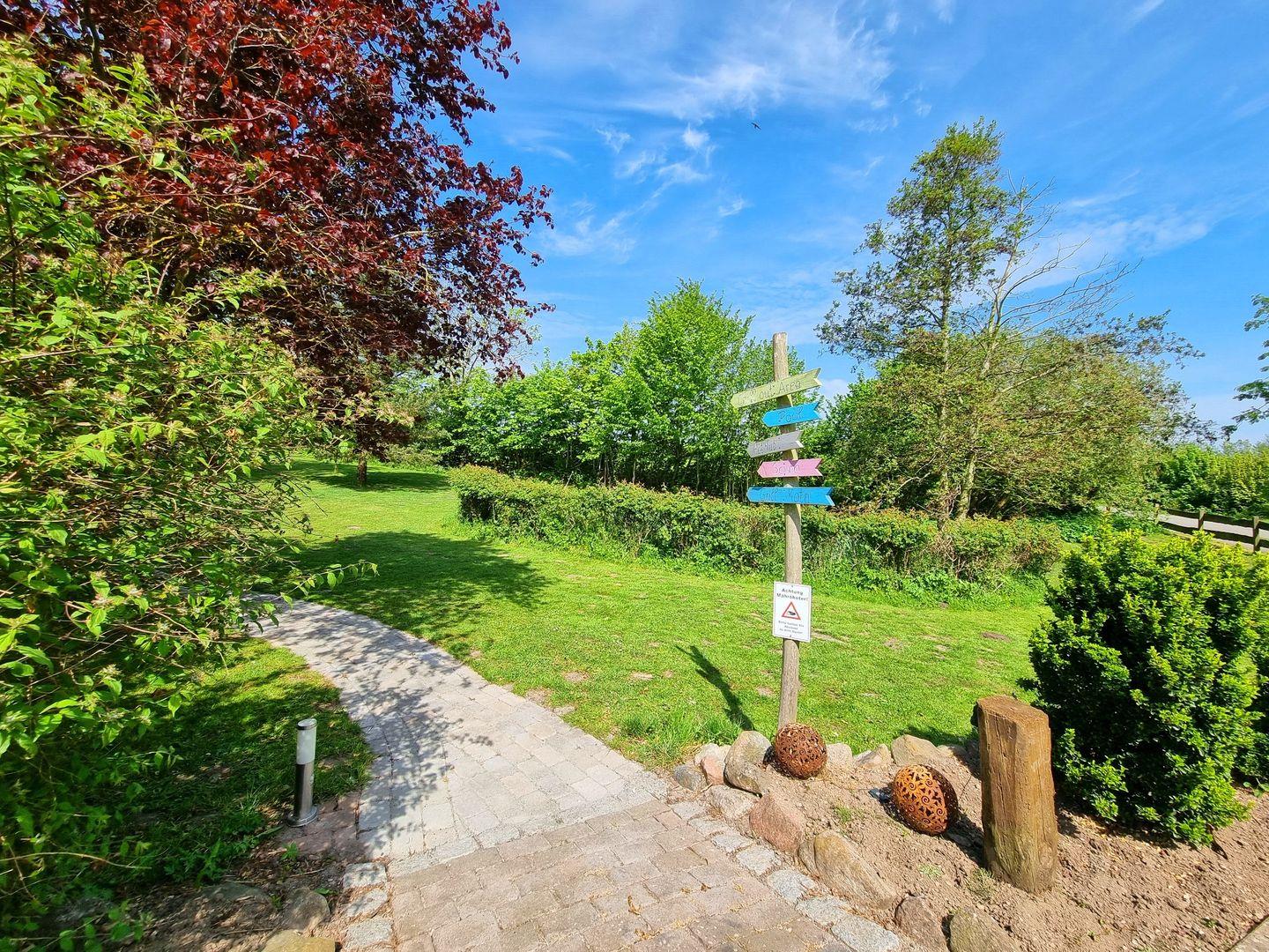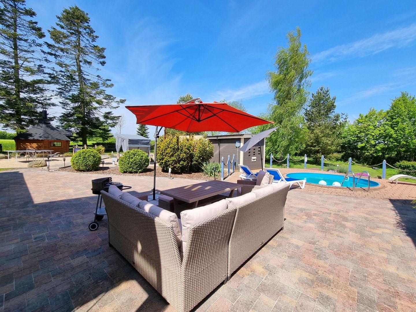 Der große Garten ist mit über 1000qm ein grünes Paradies. Für Erfrischung sorgt der Rundpool, für Wärme und Entspannung die Sauna mit zugehöriger Außendusche. Sollte es einmal regnerisch sein, oder wenn ihr es einfach nur gemütlich mögt, steht eine Grillkota als Mittelpunkt zwischen eigens angelegten Sandgärten bereit. Für Aktive Gäste gibt es einen Sandplatz mit Netz zum Volleyball und Badminton spielen, eine Tischtennisplatte und zusätzlich eine Outdoor-Dartscheibe. Über das gesamte Areal sind mehrere Sitzecken mit und ohne Sonnenschirme verteilt. Auch abends sorgt die Ausrichtung nach Westen für die schönsten Sonnenuntergänge über die Weiten der Felder. Dazu lässt sich stimmungsvolle Beleuchtung einschalten.