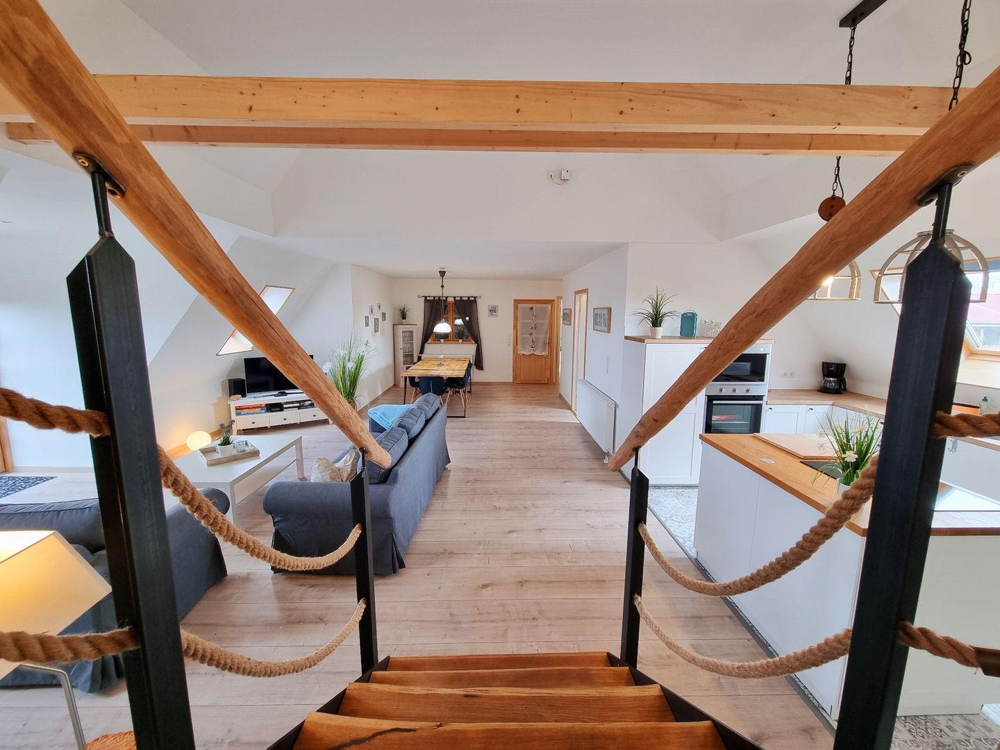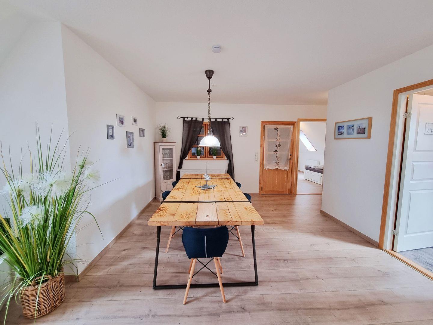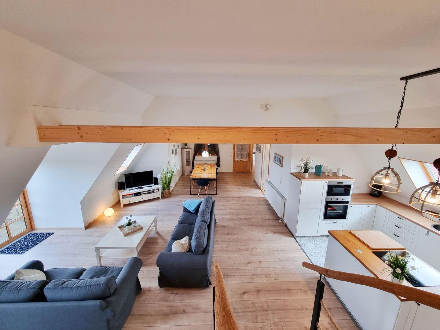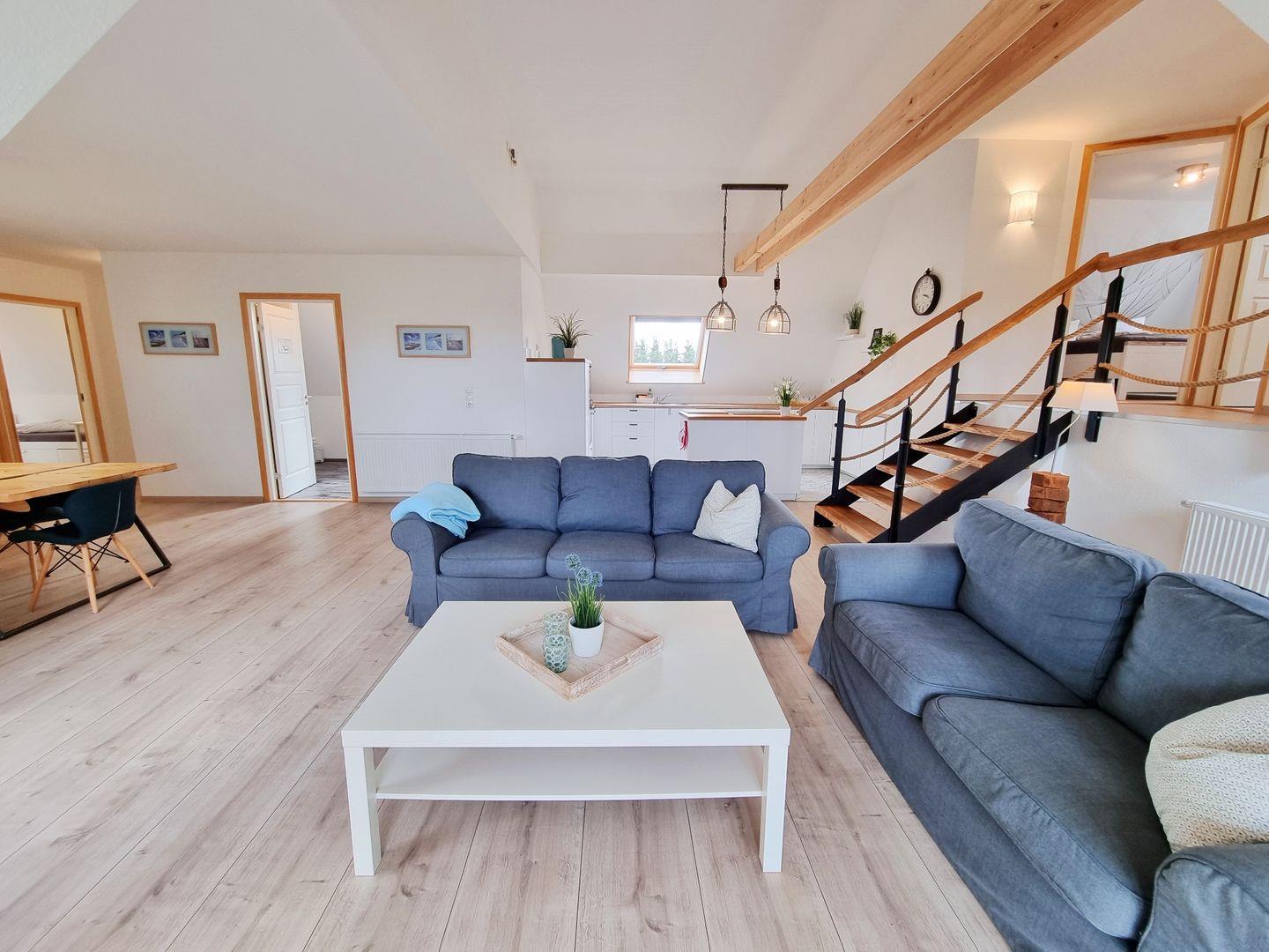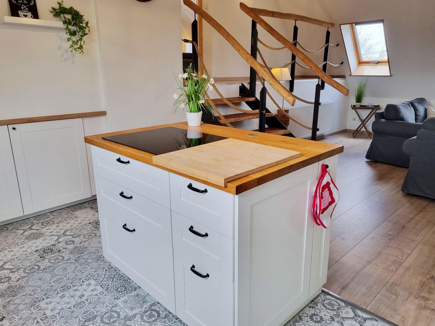 Die helle Ferienwohnung Feldkieker verfügt über einen großen, schönen Wohnbereich mit offener Landhausküche nebst Kochinsel, einem Echtholz-Esstisch mit 6 Stühlen und einer Sofaecke mit Ausgang zum Balkon, von dem ihr bei gutem Wetter sogar einen Fernblick auf die Ostsee erhaschen könnt. Daneben stehen euch 3 Schlafzimmer für insgesamt max. 6 Personen zur Verfügung, davon sind 2 Doppelbettzimmer (160x200cm und 180x200cm) mit Fernseher, und ein Zweibettzimmer. Aus dem Wohnbereich gelangt ihr zum großzügigen Duschbad mit Fön, das durch das Fenster ebenfalls über Tageslicht verfügt. Ein wohlerzogener Hund ist herzlich Willkommen.