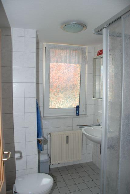 Das Badezimmer mit Fenster verfügt über eine Dusche, einen Waschtisch und ein WC.