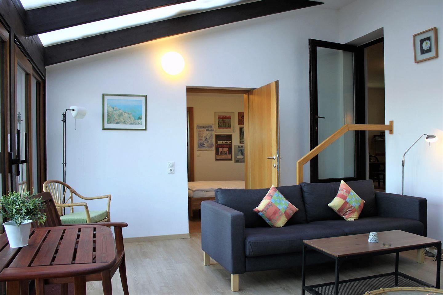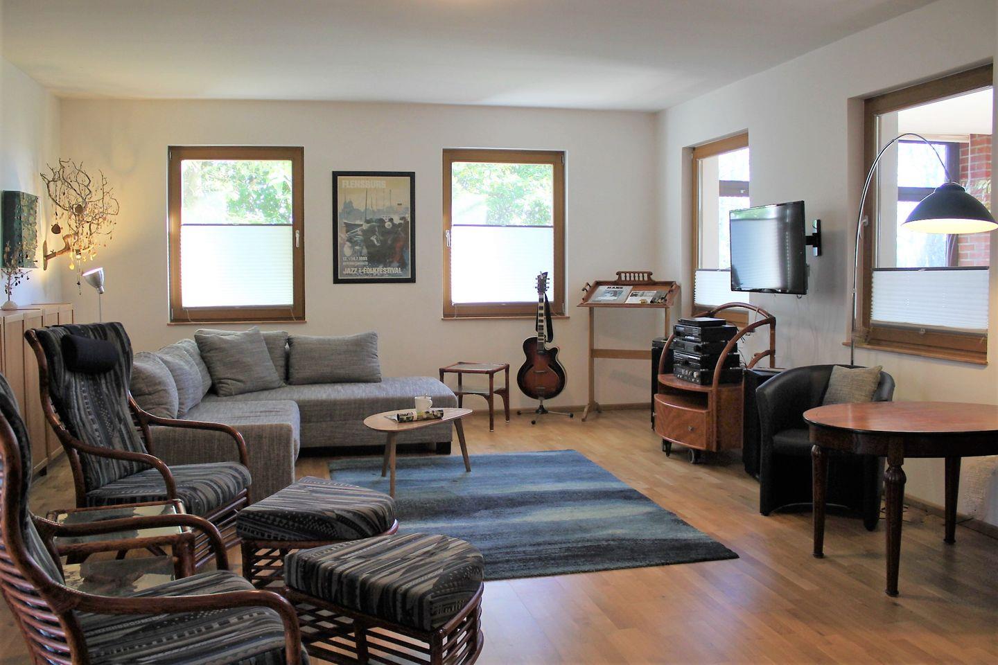Das großzügige Wohnzimmer mit großem Sofa, TV-Gerät, Musikanlage und WLAN lädt zum gemeinsamen Spielen und Entspannen für die ganze Familie ein.