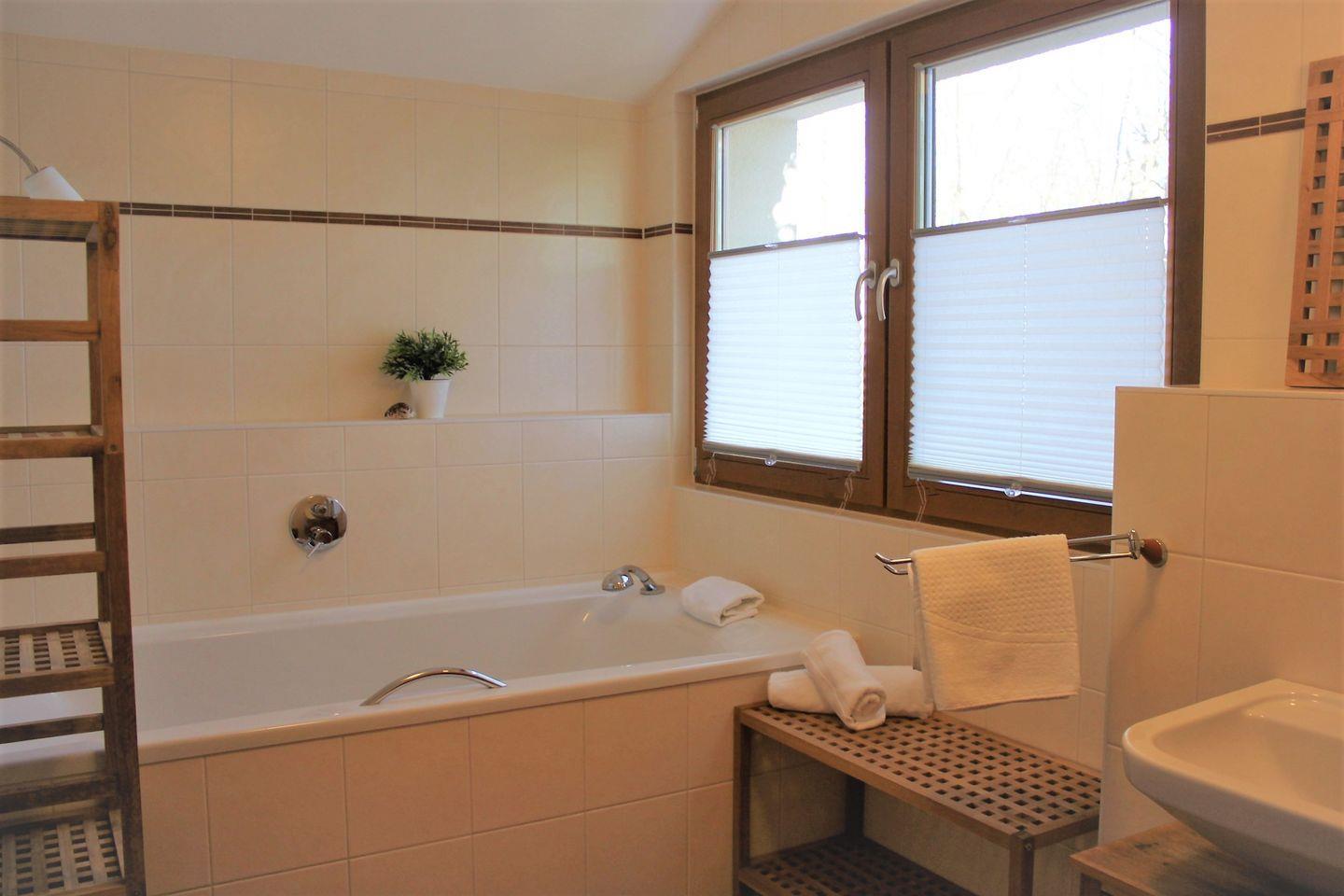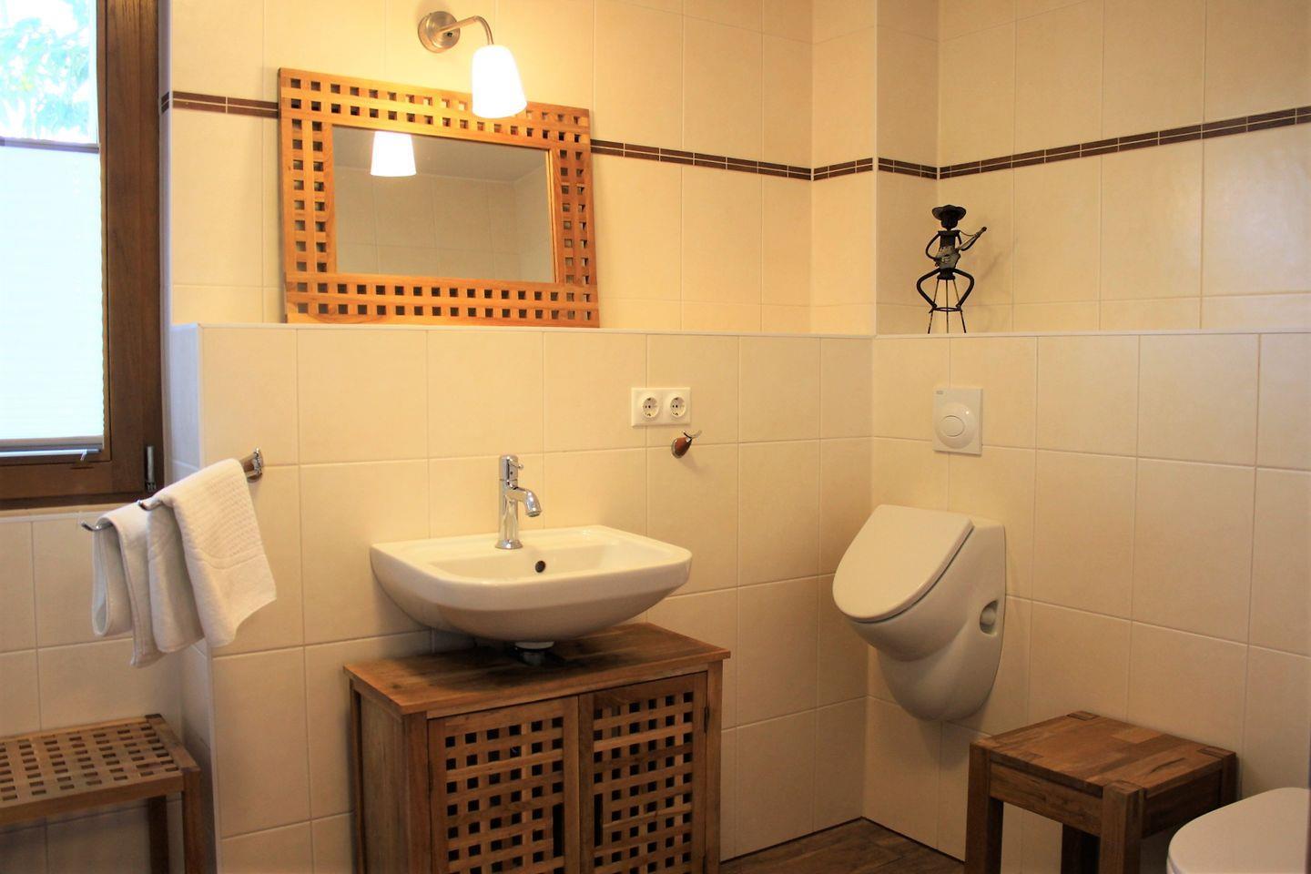 Das Haus bietet Ihnen zudem zwei moderne Bäder. Einmal mit Badewanne, Waschtisch, WC und Urinal und das Zweite mit Dusche, Bidet, WC und Waschtisch.