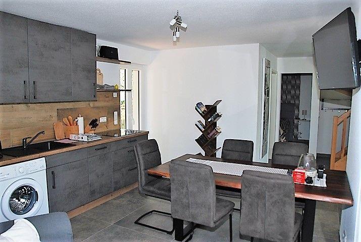 Der helle Wohn- und Essbereich ist stilvoll mit einer komfortablen Sofaecke mit TV-Gerät, Wlan und einem Esstisch möbliert. Die Küche ist ebenfalls in den Raum integriert und bietet viele technische Geräte für eine entspannte Selbstversorgung. Dazu gehören z.B. ein Kühlschrank mit Gefrierfach, ein Herd mit Backofen, Geschirrspülmaschine, Wasserkocher, Kaffeemaschine und vieles mehr.