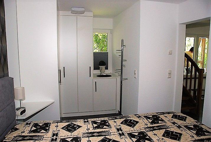 Im Erdgeschoss des Hauses befinden sich außerdem ein Schlafzimmer, dass mit einem bequemen Doppelbett (mit durchgehenden Matratzen) , TV-Gerät und viel Stauraum für Ihre Kleidung möbliert ist und ein Badezimmer mit Dusche, Waschtisch und WC.